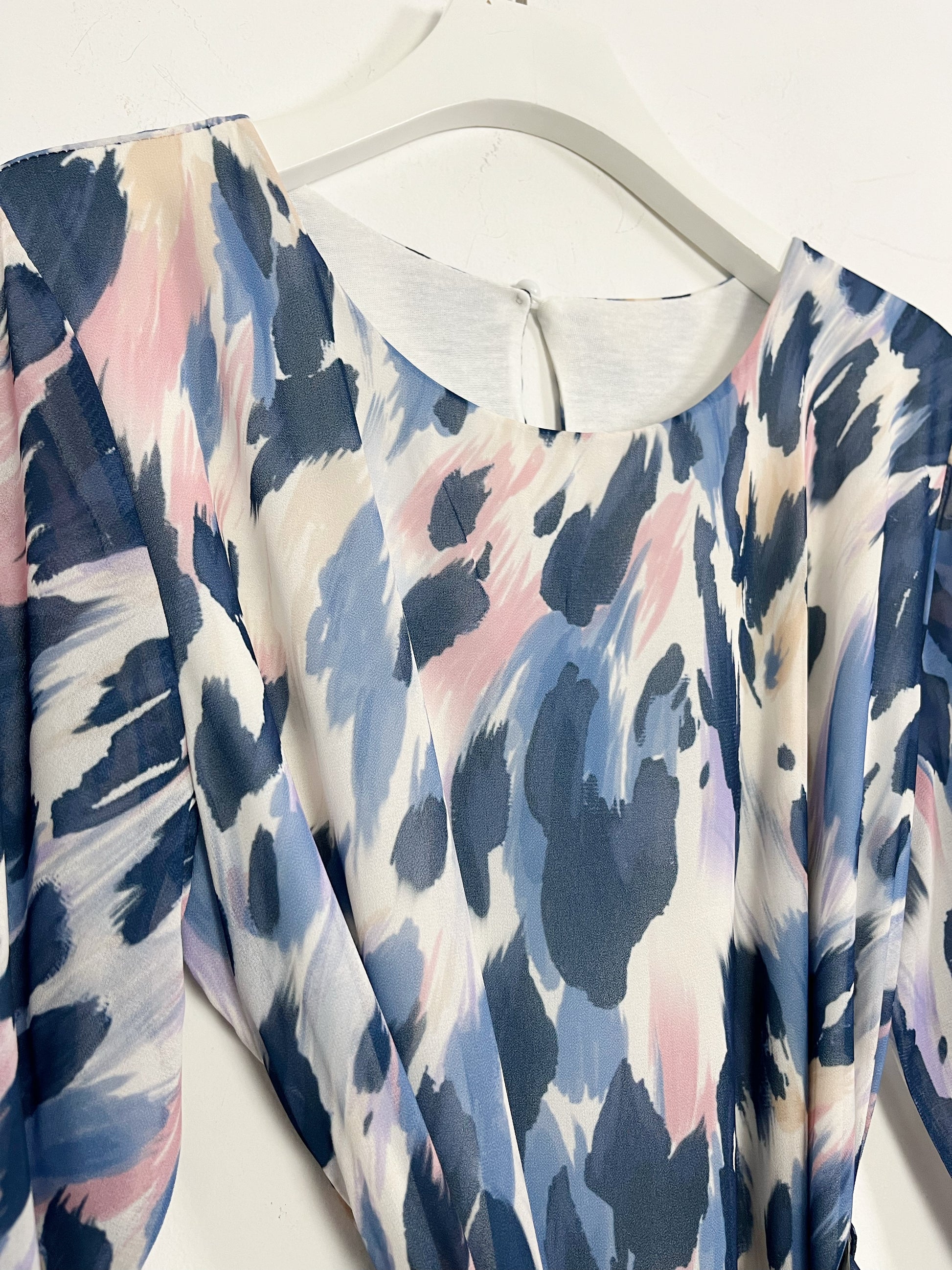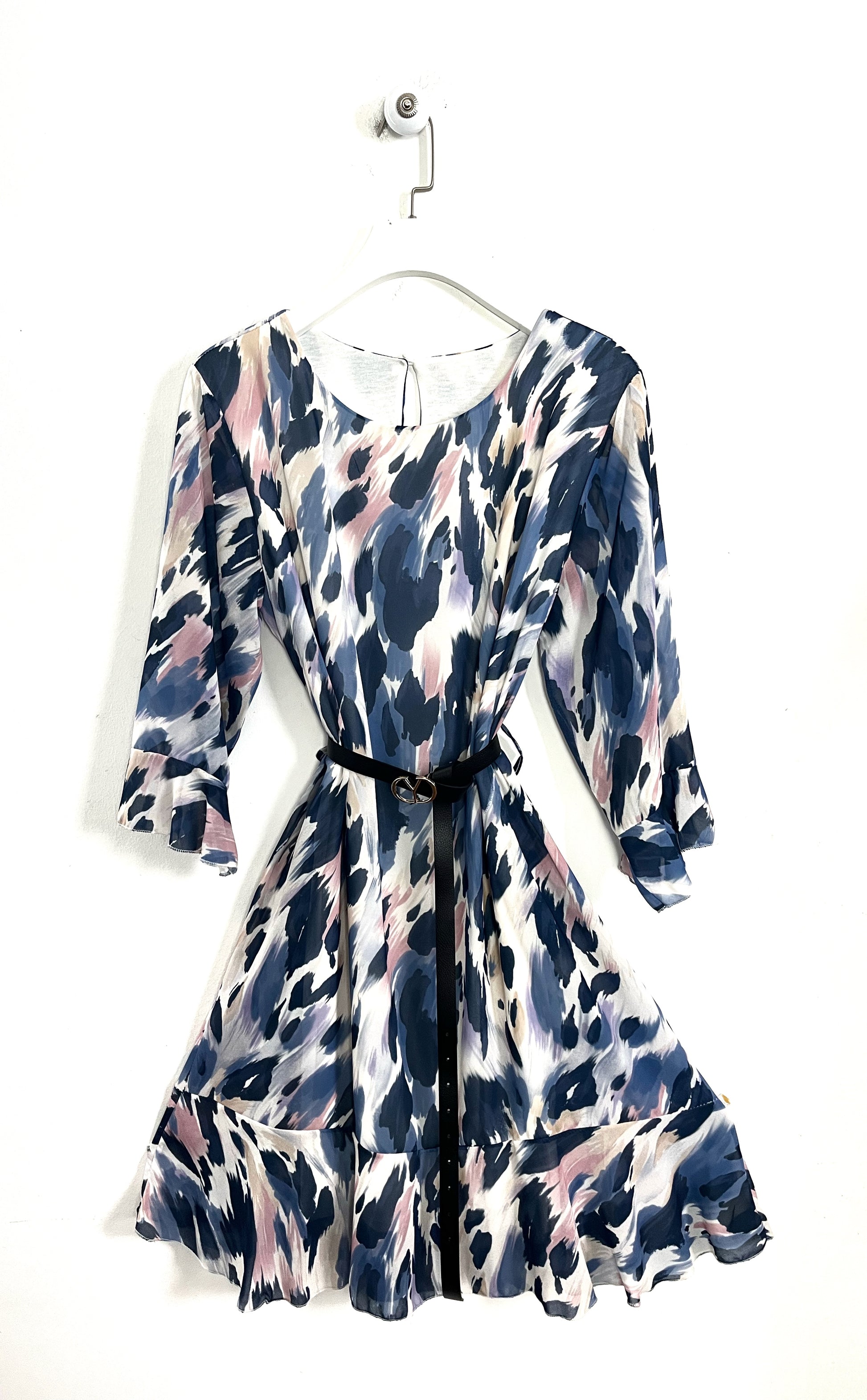 Abito in voile, taglio dritto. Maniche a campana tre quarti. Girocollo, chiuso da un bottoncino sulla schiena. Foderato.