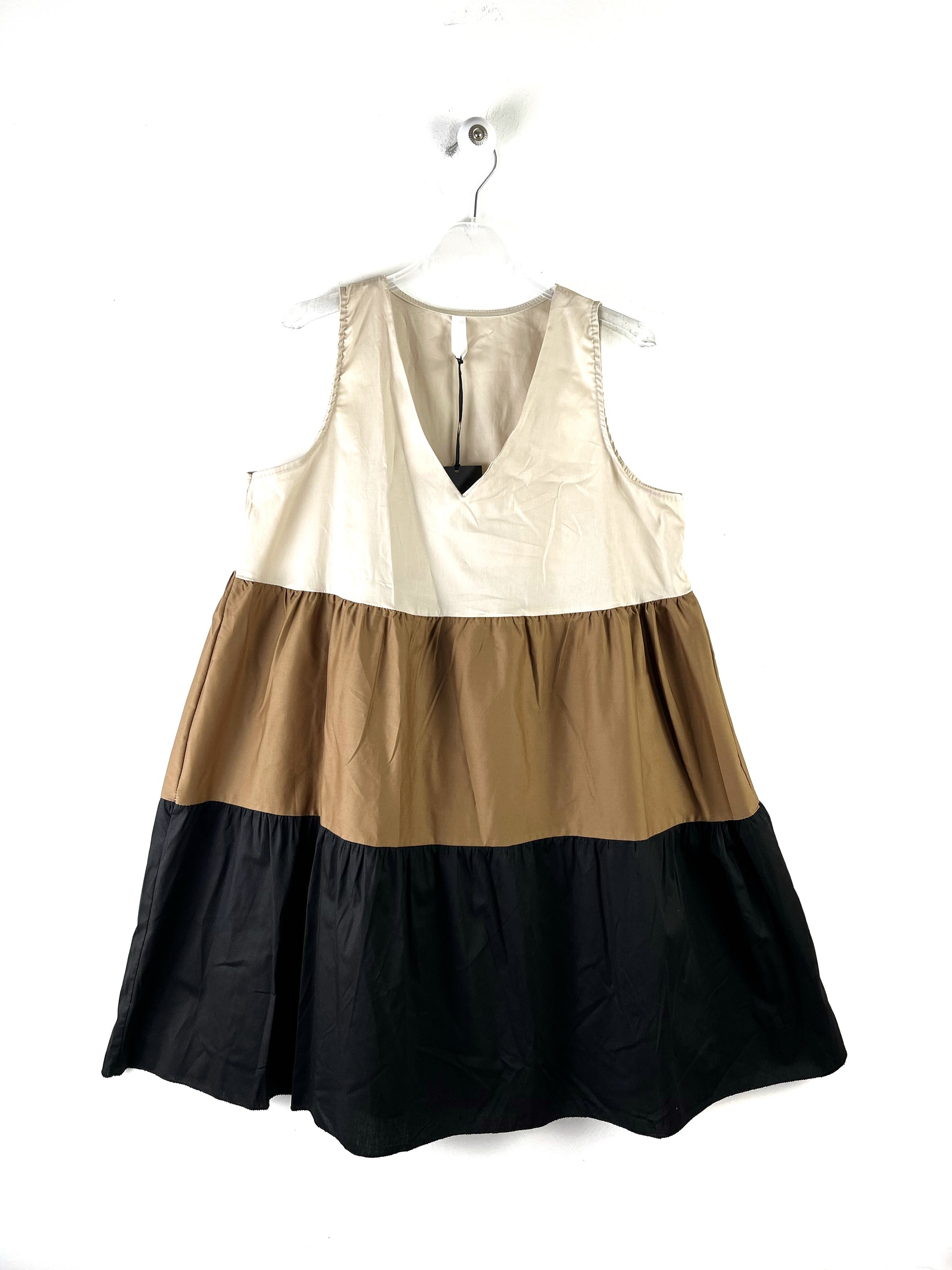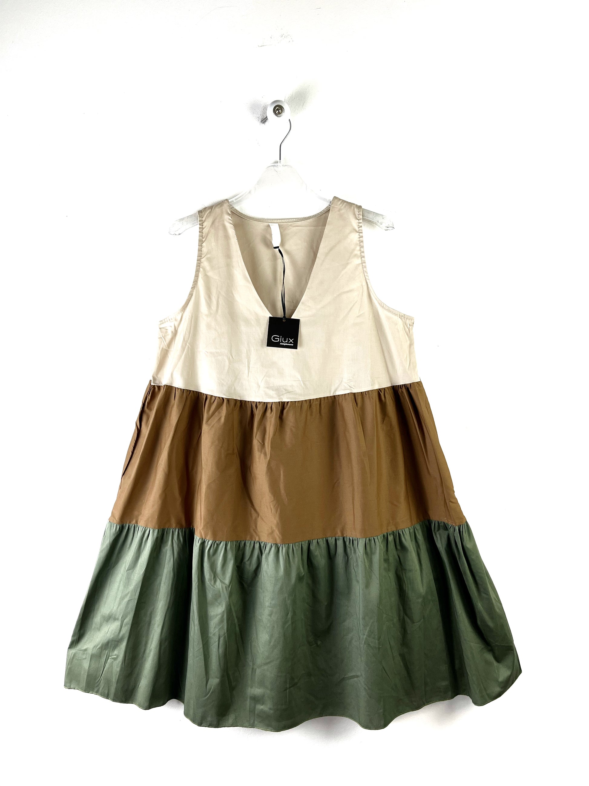 Abito smabicato, scollatura a V. Gonna a balze svasata. Sfoderato