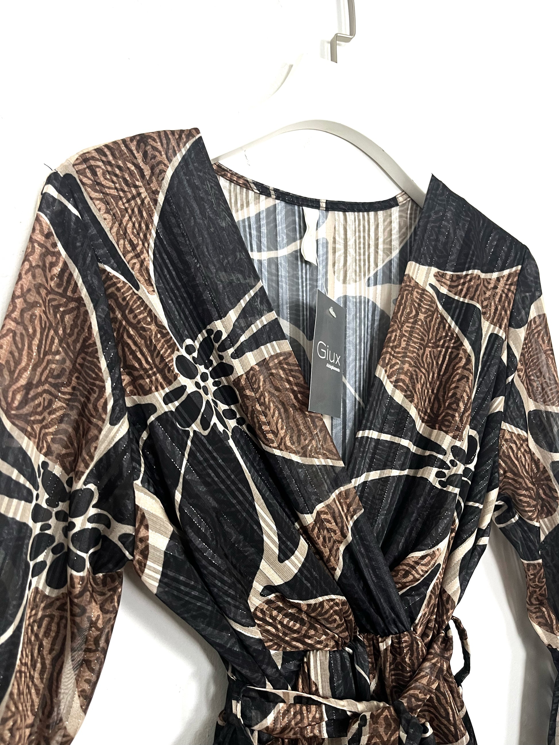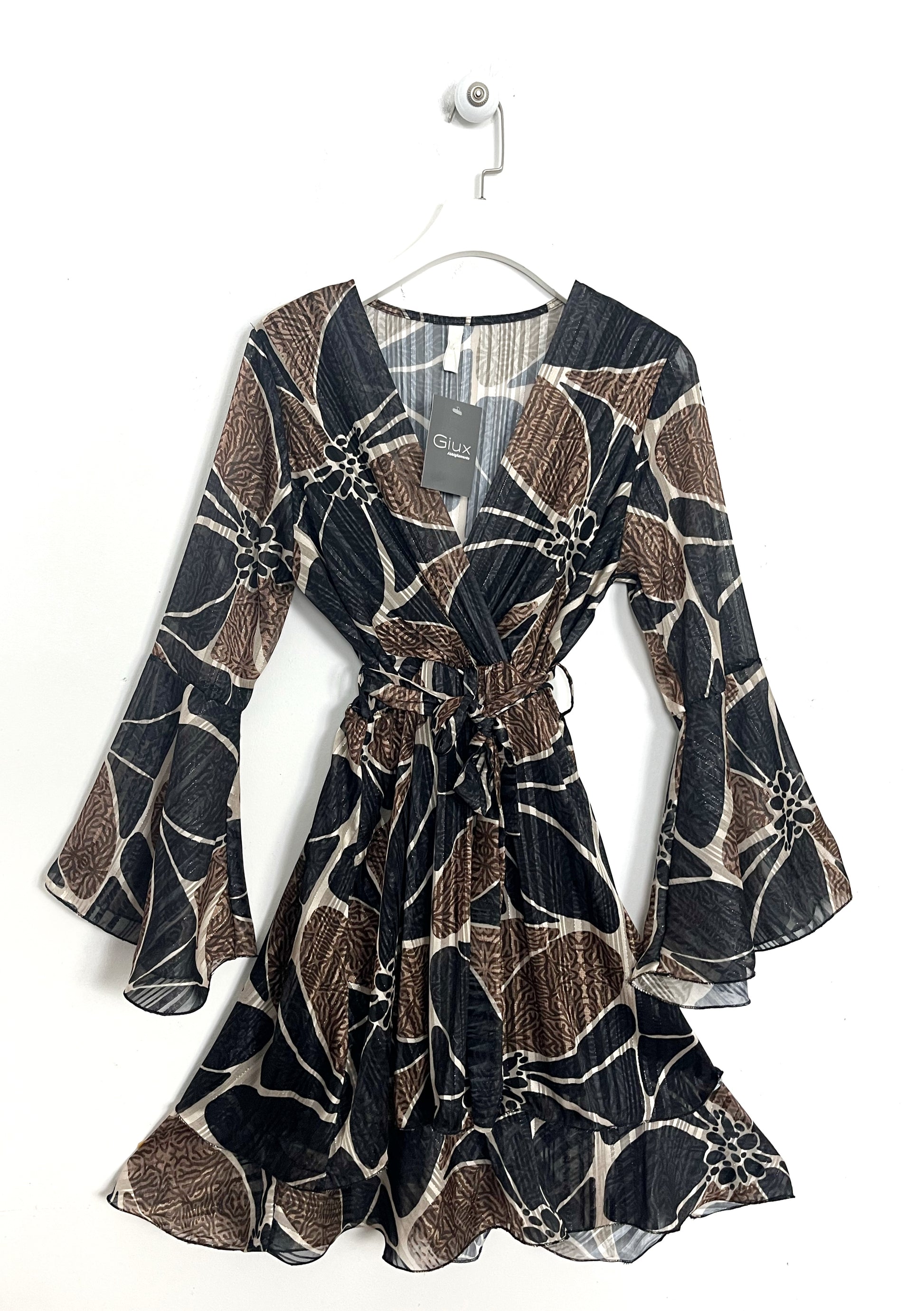 Abito in voile, corto con balza. Maniche lunghe a campana. Scollatura a V incrociata, arricciatura sotto il seno. Passanti con cintura in tessuto. Gonna svasata. Lunghezza sopra al ginocchio. Foderato.