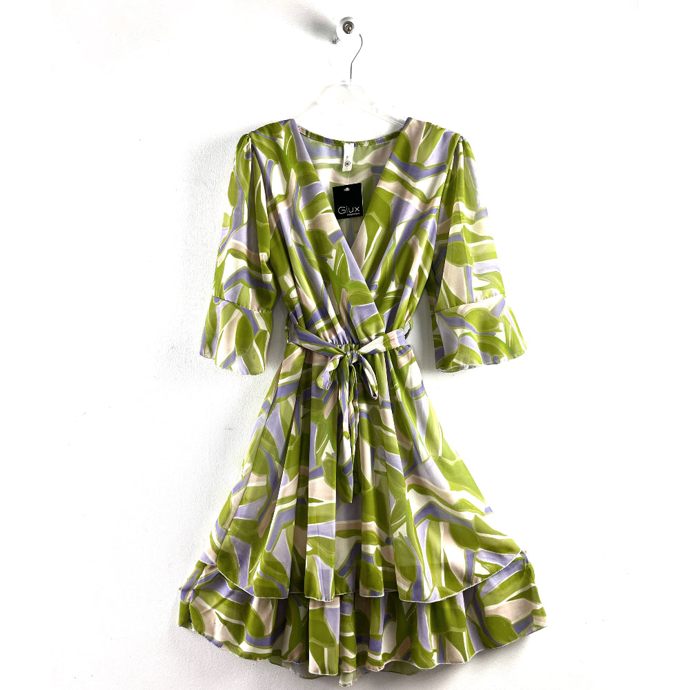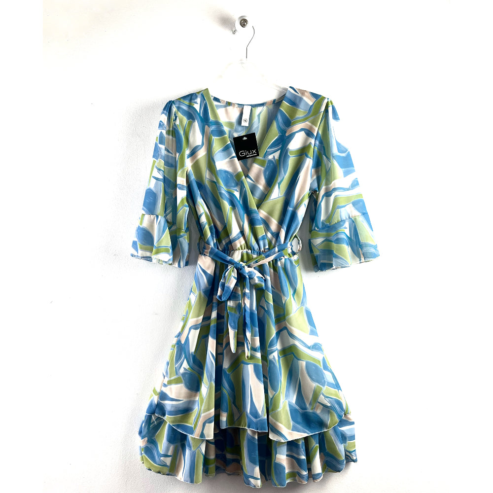 Abito in voille, corto con balza. Maniche tre quarti svasate. Scollatura incrociata sfoderata, arricciatura sotto il seno. Passanti con cintura in tessuto. Gonna svasata effetto doppio strato foderata.