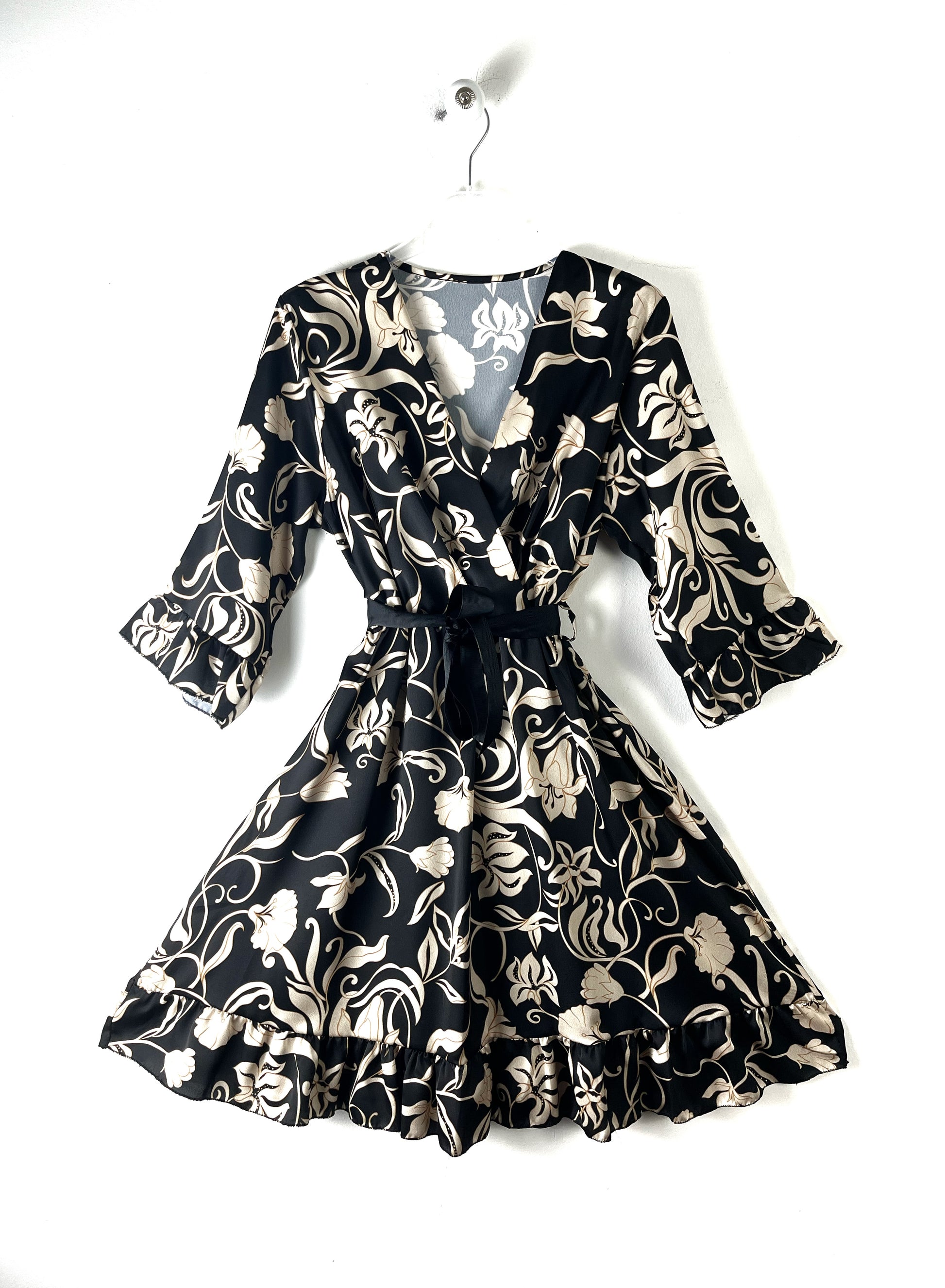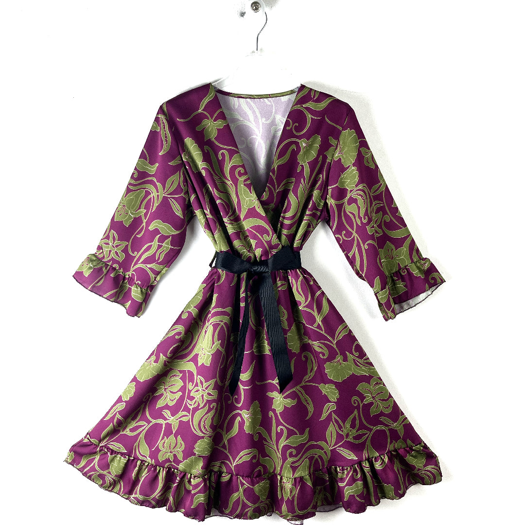 Abito in raso, corto con balza. Maniche 3/4. Scollatura incrociata, arricciatura sotto il seno. Passanti con cintura. Gonna svasata. Sfoderato.