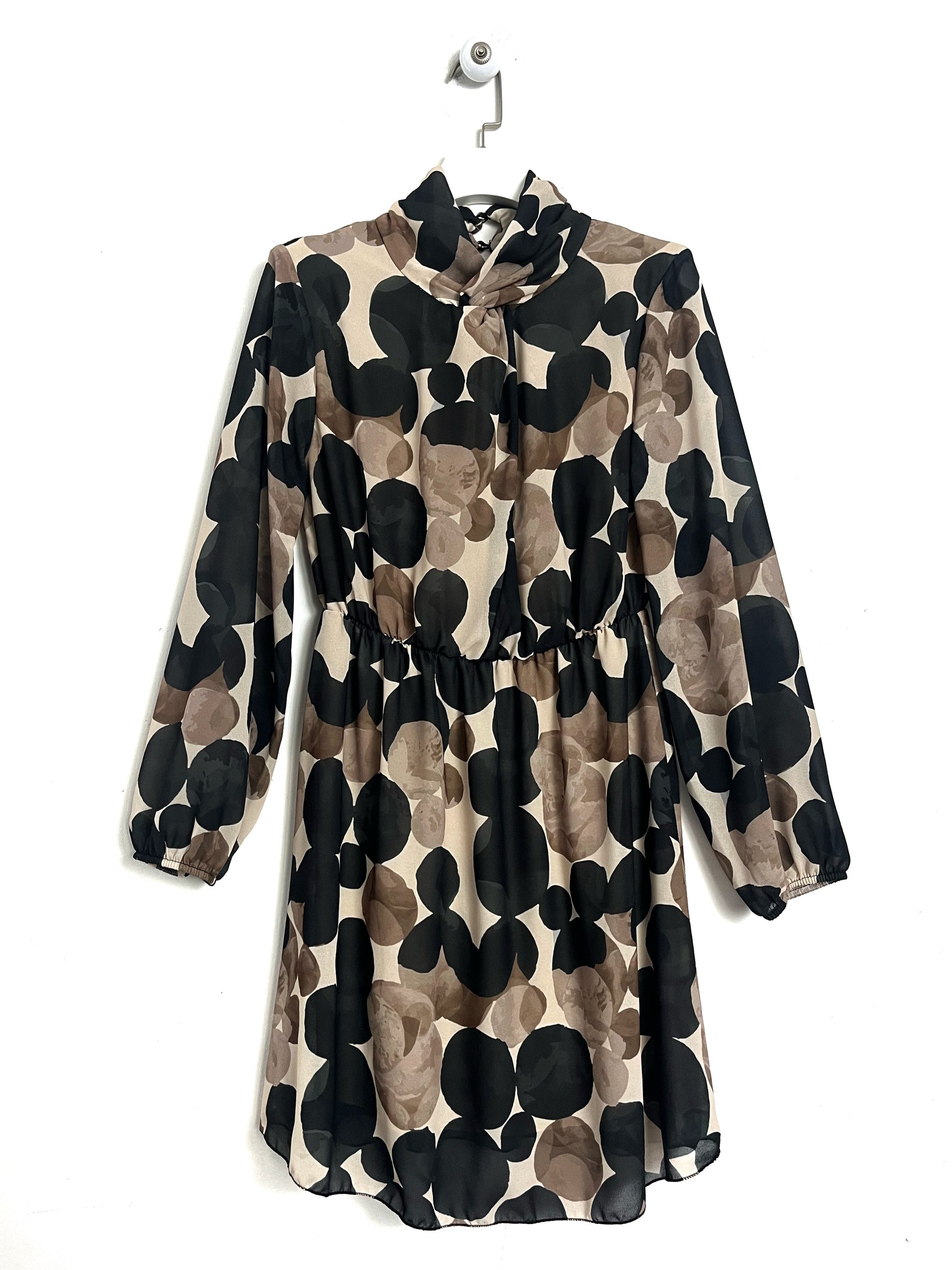 Abito in voile. Maniche lunghe, colletto a coreana. Elastico arricciato un vita. Gonna leggermente svasata. Lunghezza sopra al ginocchio. Foderato.