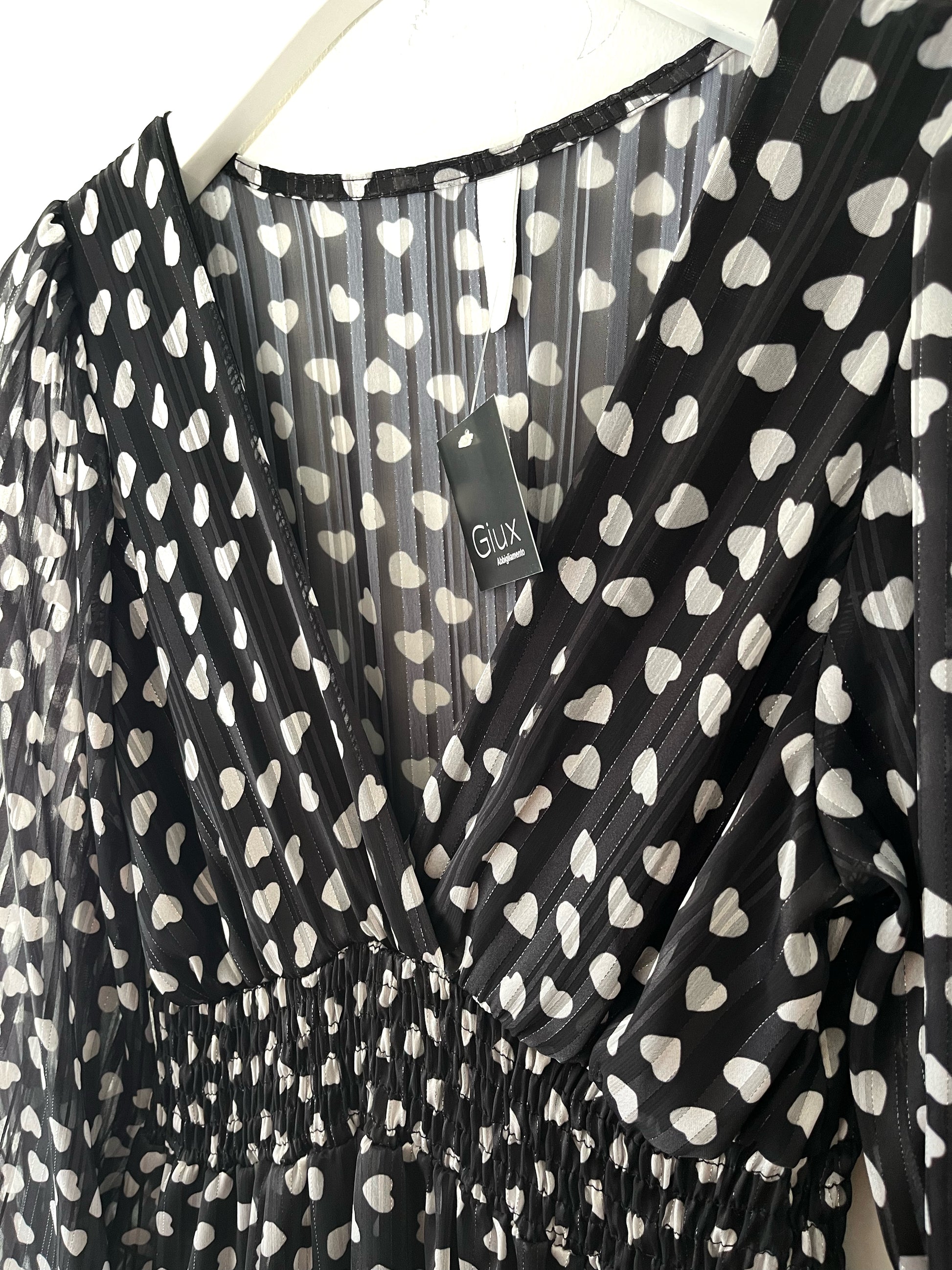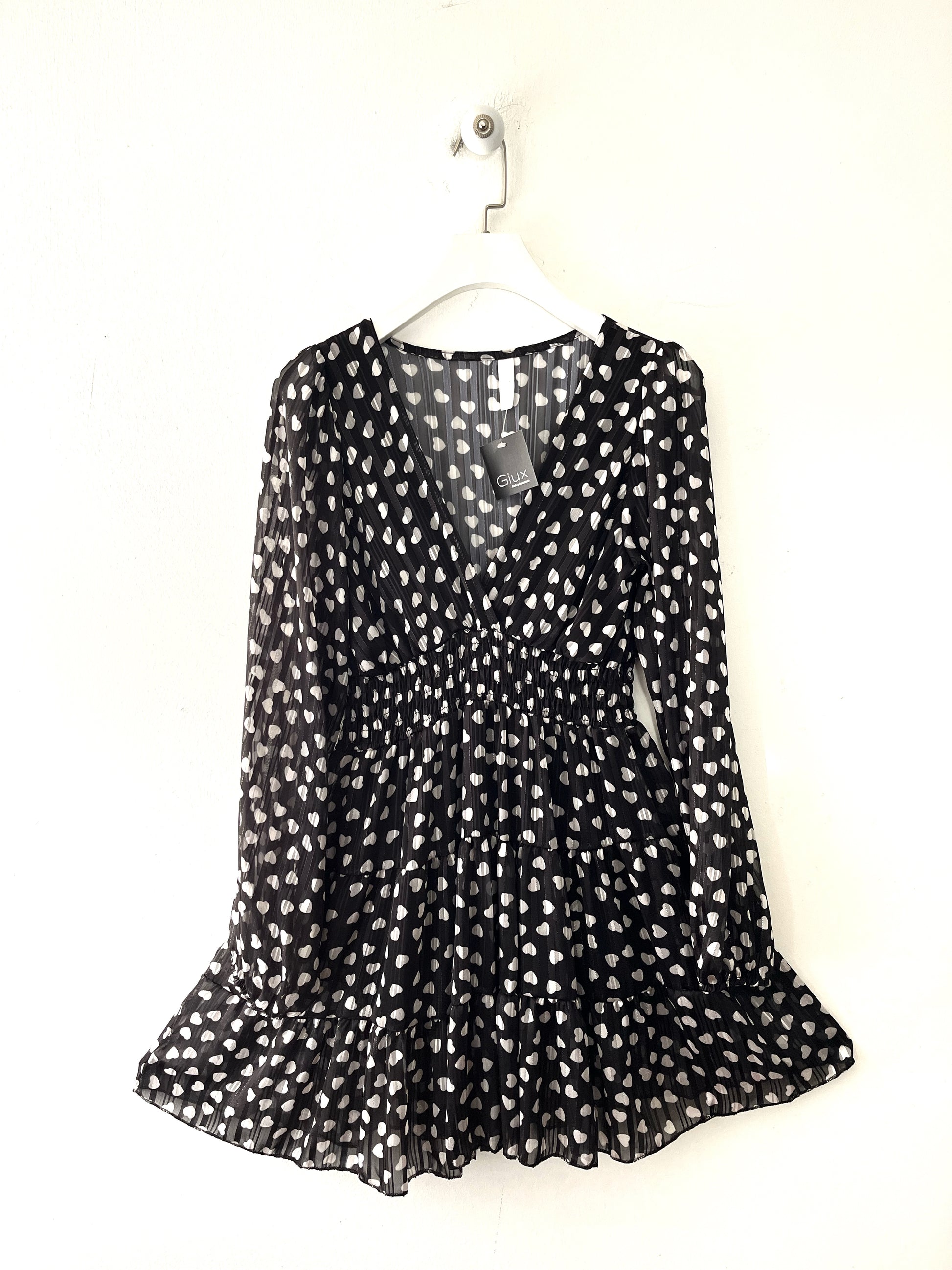 Abito in voille, corto con balze. Maniche lunghe con elastico in fondo. Scollatura incrociata, arricciatura sotto il seno. Gonna svasata. Lunghezza sopra il ginocchio. Foderato