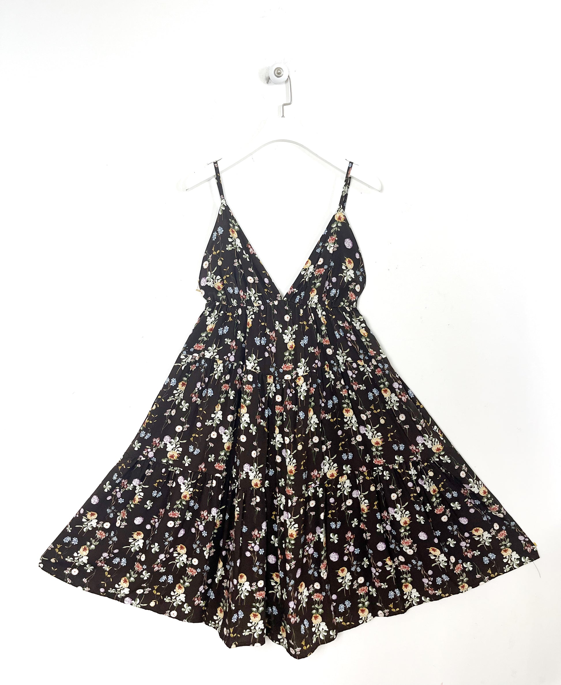 Abito in viscosa con spalline sottili. Scollatura a bikini, arricciato sotto il seno. Balza in fondo alla gonna svasata. Lunghezza sopra il ginocchio.