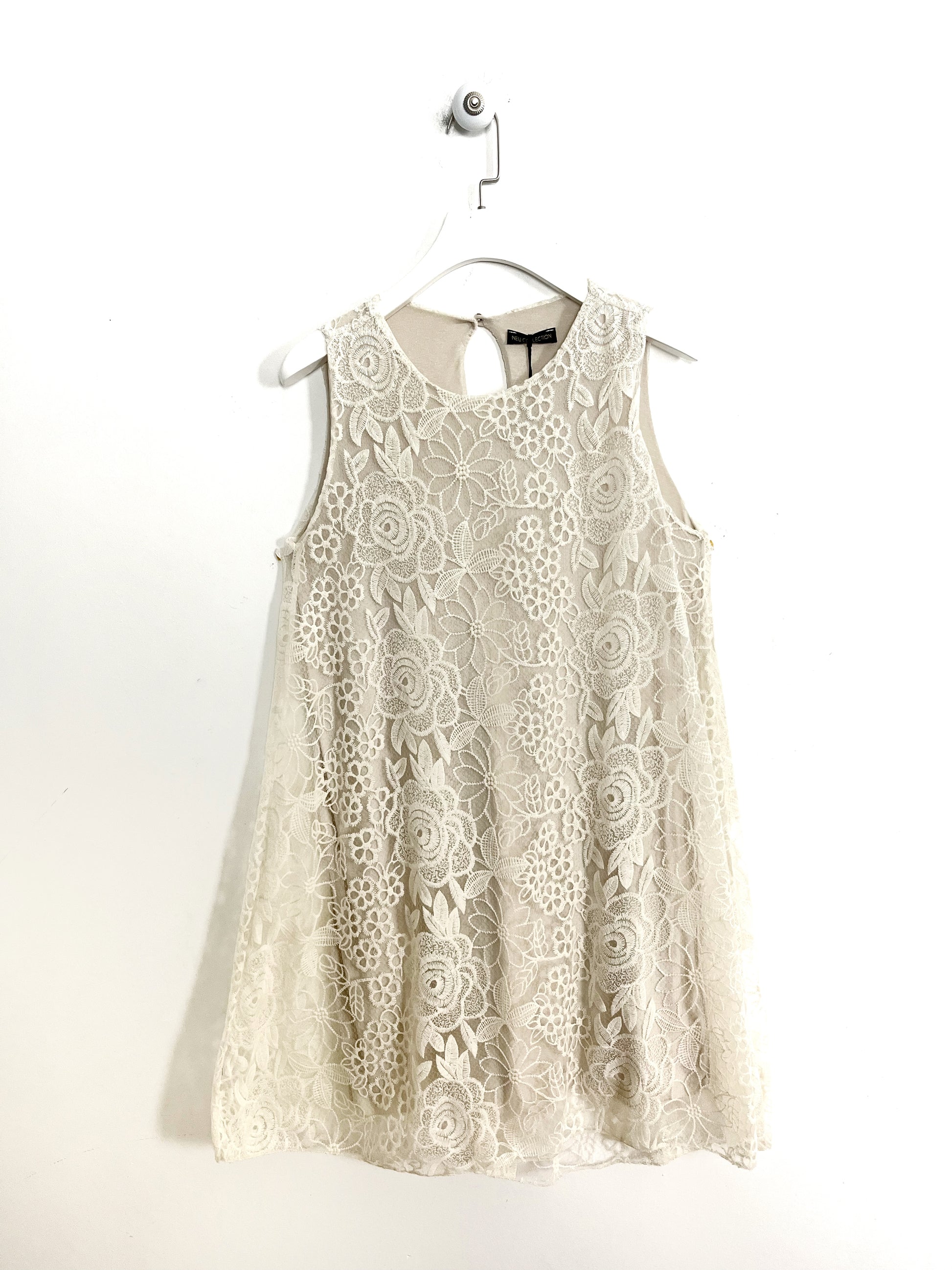 Abito in tulle trasparente con ricami, smanicato. Foderato.