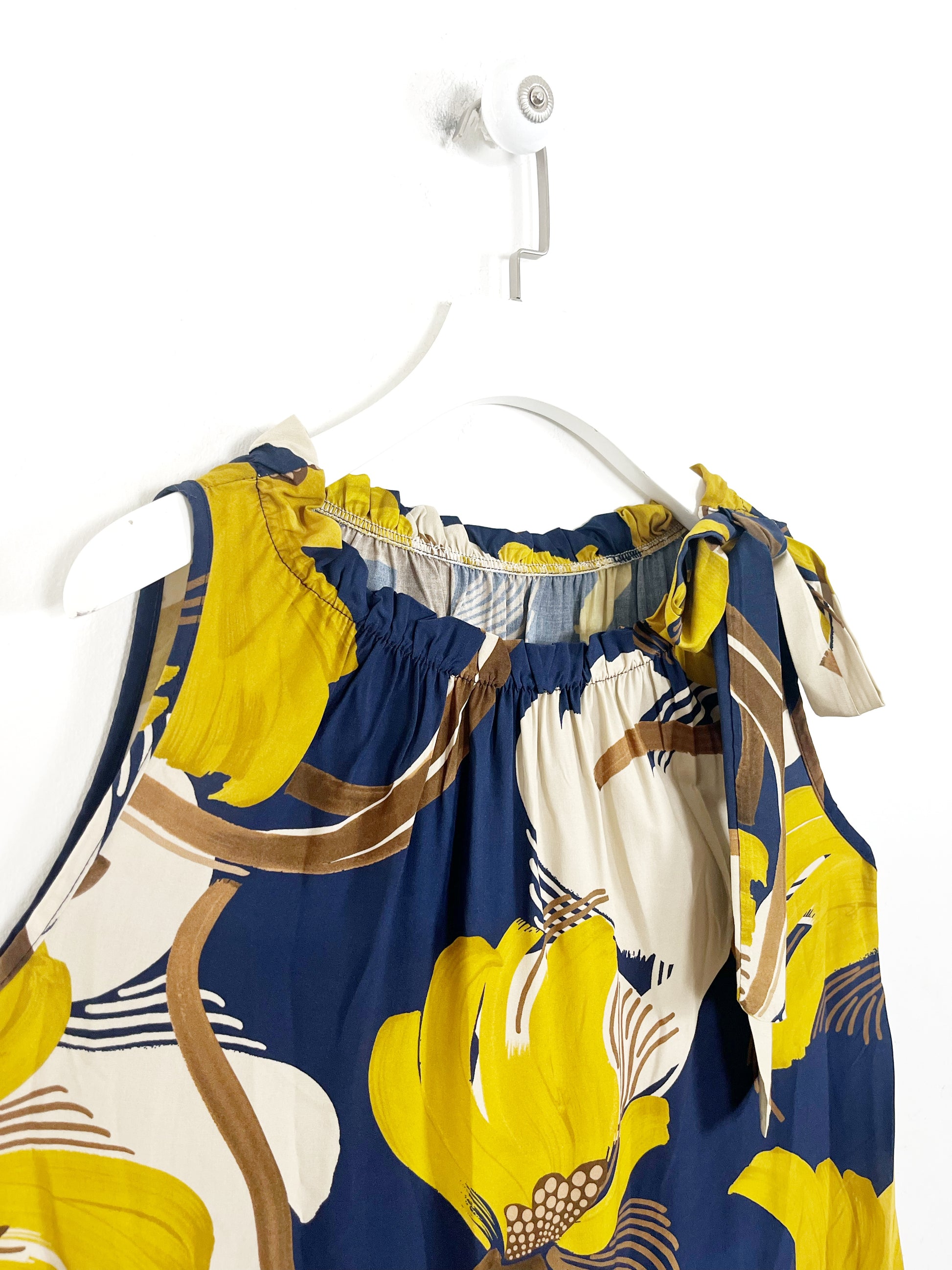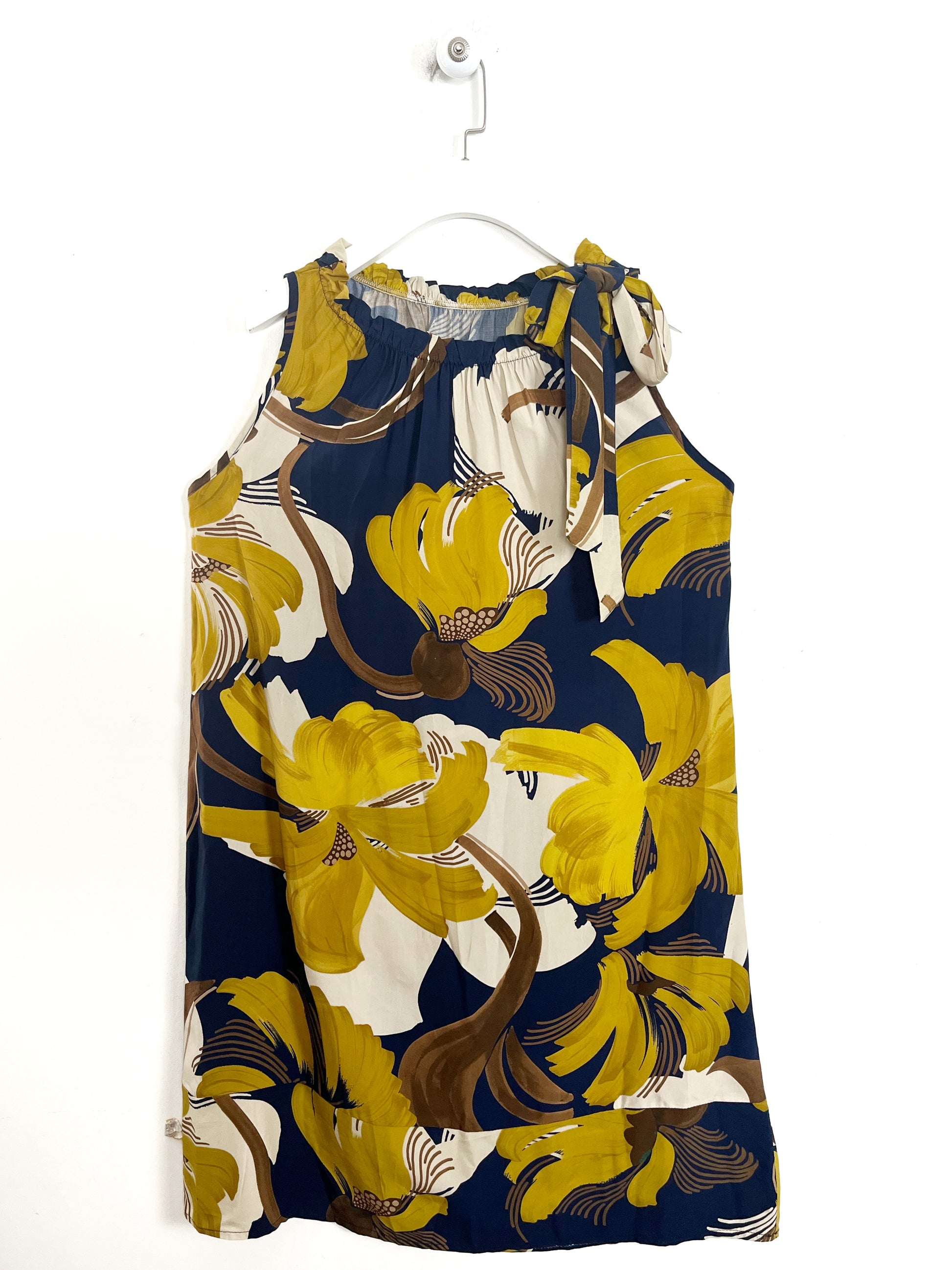 Abito girocollo plissettato, con chiusura a fiocco dietro il collo. Smanicato, lunghezza svasata al ginocchio. Sfoderato