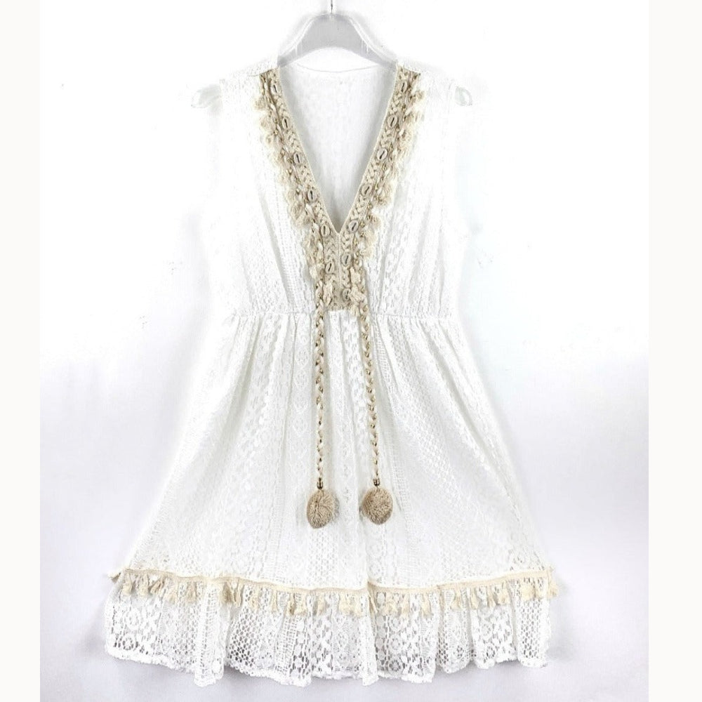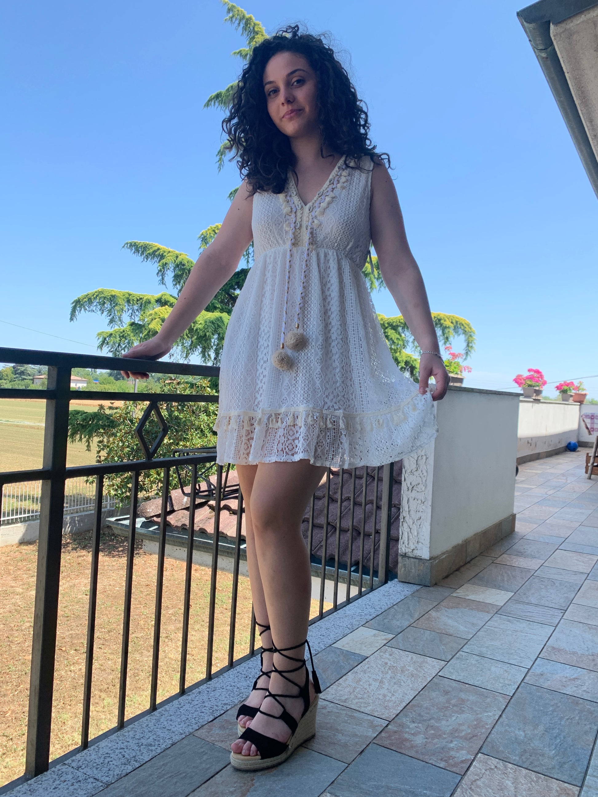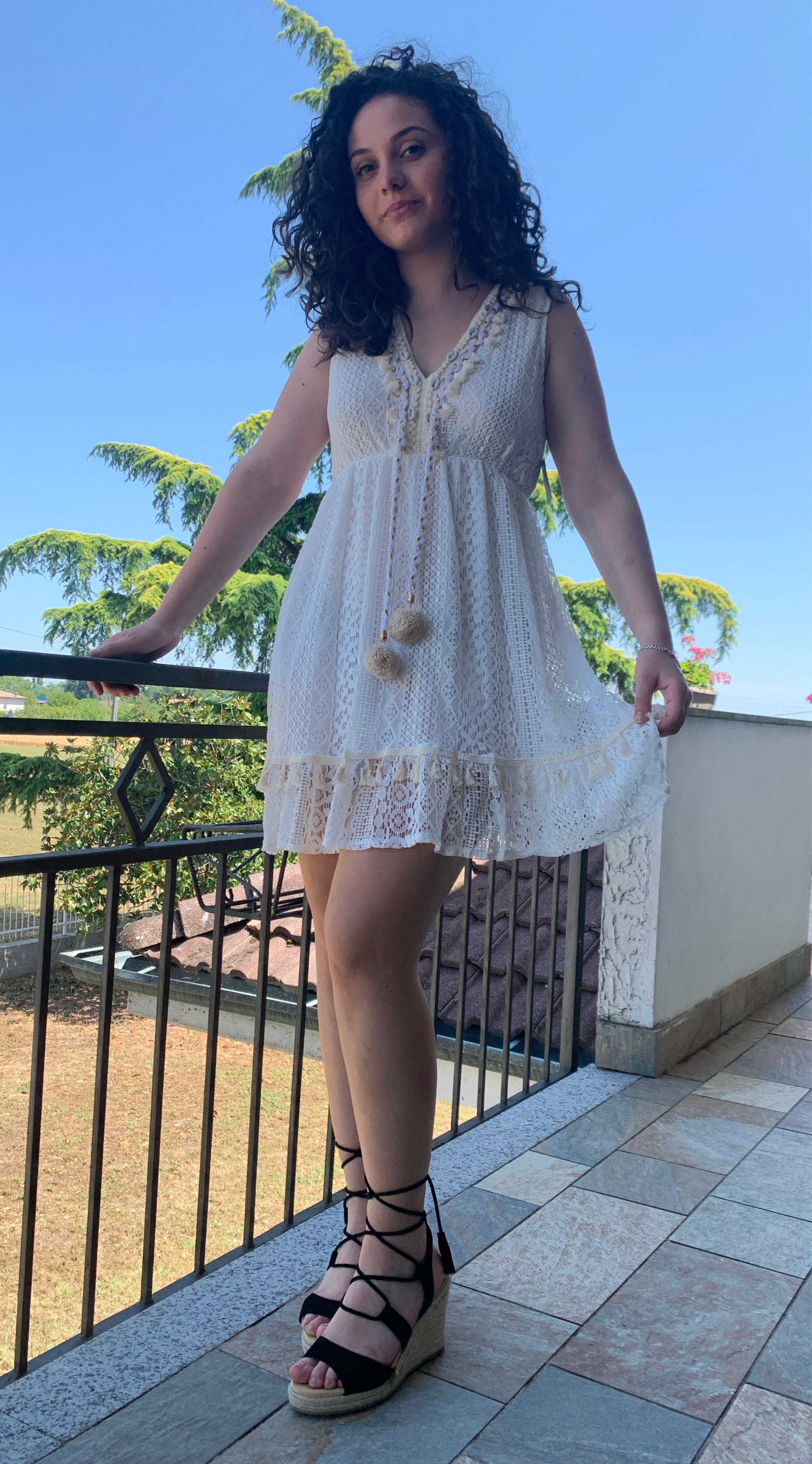 Abitino in cotone e pizzo smanicato. Scollo a V. Conchiglie applicate lungo la scollatura, elastico arricciato in vita. Con sottoveste.