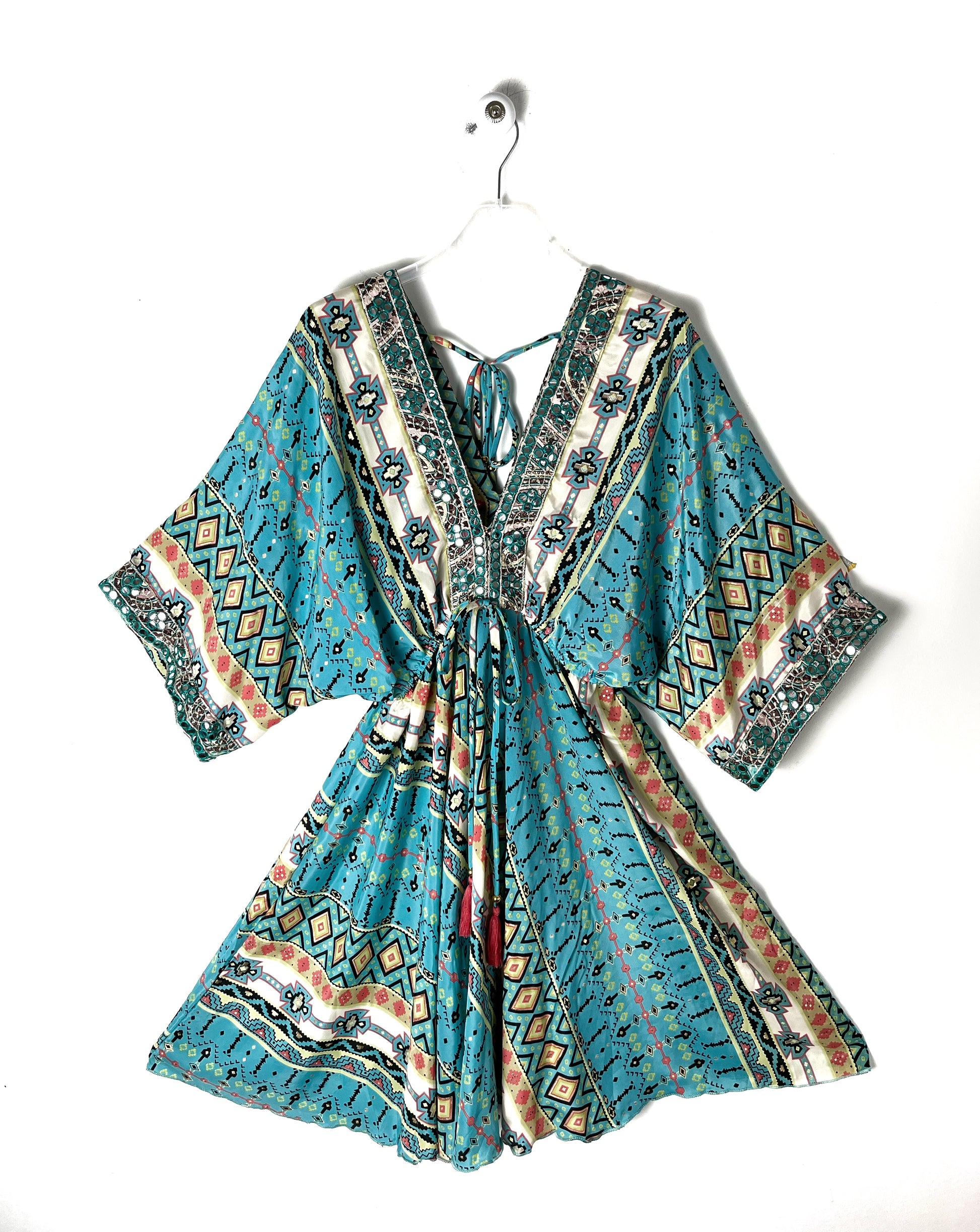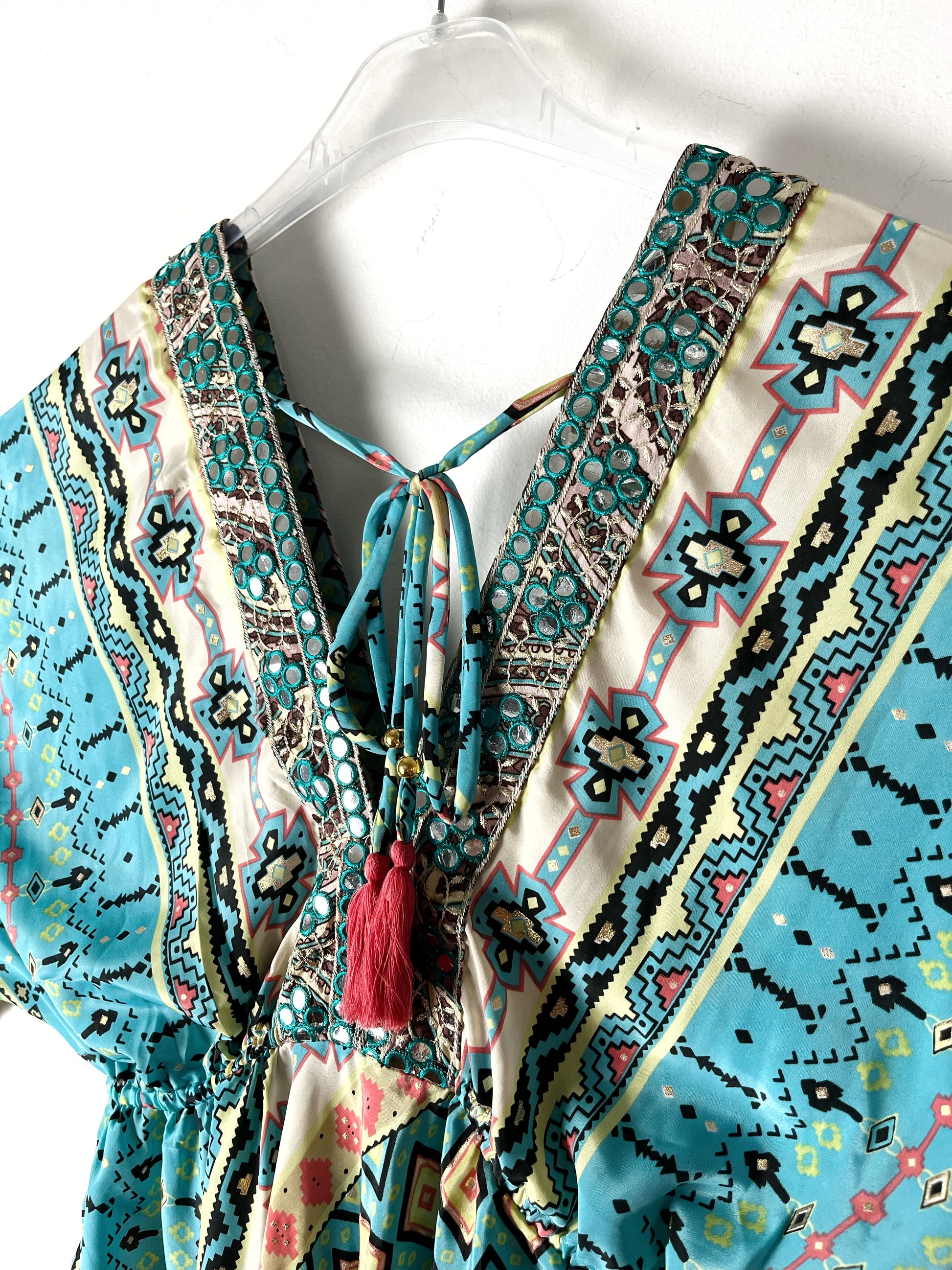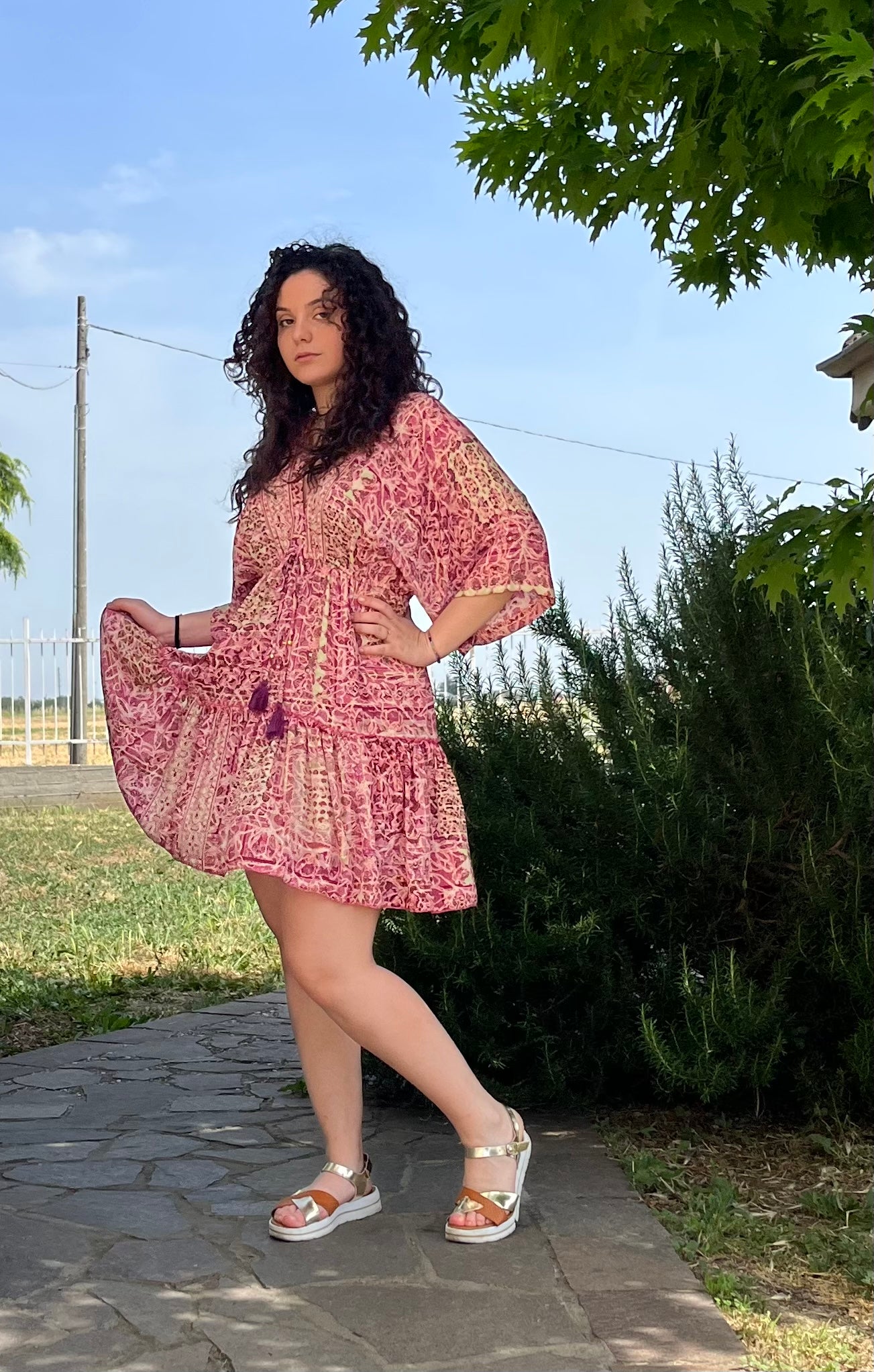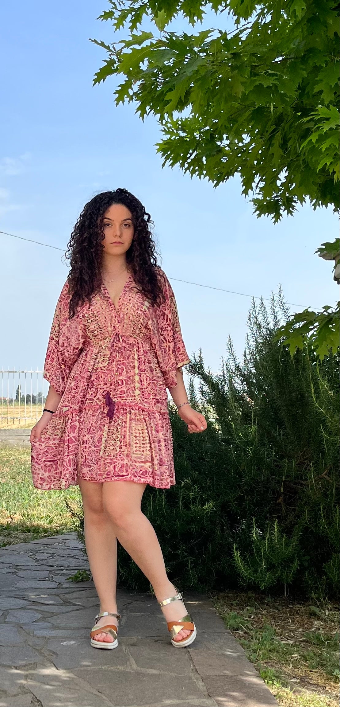 Abitino in misto sera, scollato a V davanti e dietro. Manica ampia tre quarti, elastico arricciato sotto il seno. Gonna al ginocchio molto svasata. Cordino con nappina dietro. Tutto impreziosito da ricami e applicazioni.