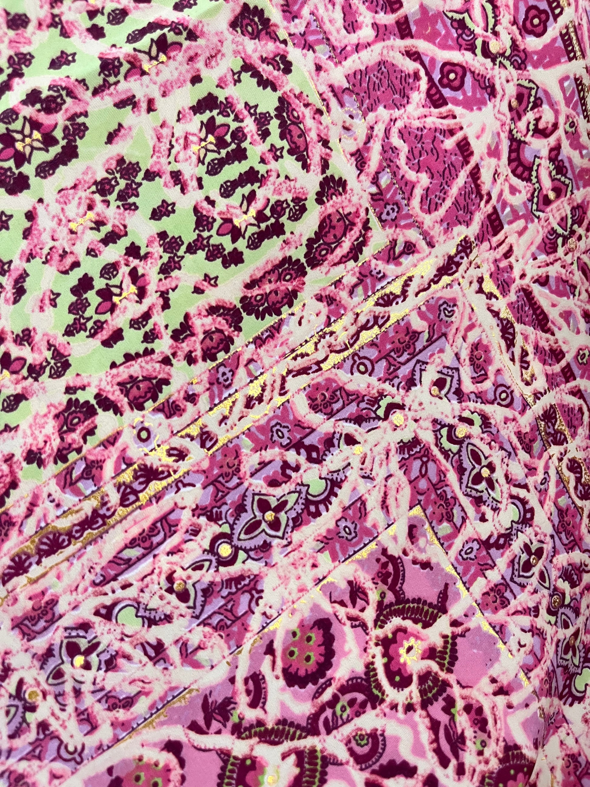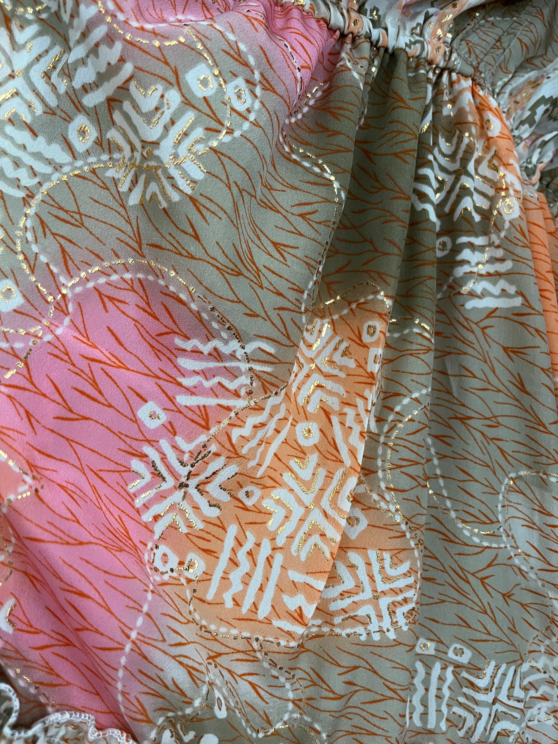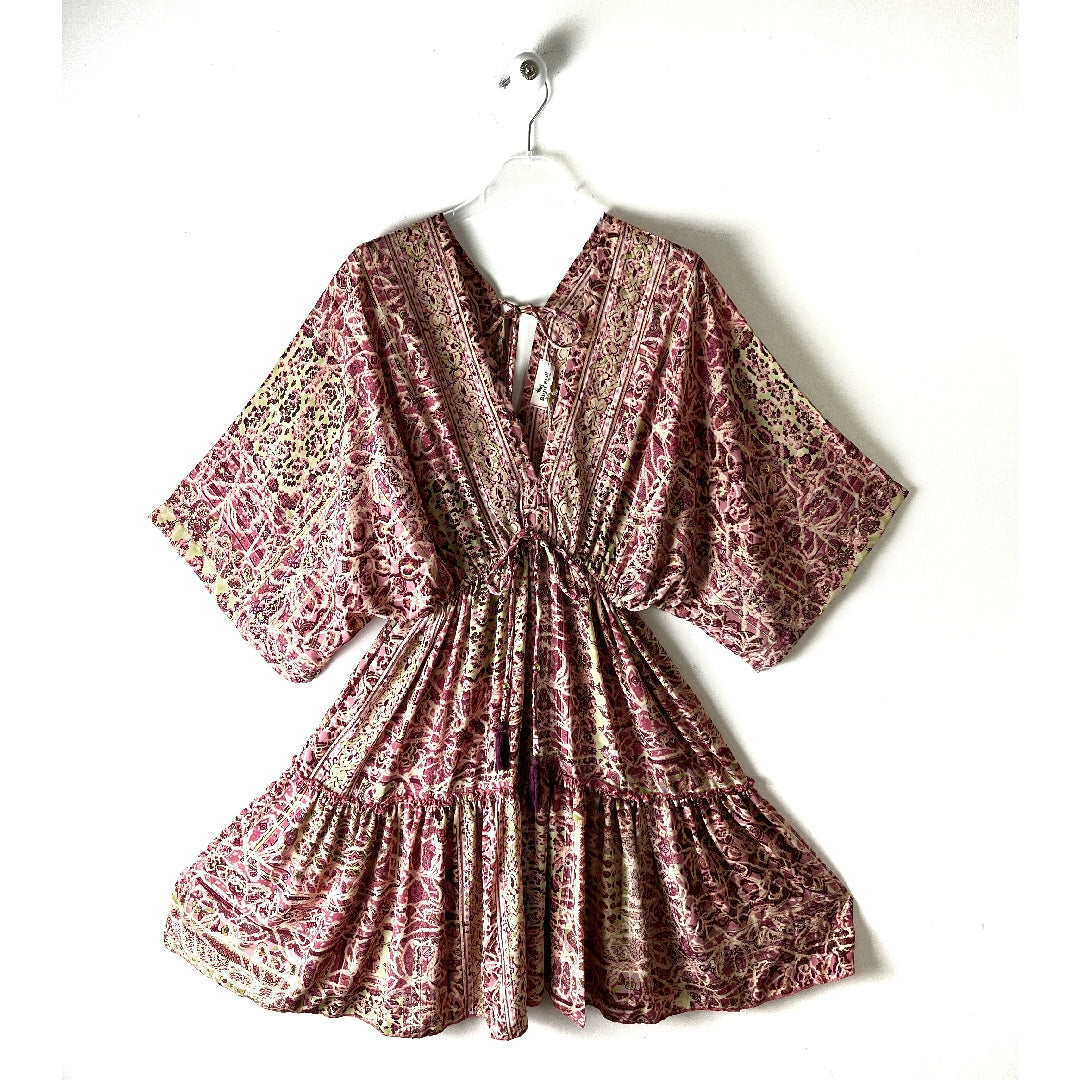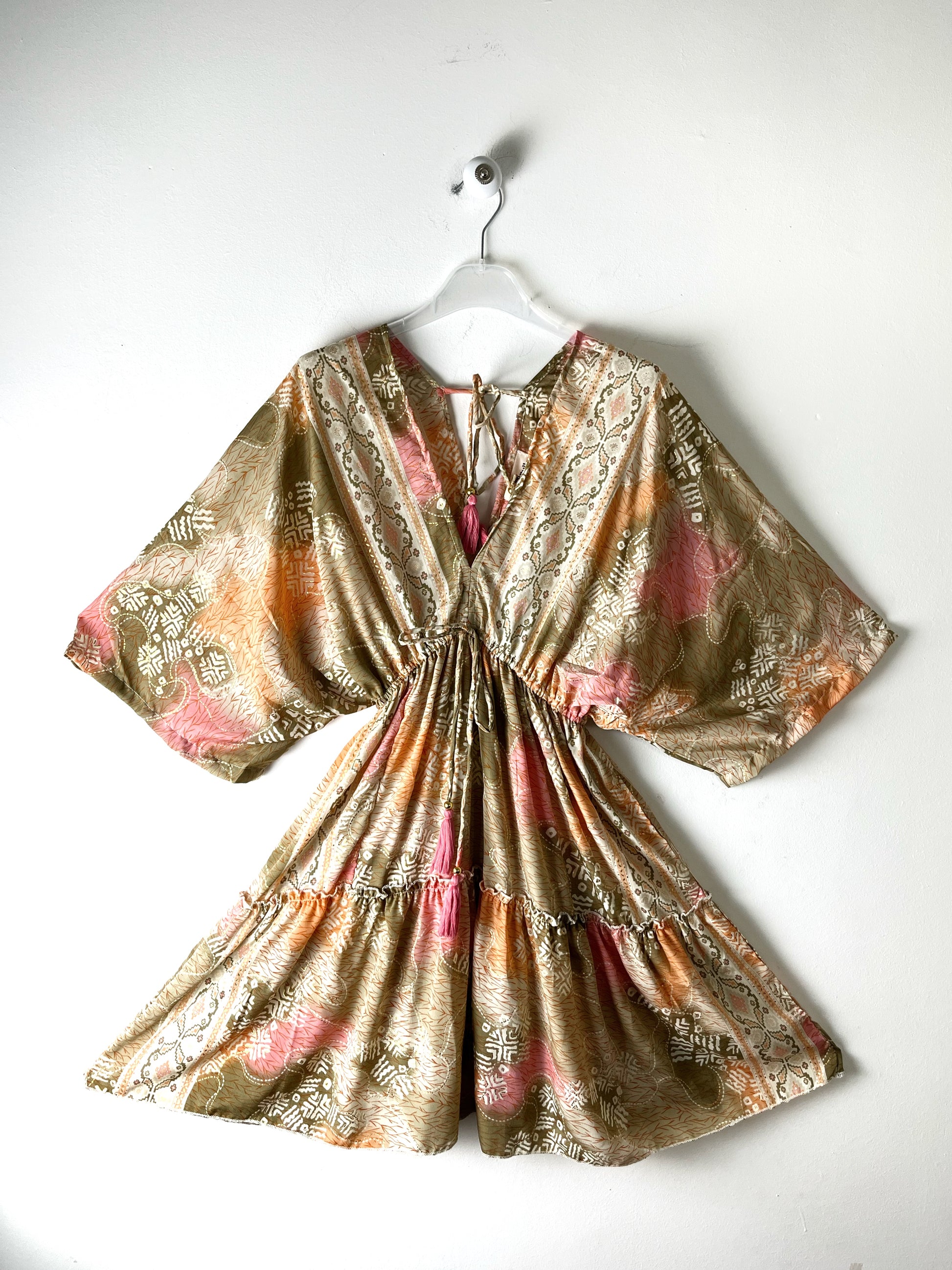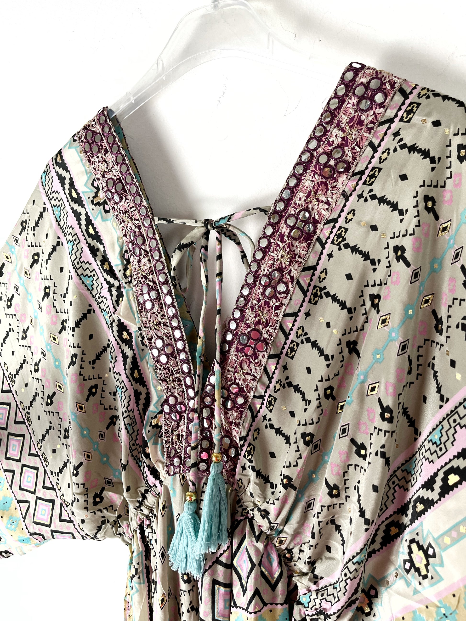 Abitino in misto sera, scollato a V davanti e dietro. Manica ampia tre quarti, elastico arricciato sotto il seno. Gonna al ginocchio molto svasata. Cordino con nappina dietro. Tutto impreziosito da ricami e applicazioni.