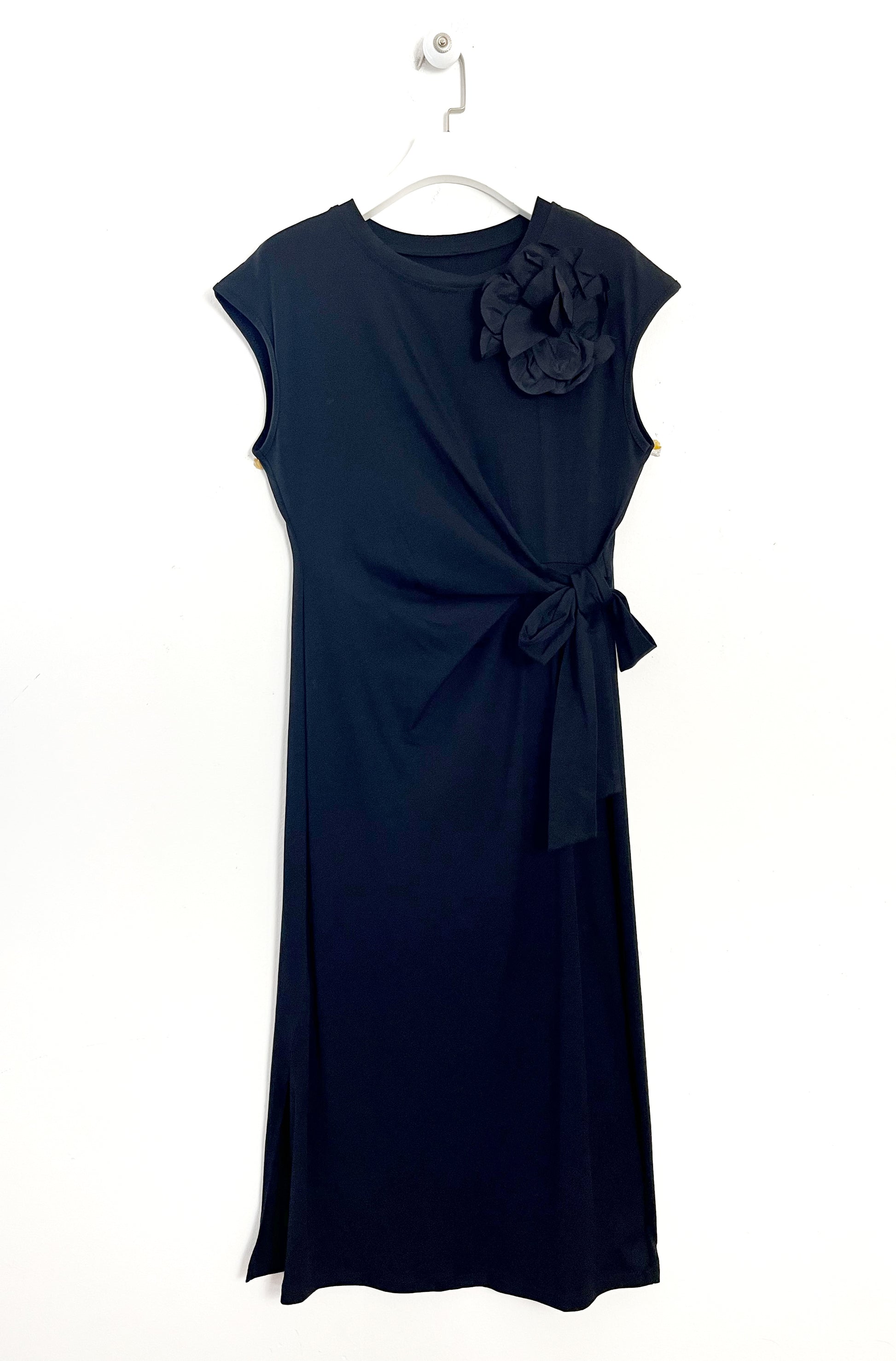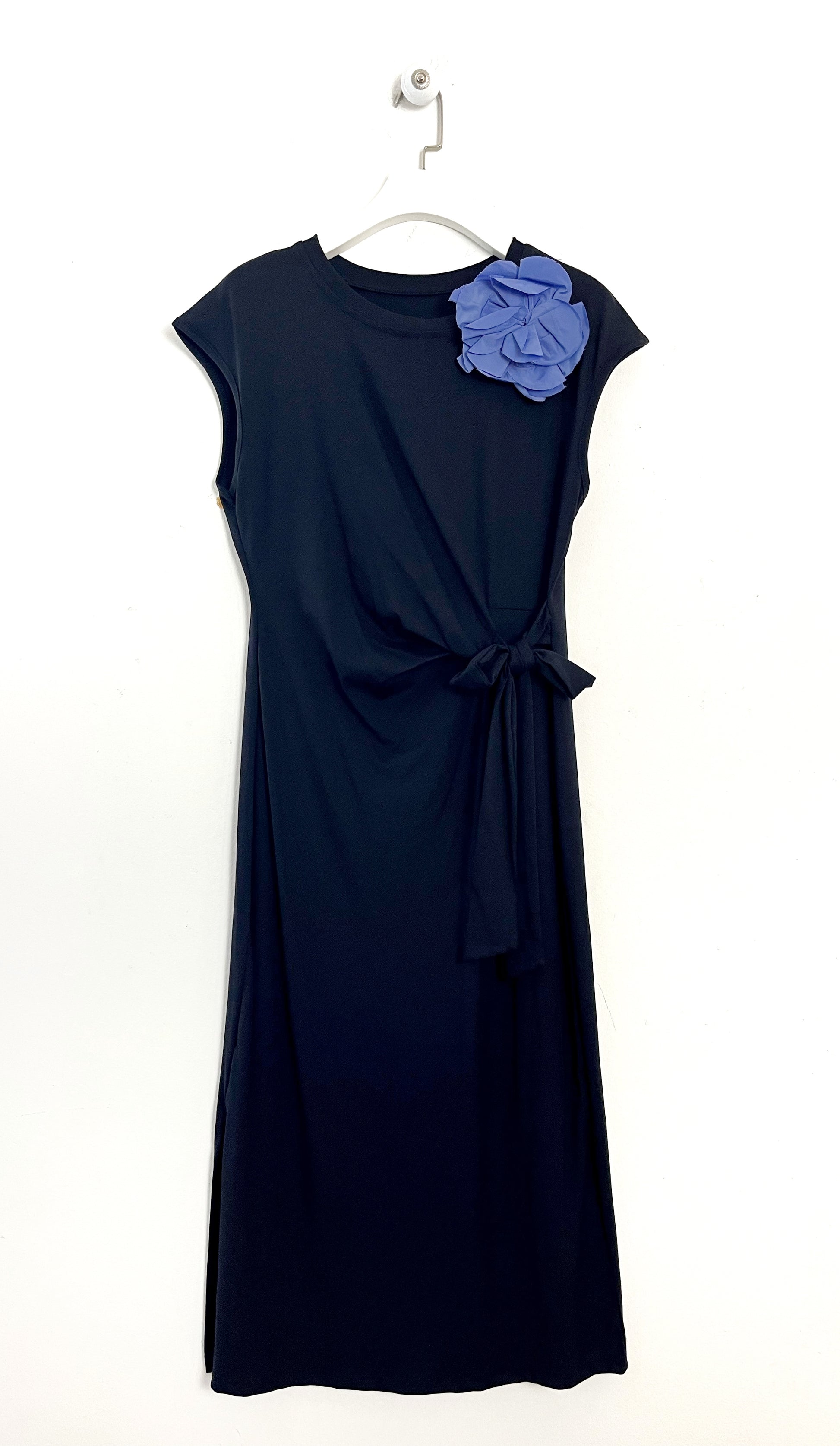 Abito a tubino in maglina di cotone. Annodato sul fianco con drappeggio. Spacco laterale, lunghezza modo. Spilla in tessuto applicata