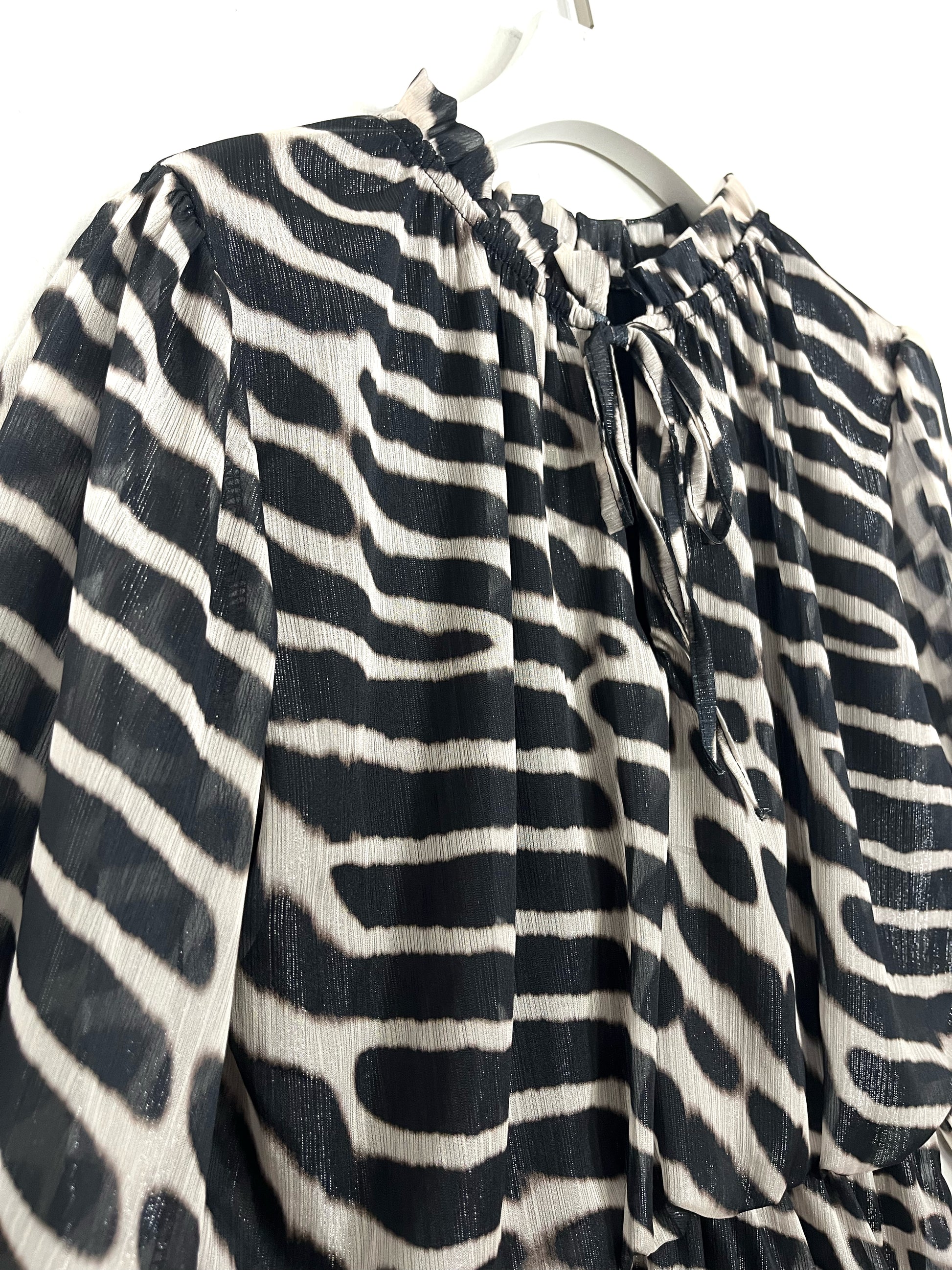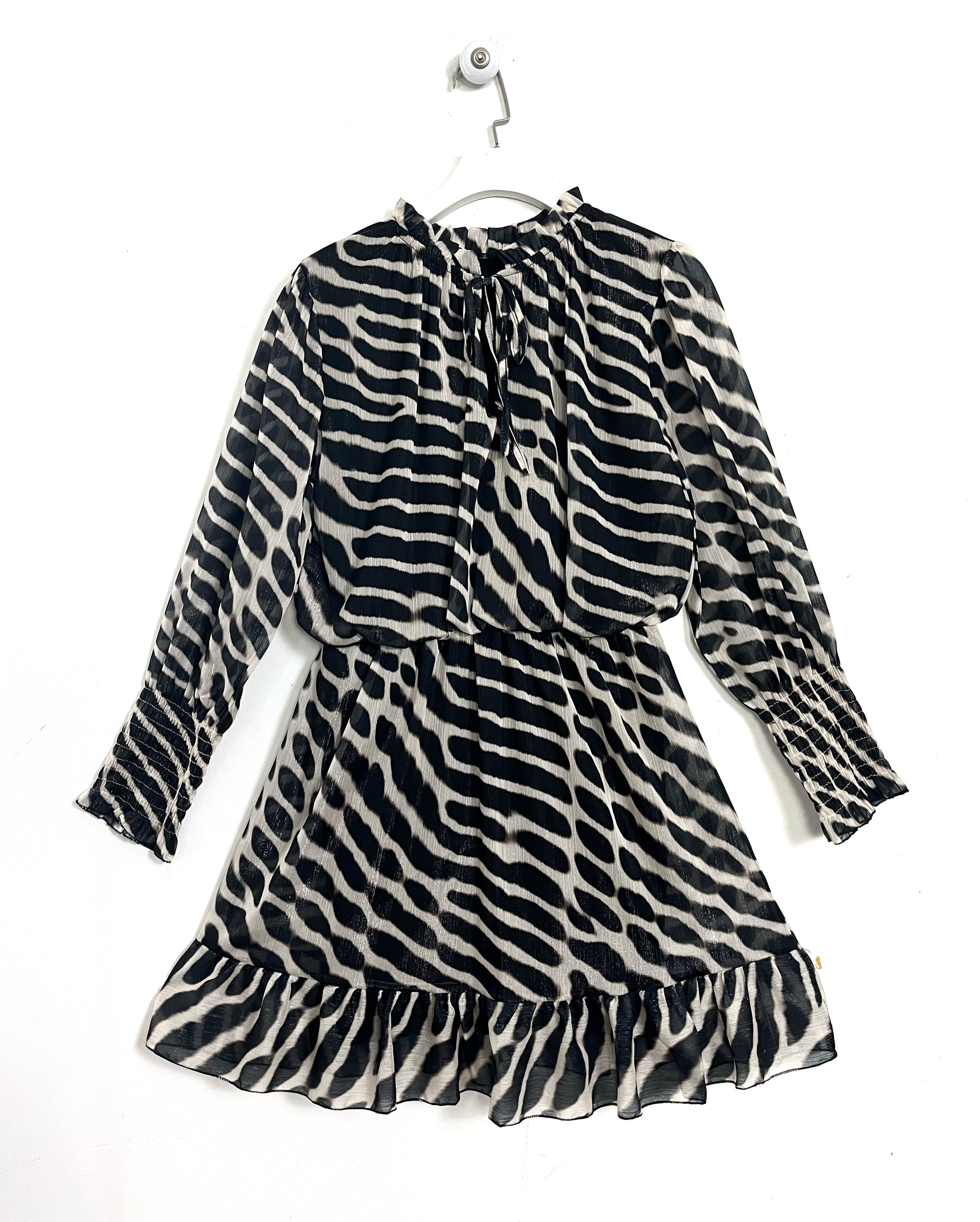 Abito in voile, corto con balza.  Maniche lunghe con polsino alto di elastico. Girocollo, con cordino da annodare. Elastico arricciato un vita. Gonna leggermente svasata. Lunghezza sopra al ginocchio. Foderato.