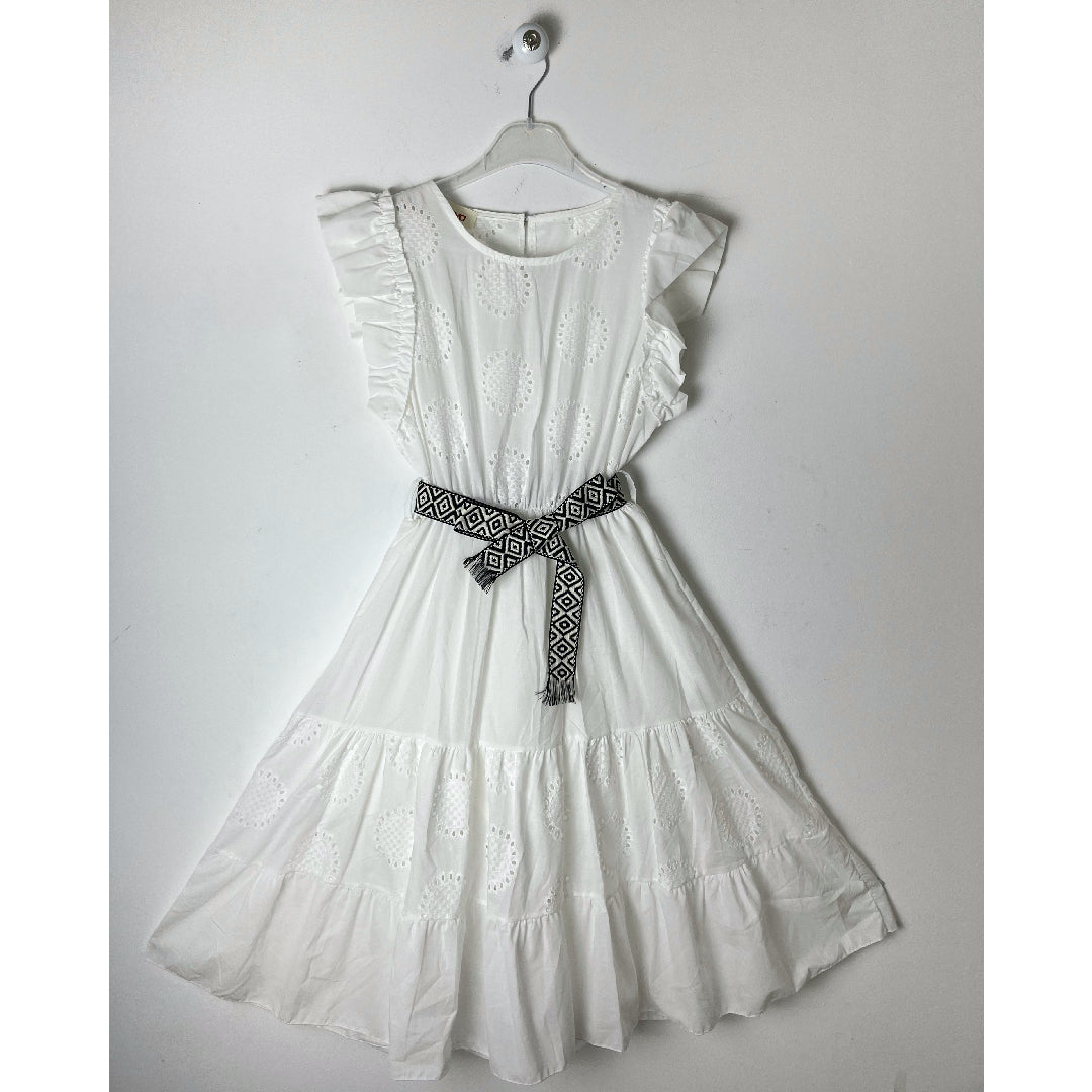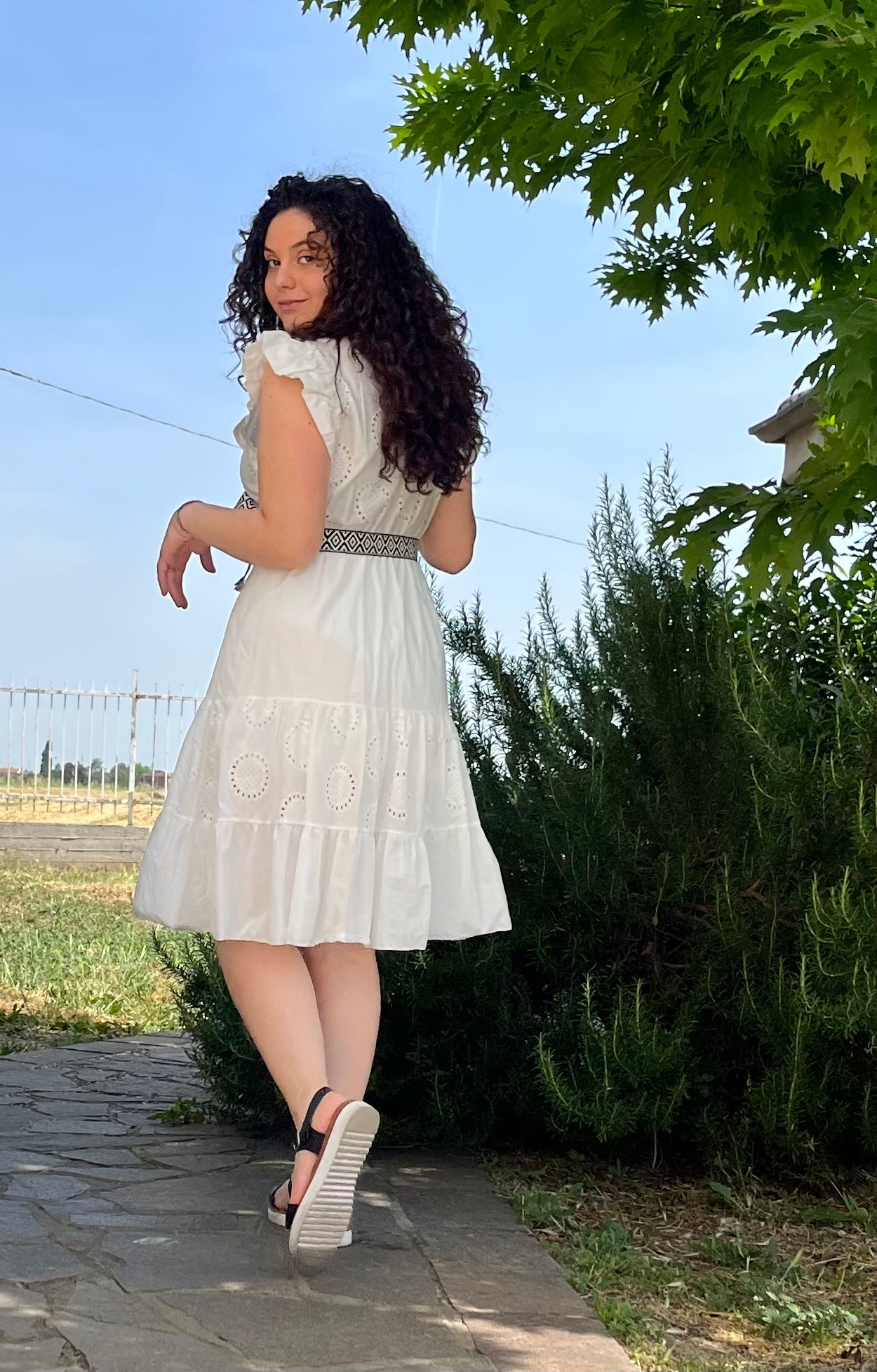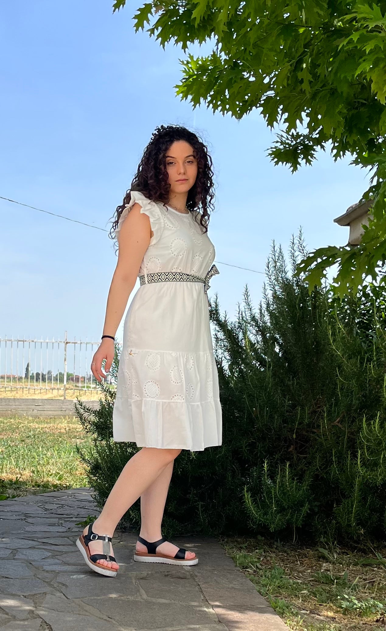 Abito midi in cotone e sangallo. Smanicato con rouge. Gonna svasata a balze foderata. Passanti con cintura in fantasia.