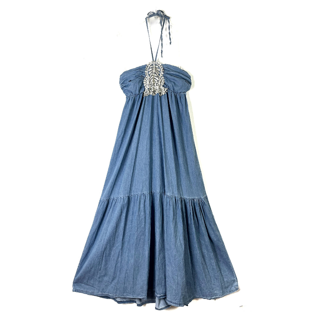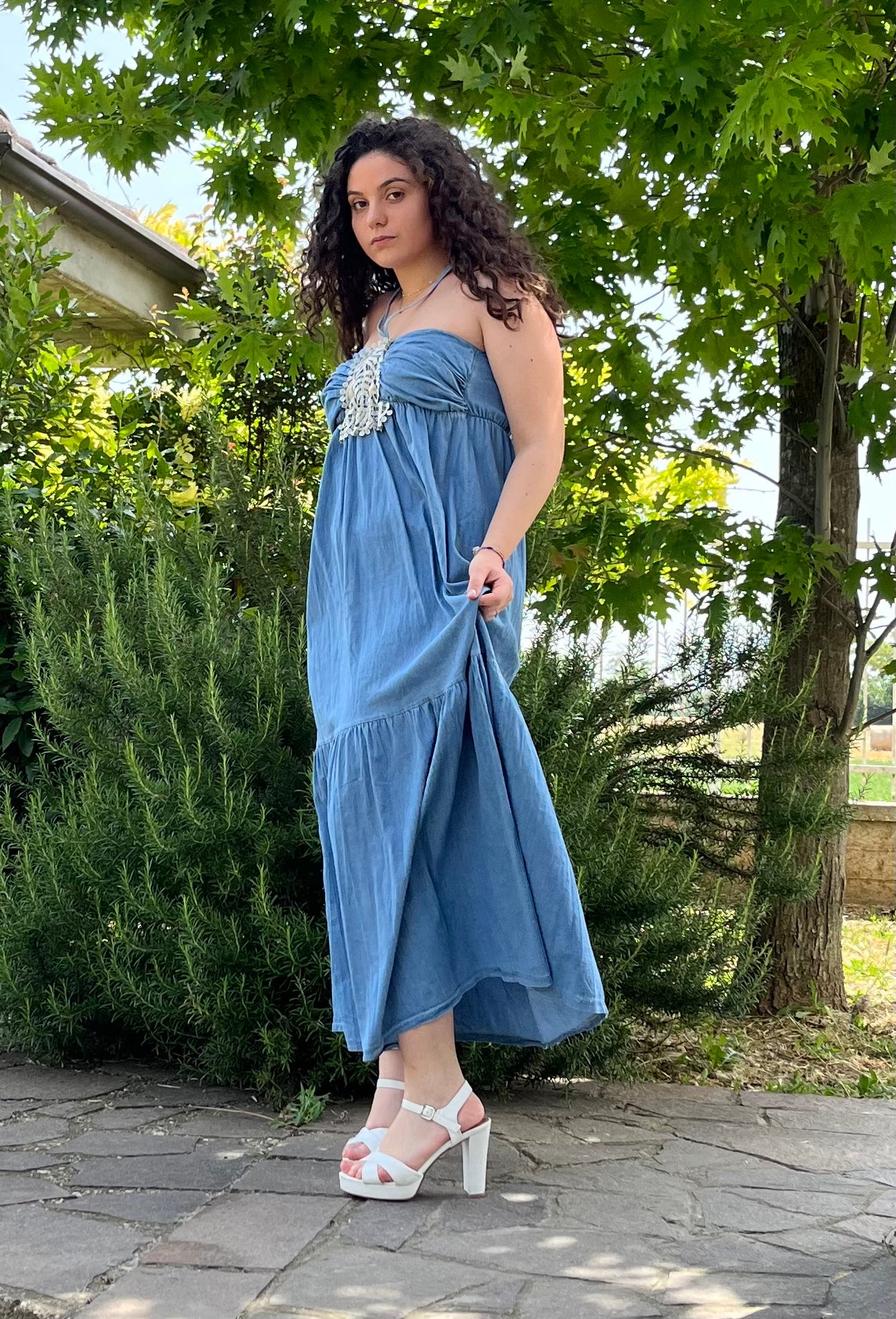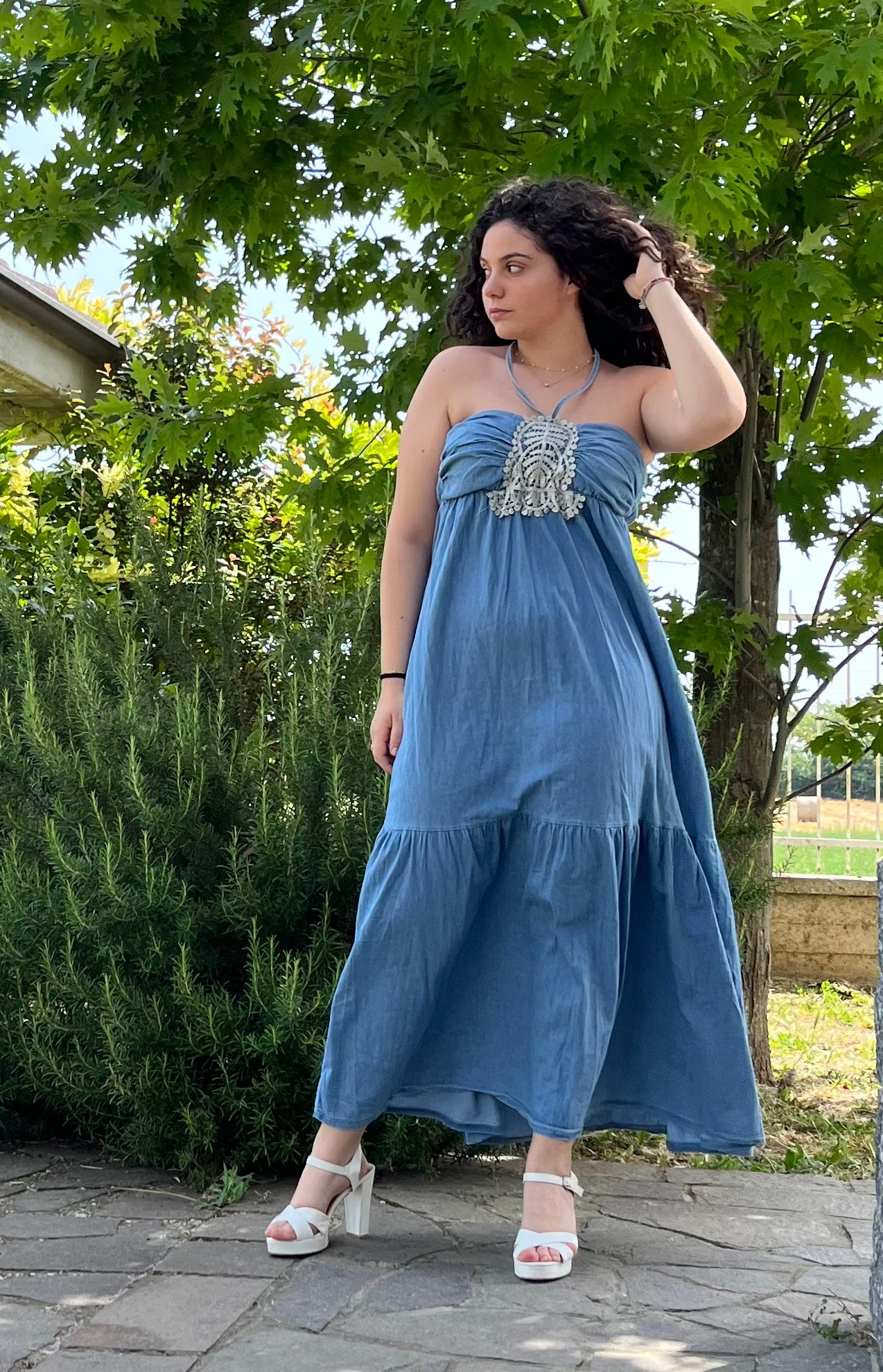 Abito a fascia in denim di cotone. Drappeggiato sul seno con ricamo applicato. Allacciato dietro al collo. Gonna lunga e svasata.