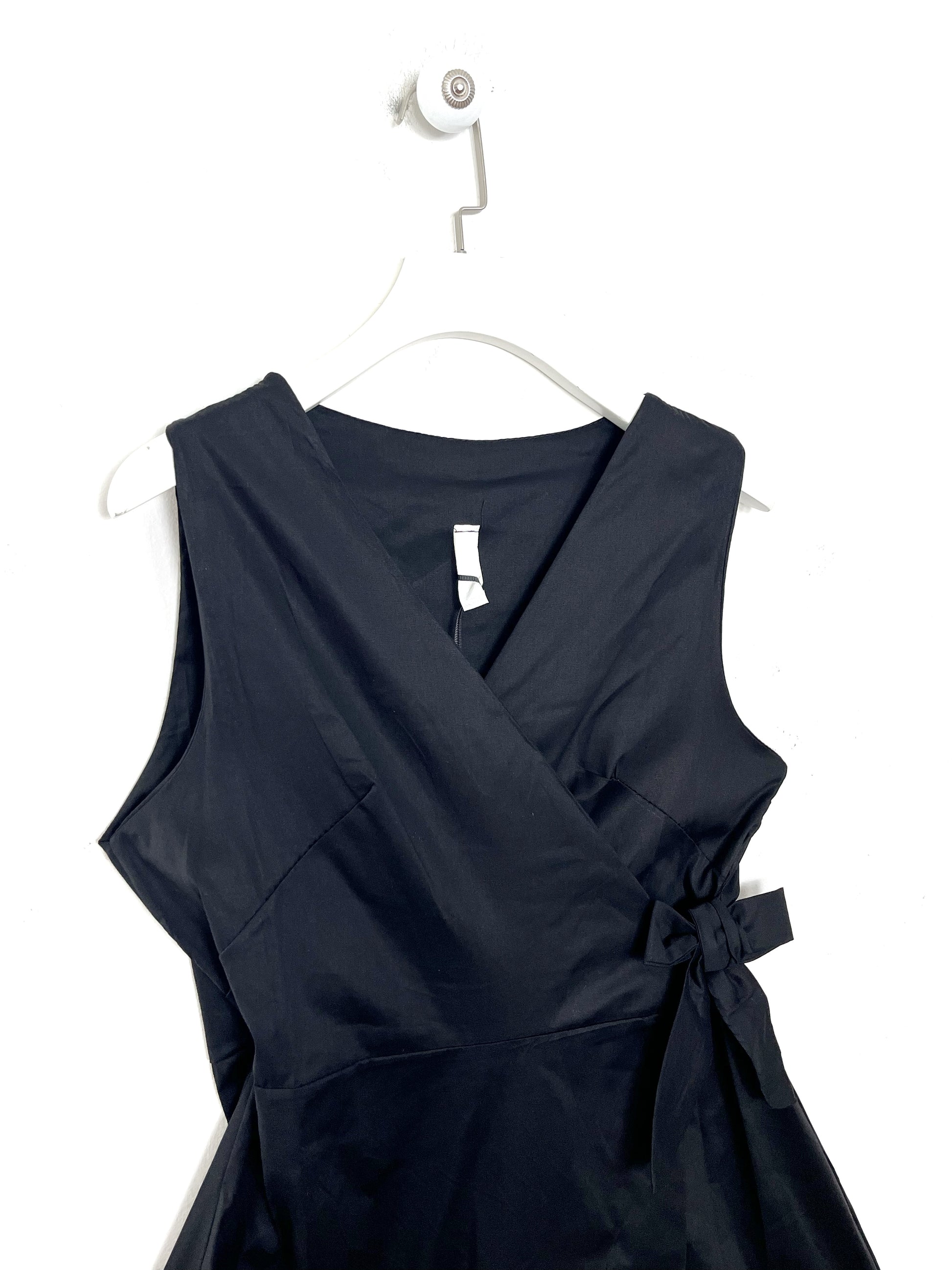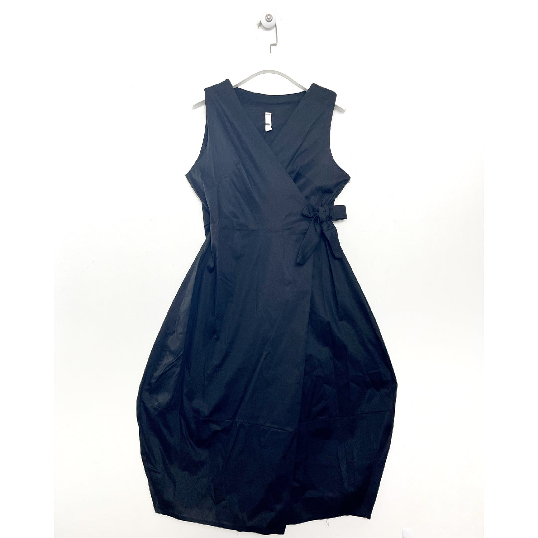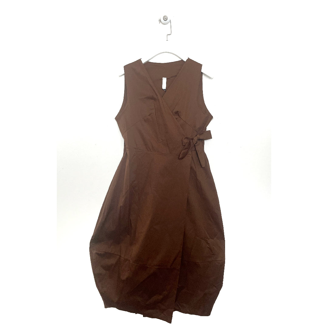 Abito con scollatura incrociata, smanicato. Chiusura a portafoglio. Gonna lunghezza Midi a palloncino.