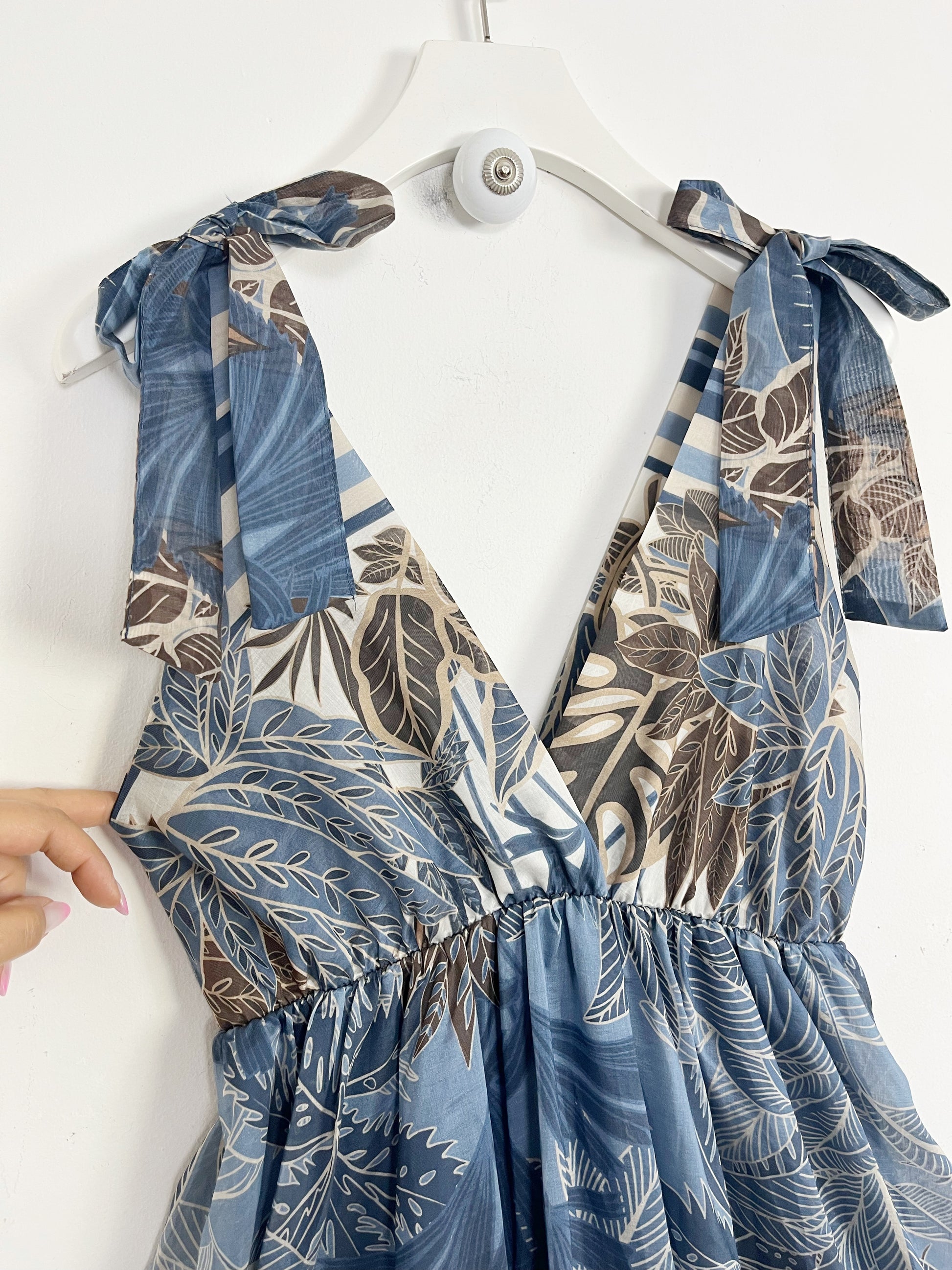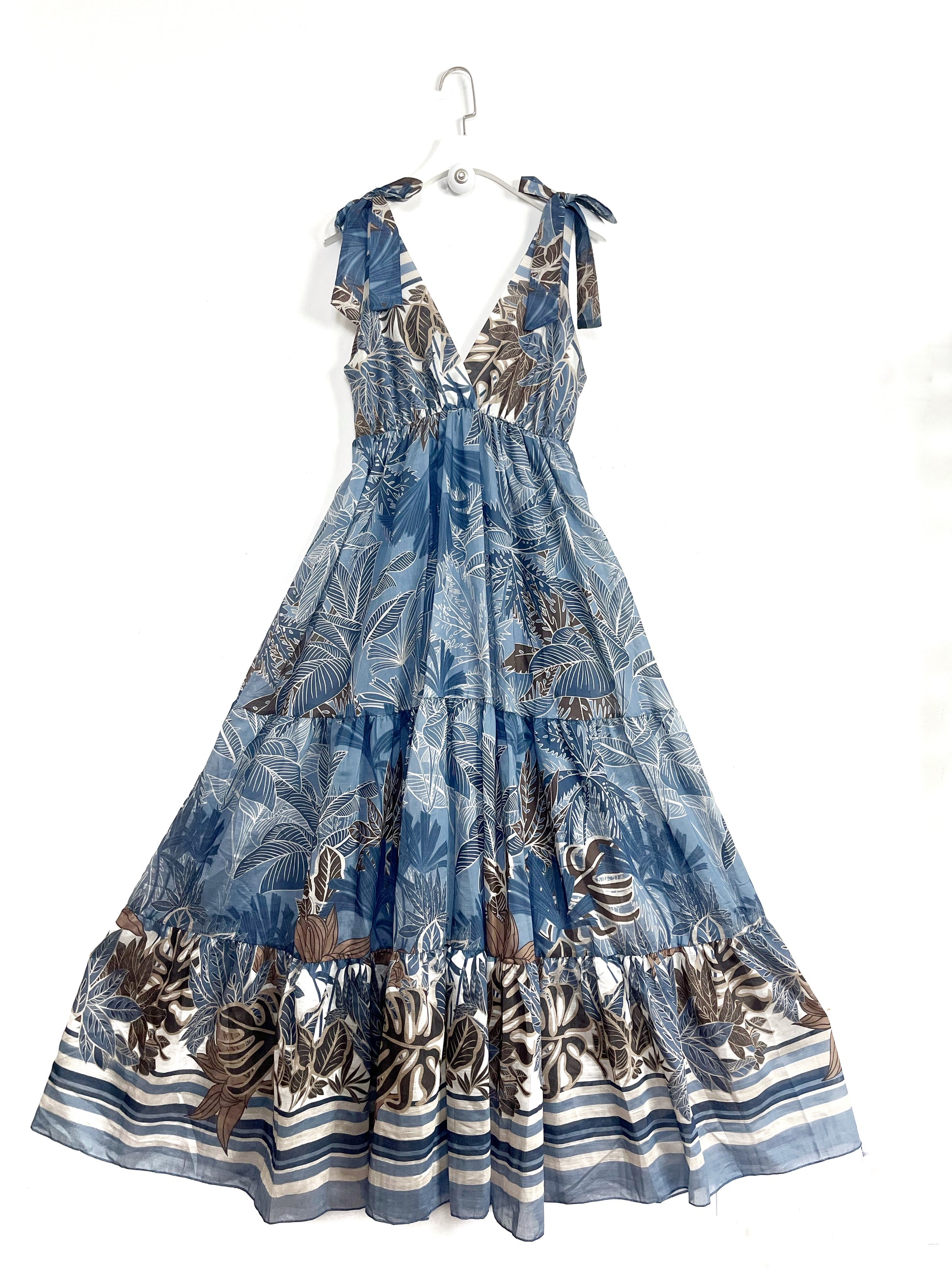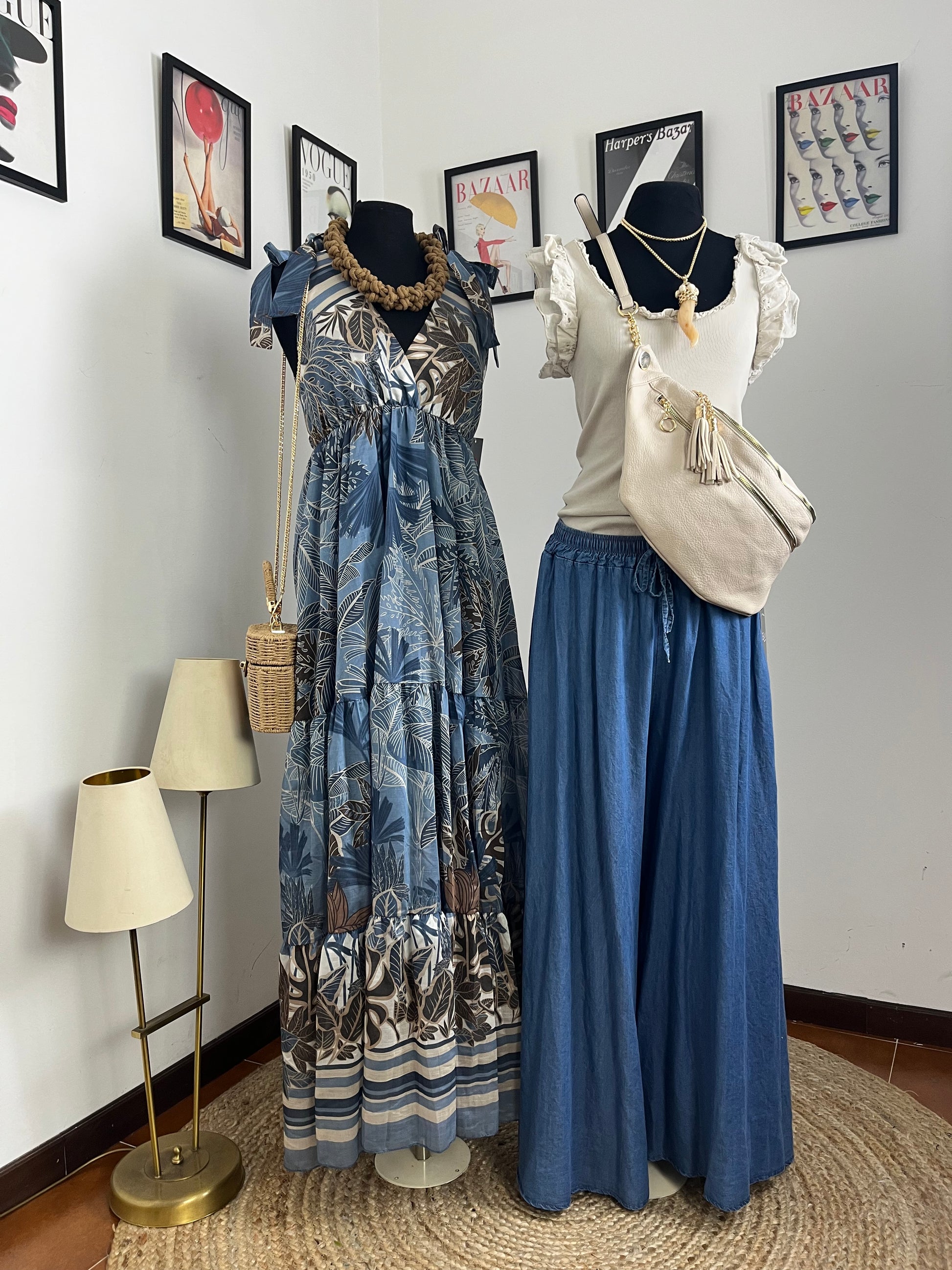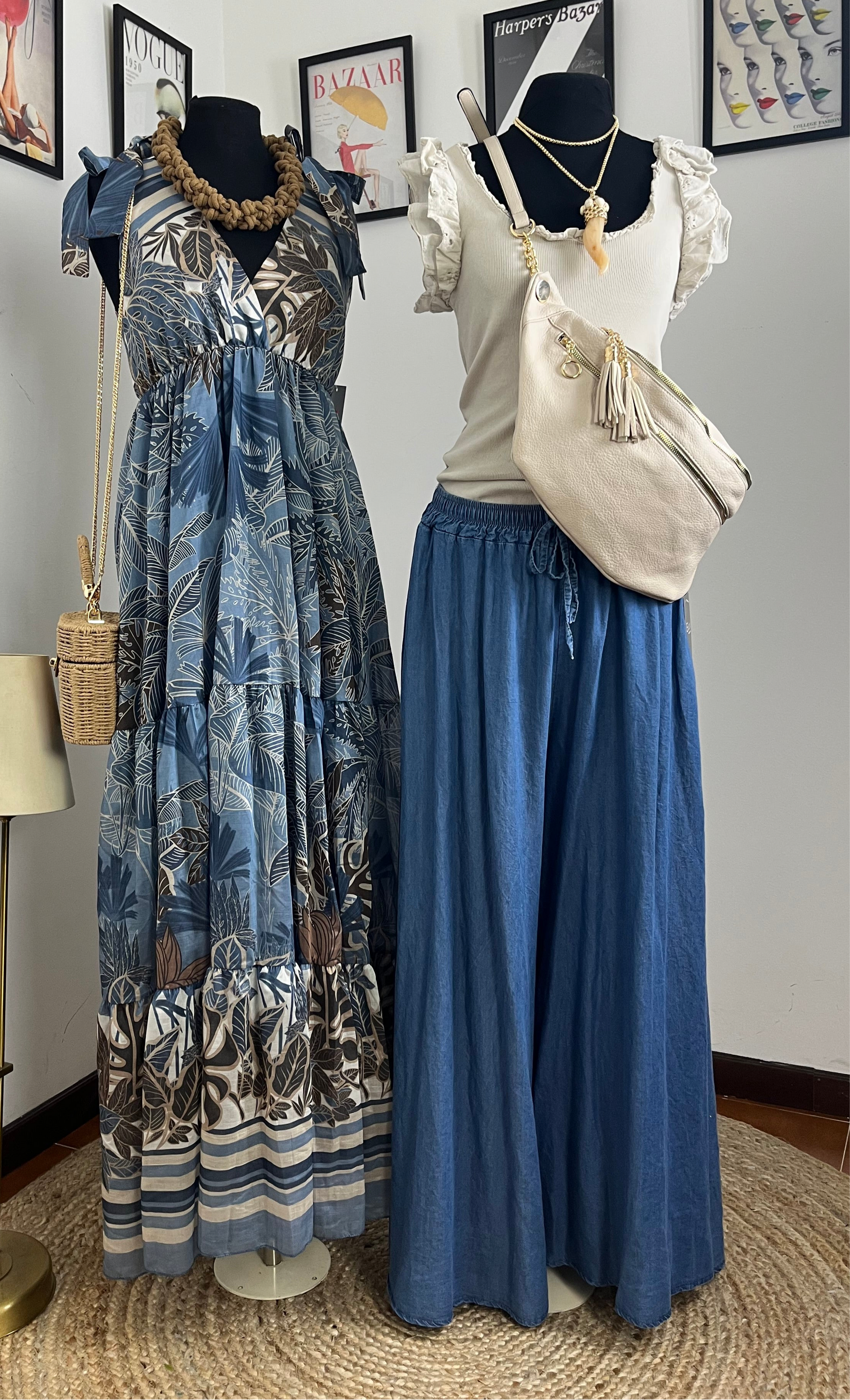 Abito lungo in leggerissimo Tencel con scollatura profonda a V davanti e dietro. Arricciatura sotto il seno. Fiocchetti sulle spalle.Gonna molto Lunga esvasata, Foderato.