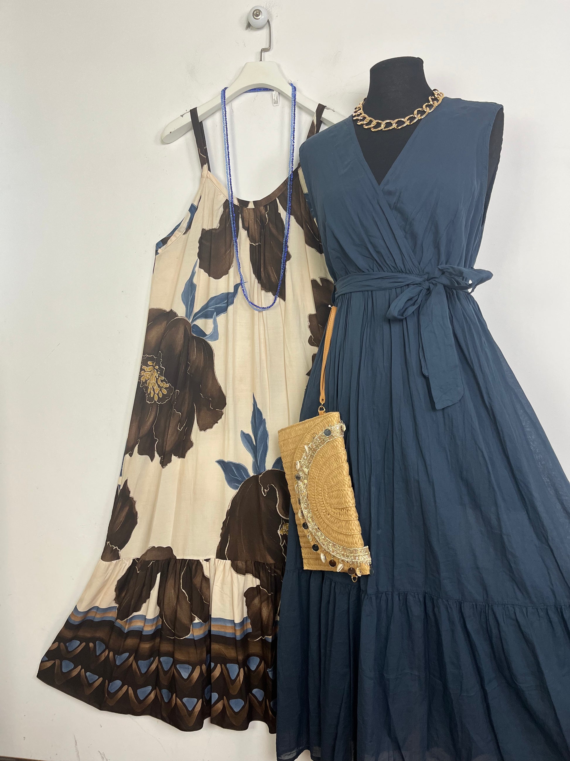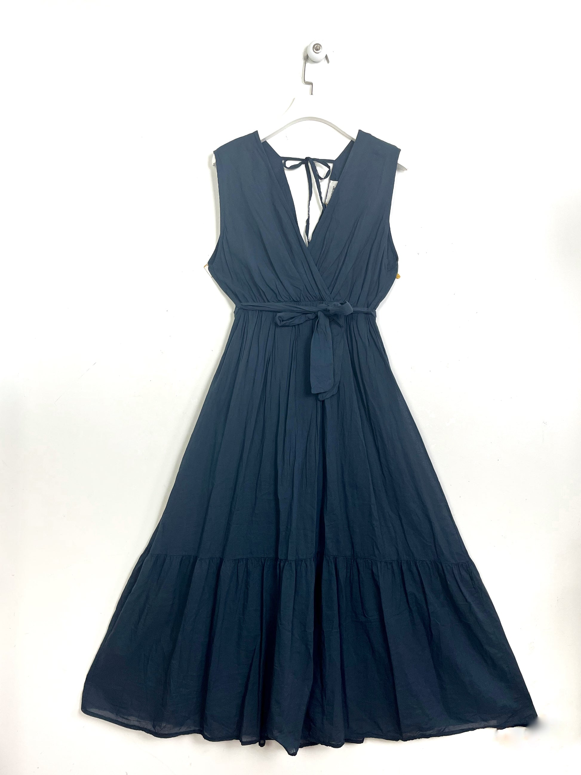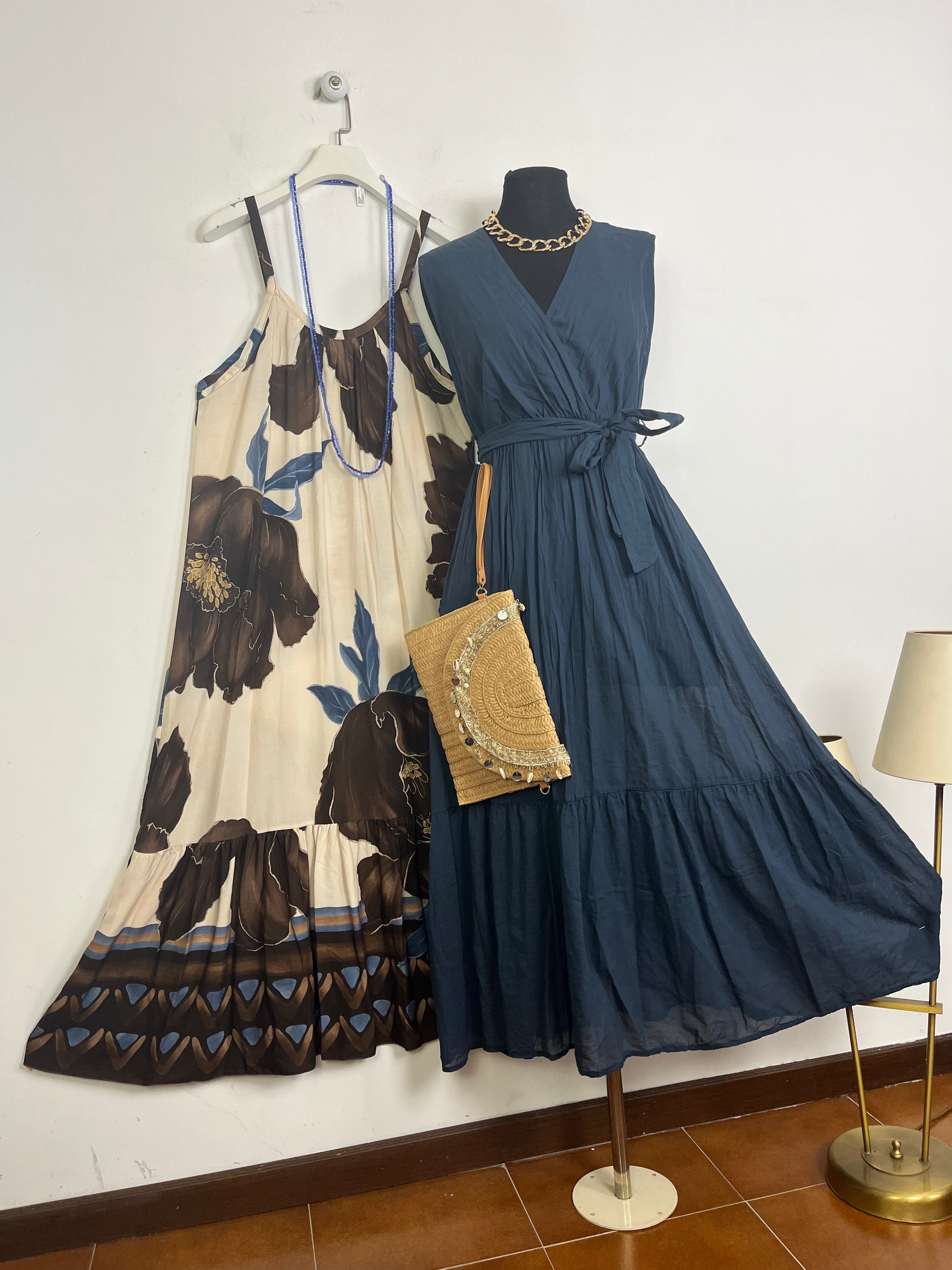 Abito in leggerissima mussola di cotone smanicato. Scollatura a V incrociata davanti e dietro. Arricciatura sotto il seno. Passanti con cinturina dello stesso tessuto. Gonna svasata a balze. Lunghezza midi. Foderato
