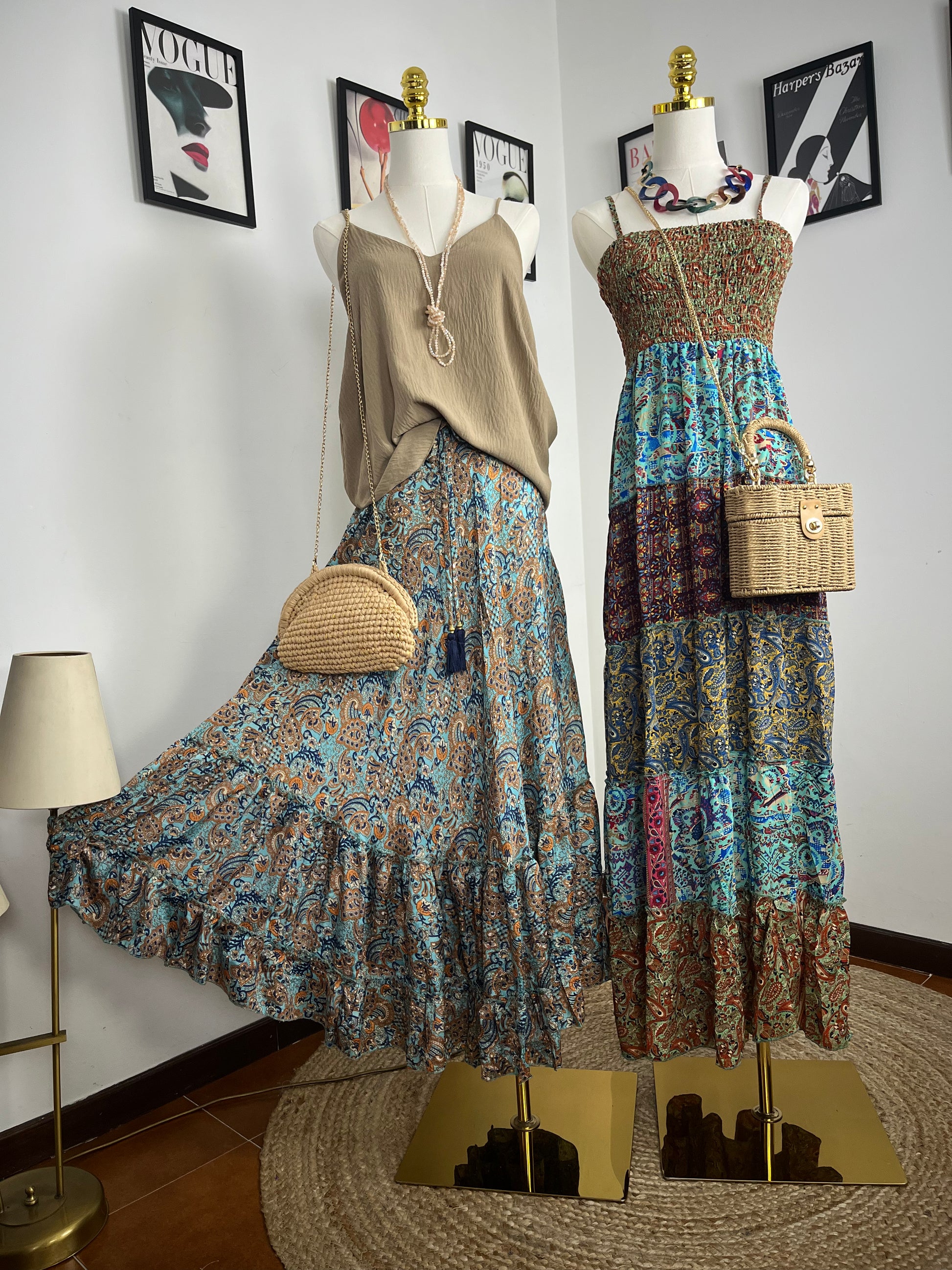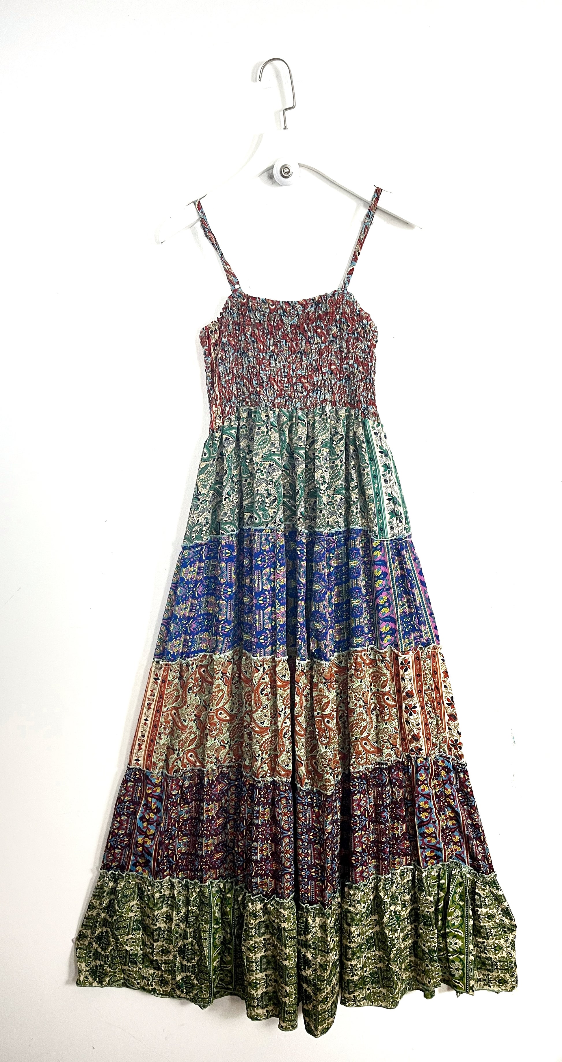 Abito lungo in seta con spalline. corpetto in punto stock elasticizzato. Lungo leggermente svasato. Tutti diversi uno dall’altro.