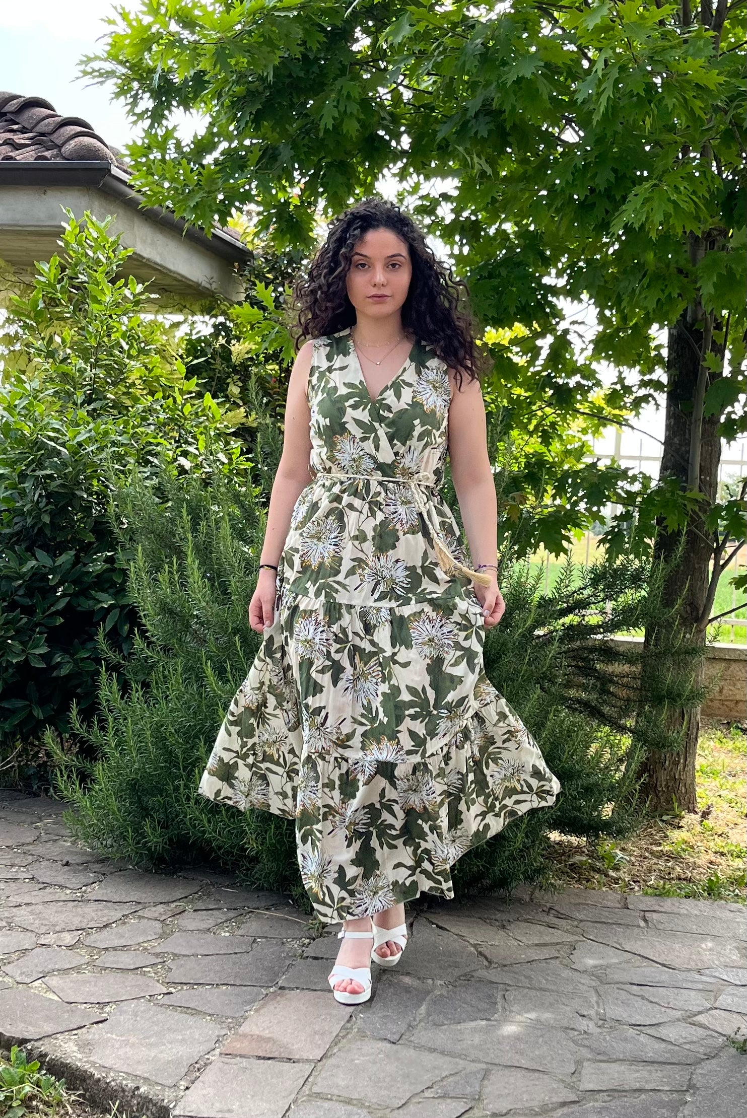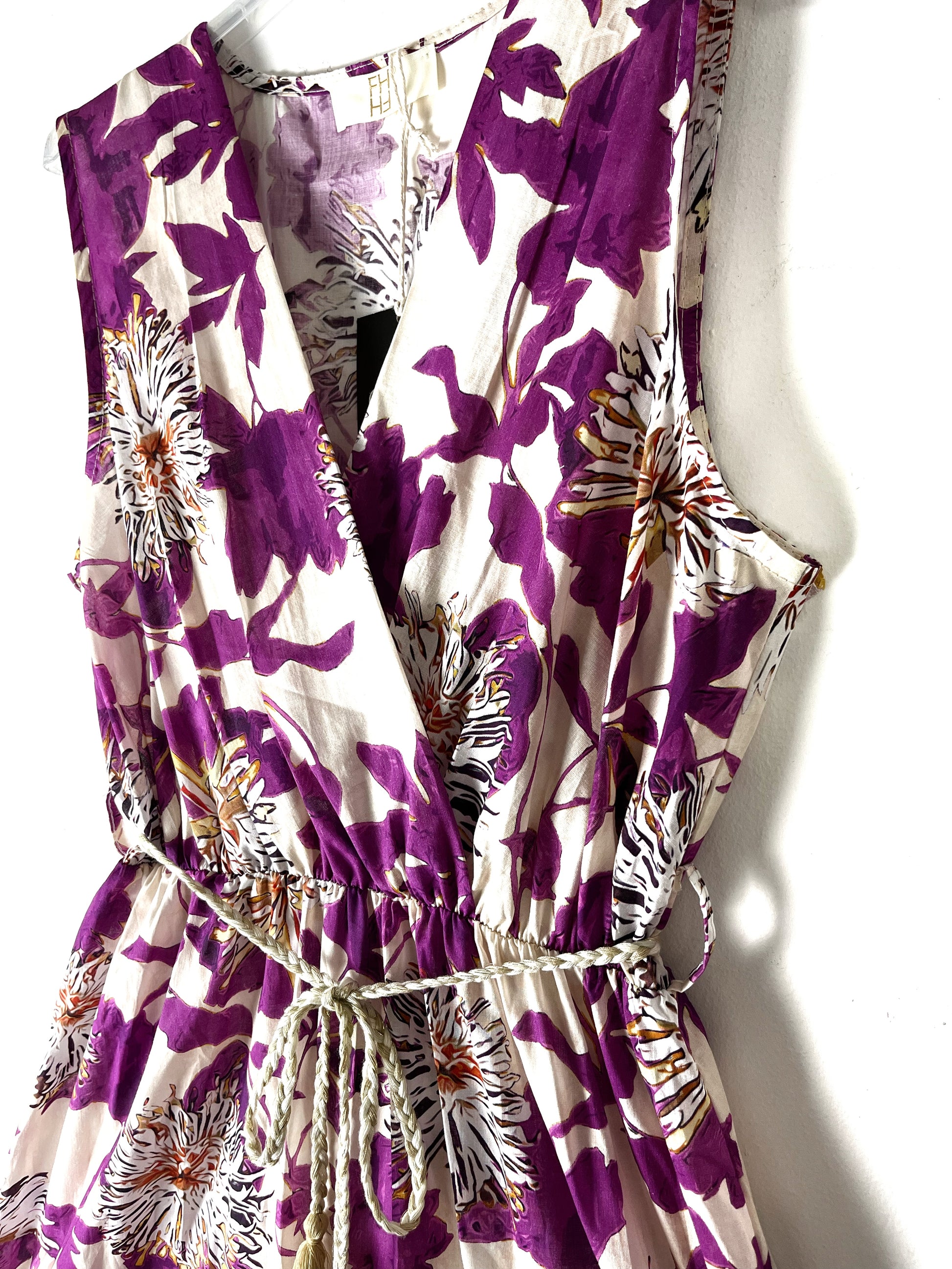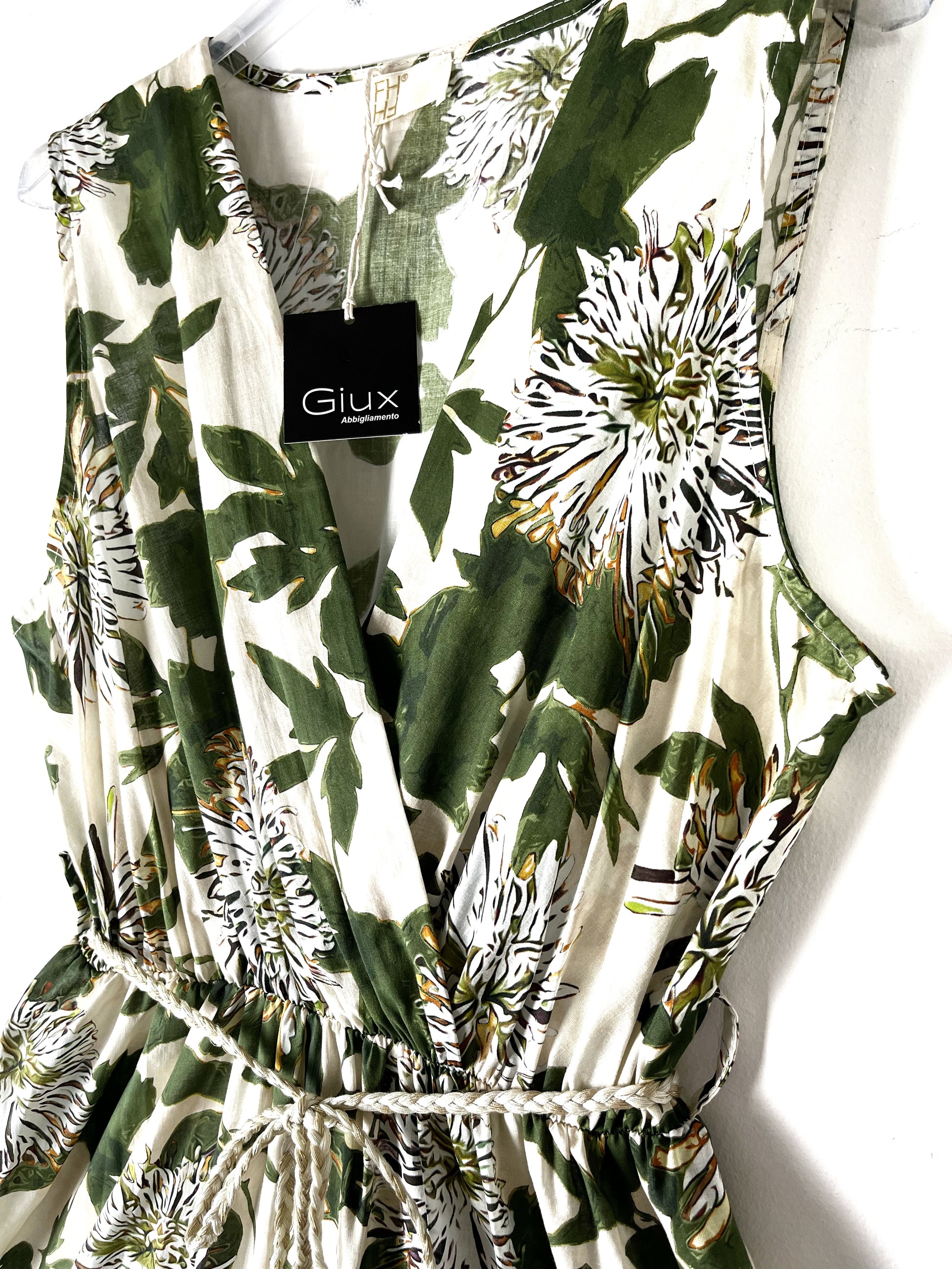 Abito con scollatura incrociata, smanicato. Arricciato in vita con elastico, passanti e cinturina in corda. Gonna molto svasata, a balze. Sfoderato