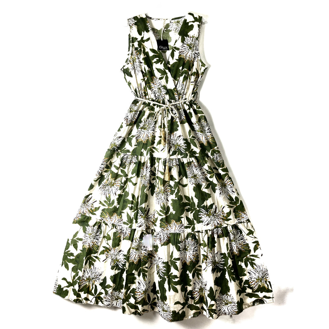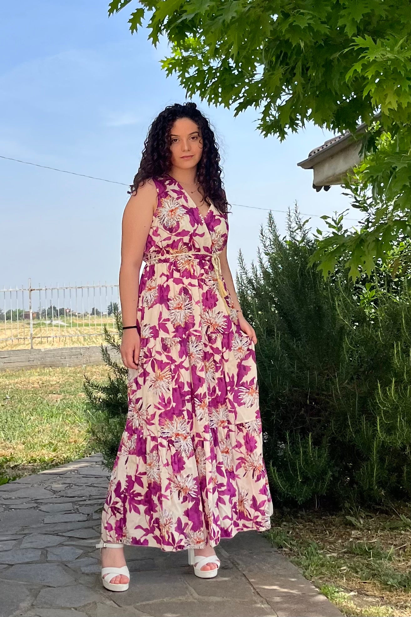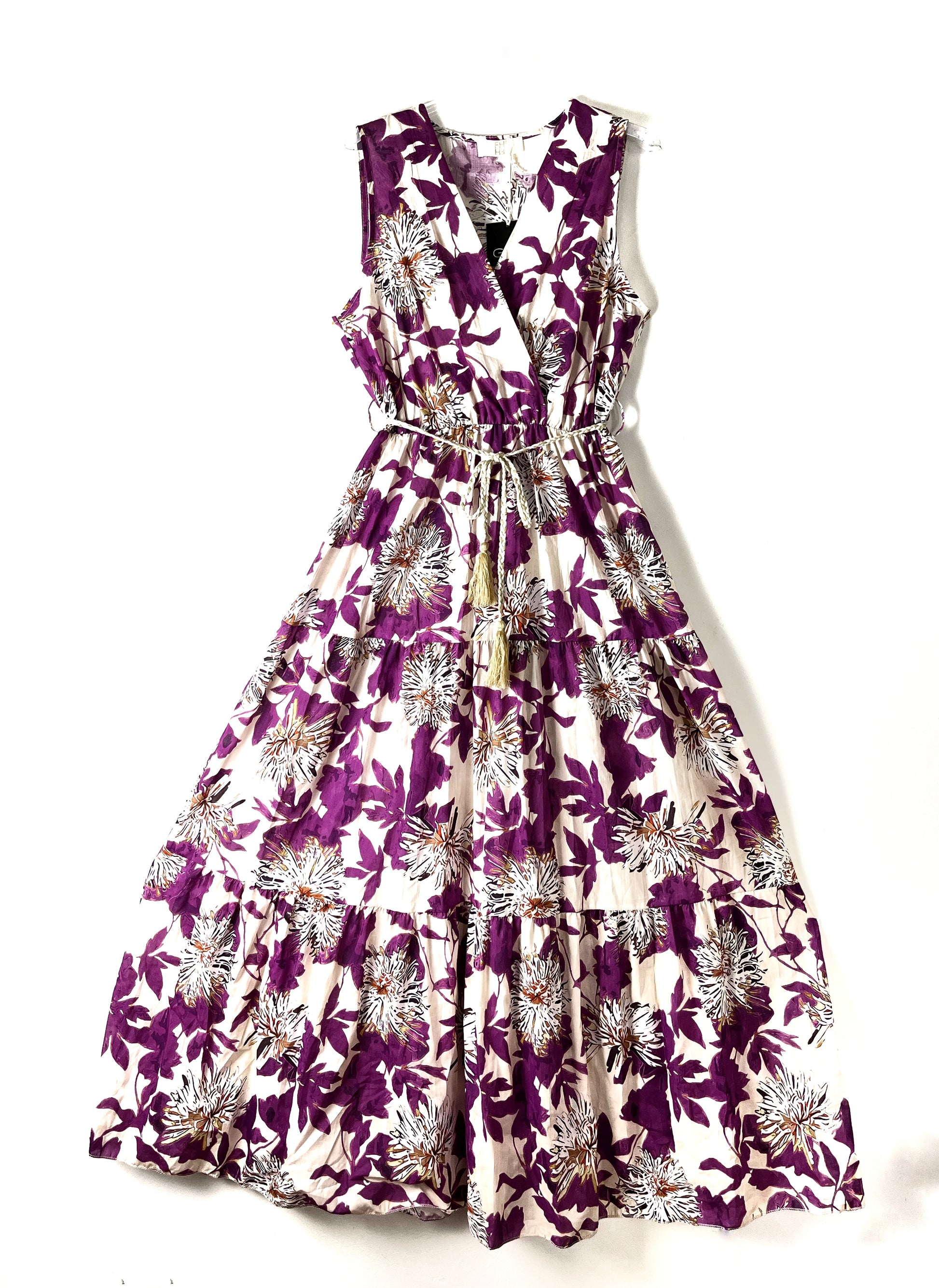 Abito con scollatura incrociata, smanicato. Arricciato in vita con elastico, passanti e cinturina in corda. Gonna molto svasata, a balze. Sfoderato