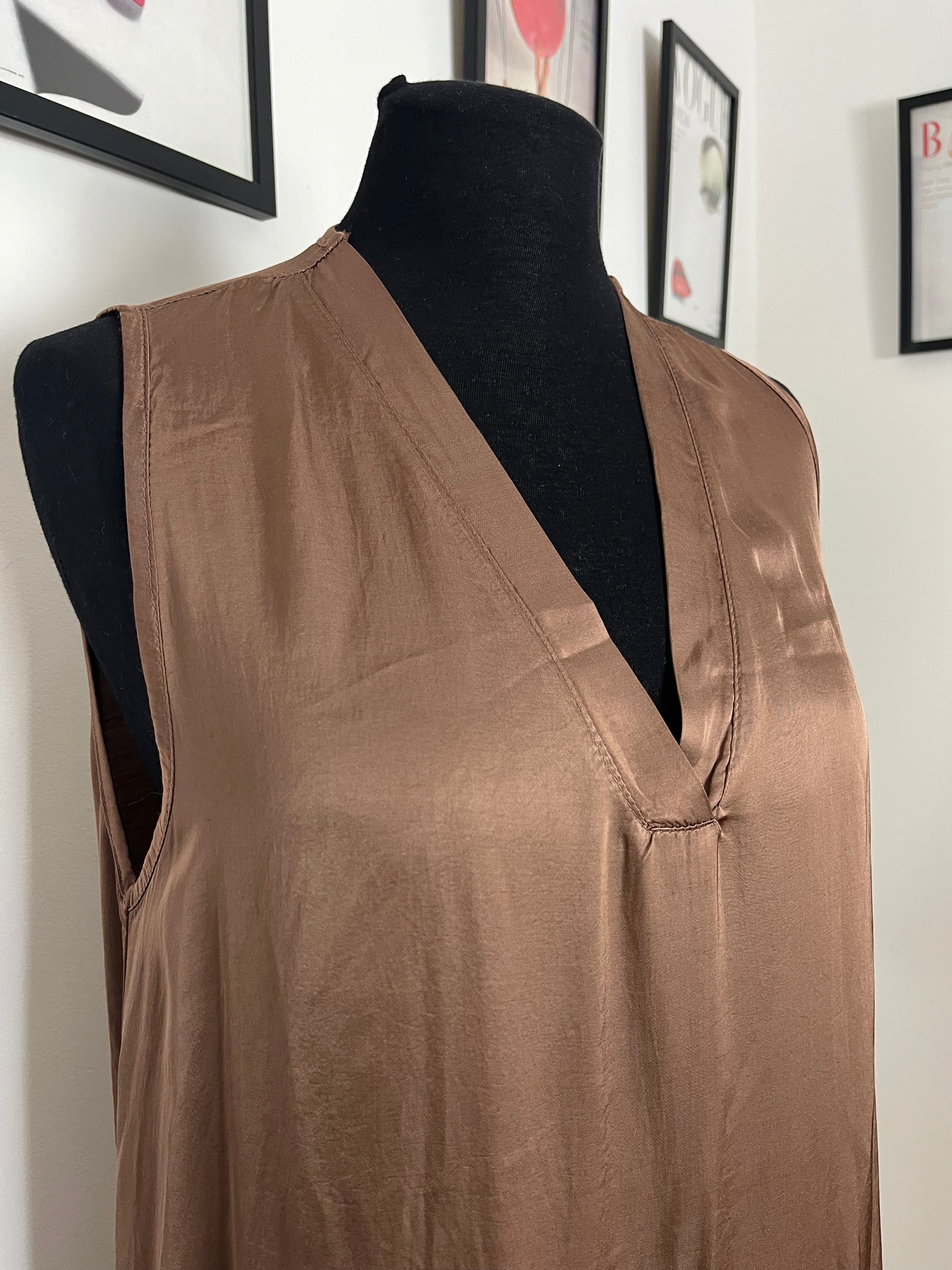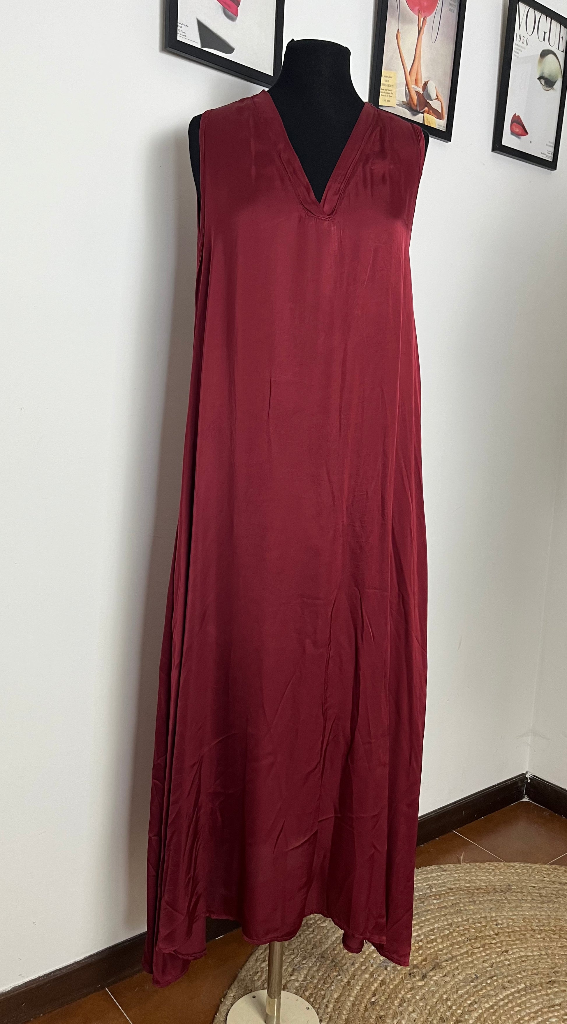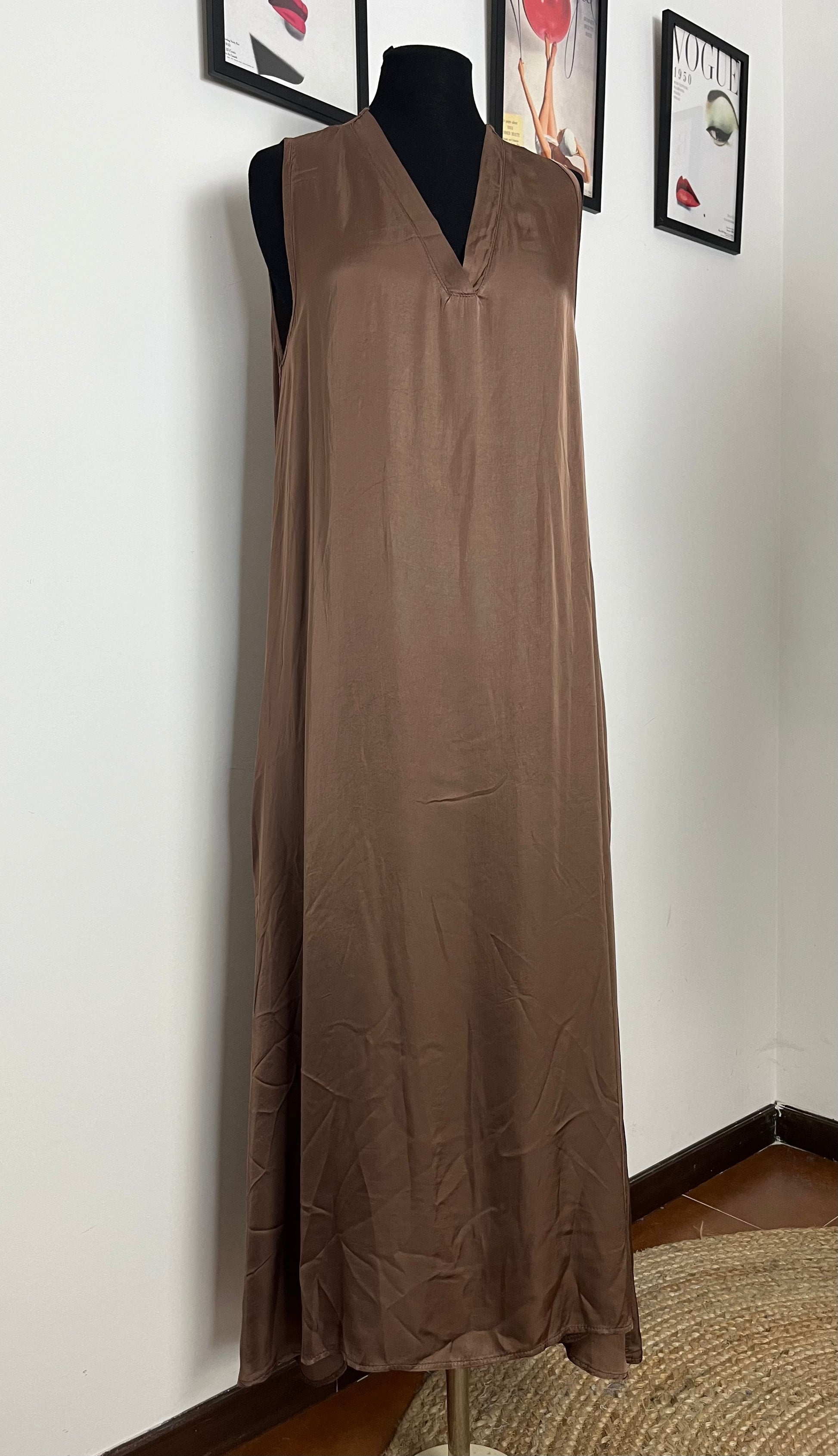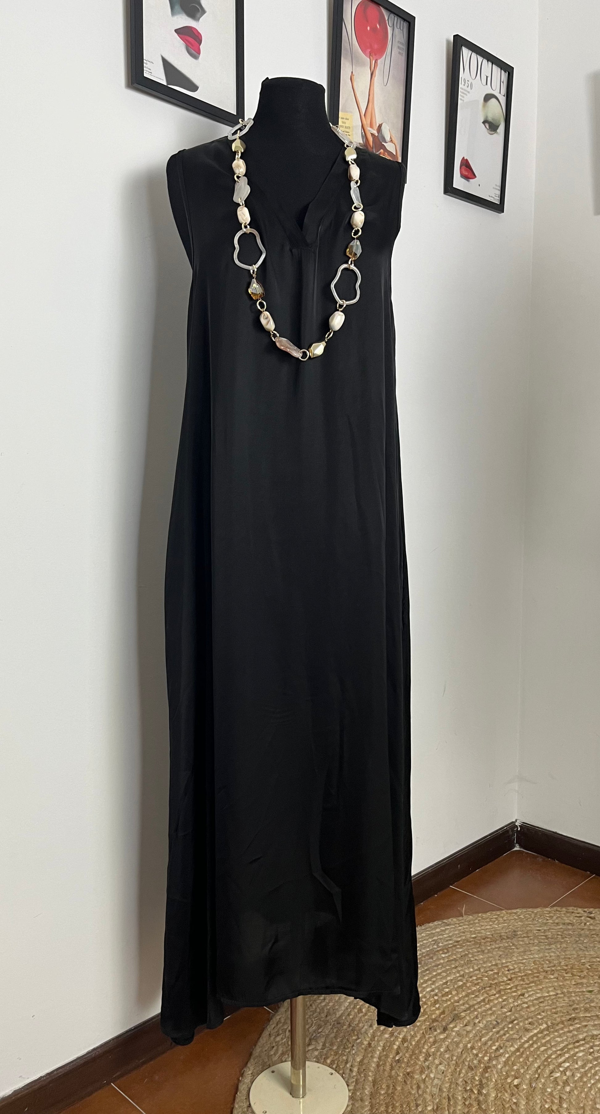 Abito lungo in viscosa. Scollatura a V, smanicato. Taglio dritto, tasche laterali a scomparsa.