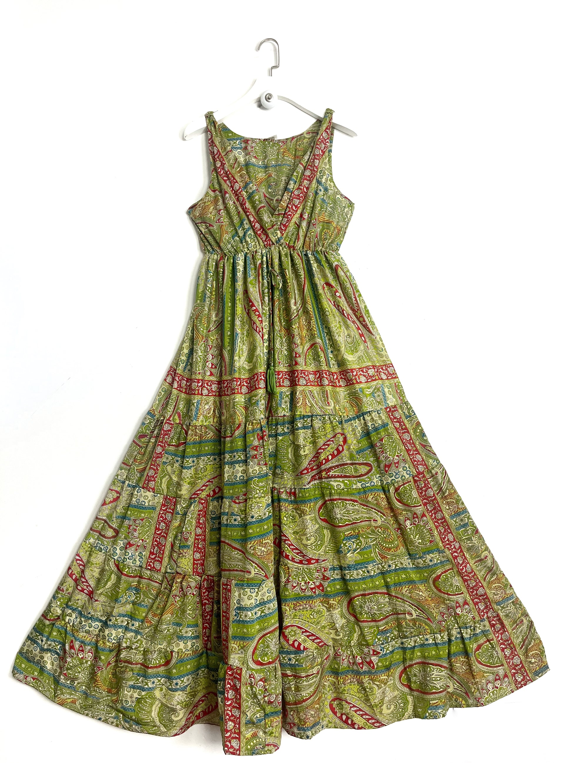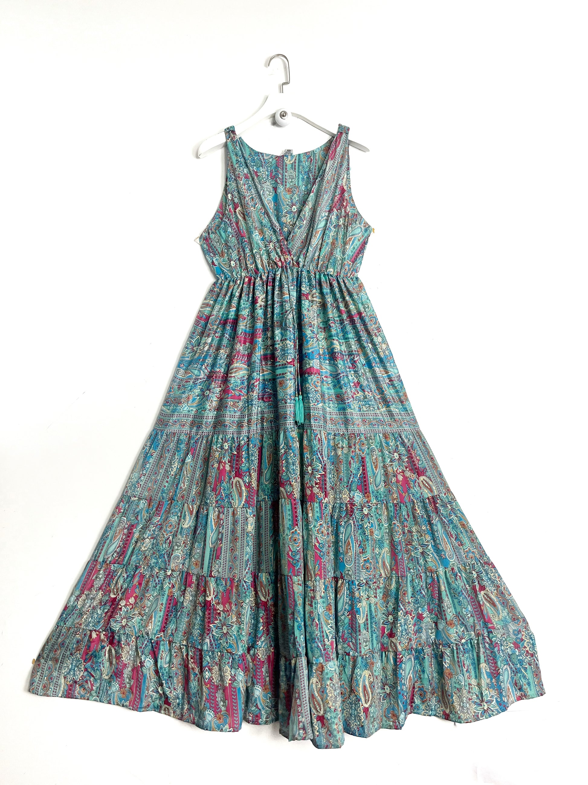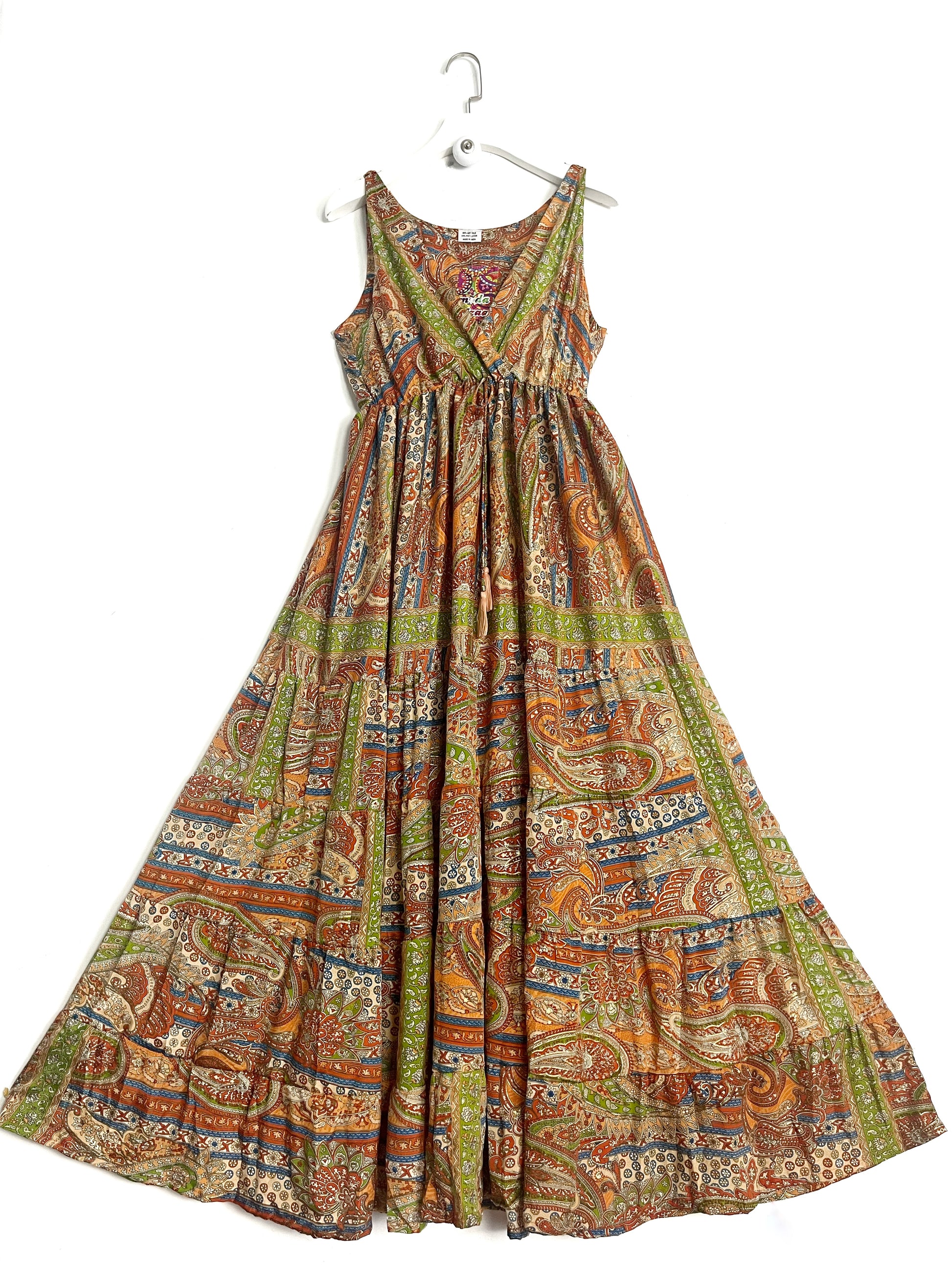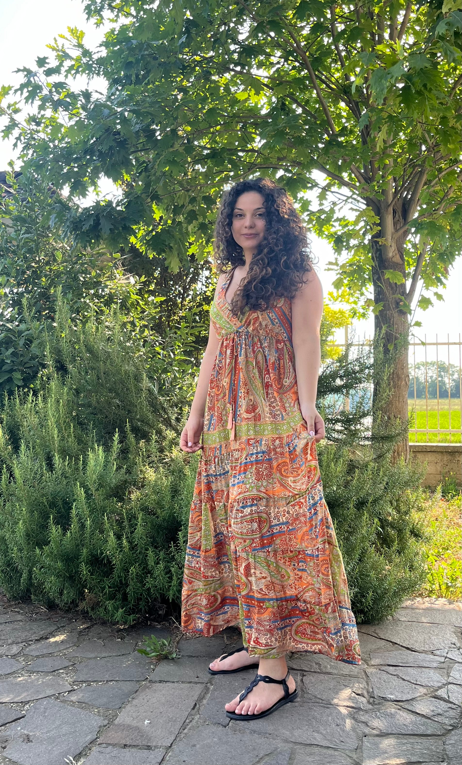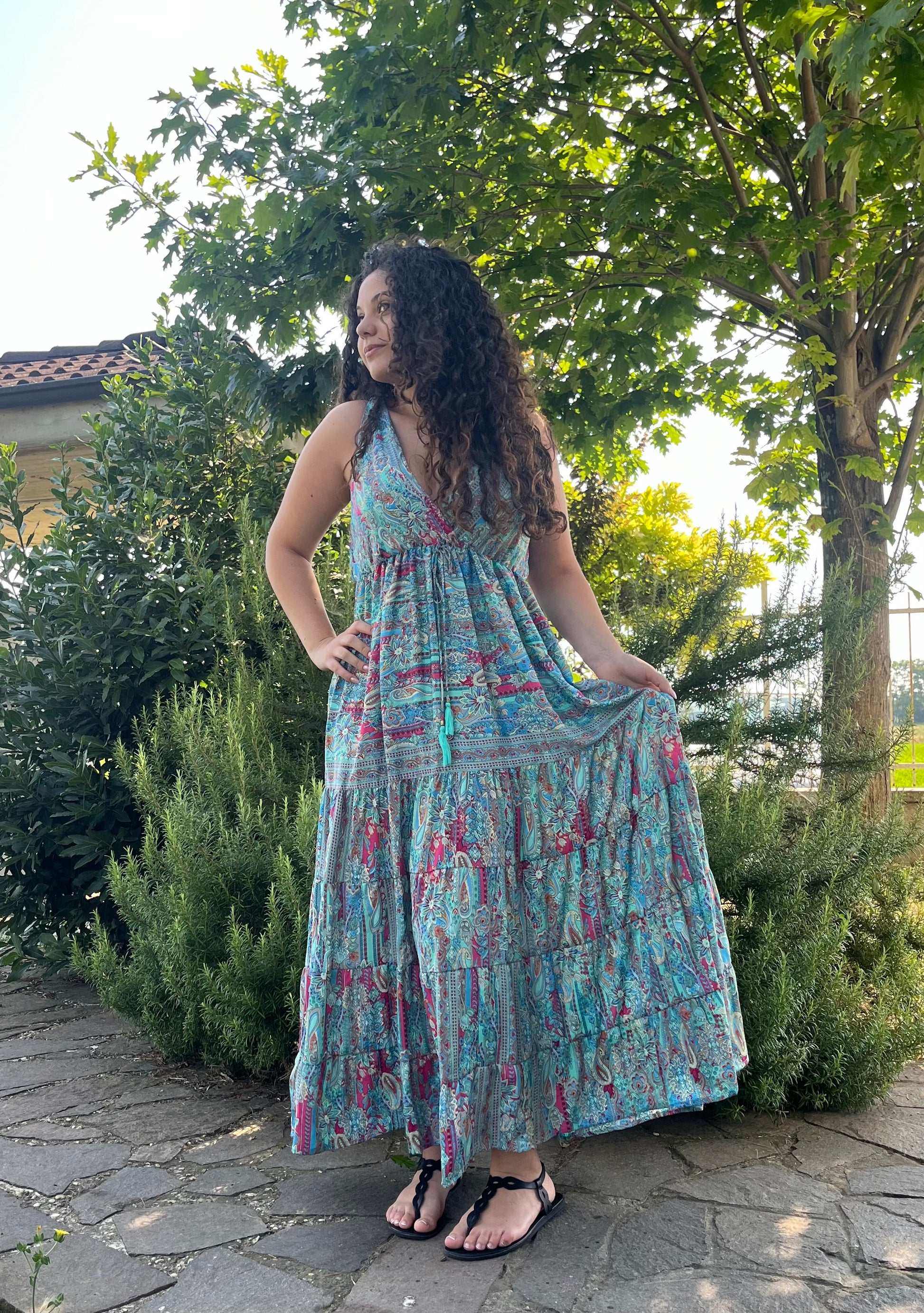 Abito in seta smanicato. Scollatura incrociata a V, elastico arricciato sotto il seno. Gonna lunga svasata con balze. Lunghezza che copre la caviglia