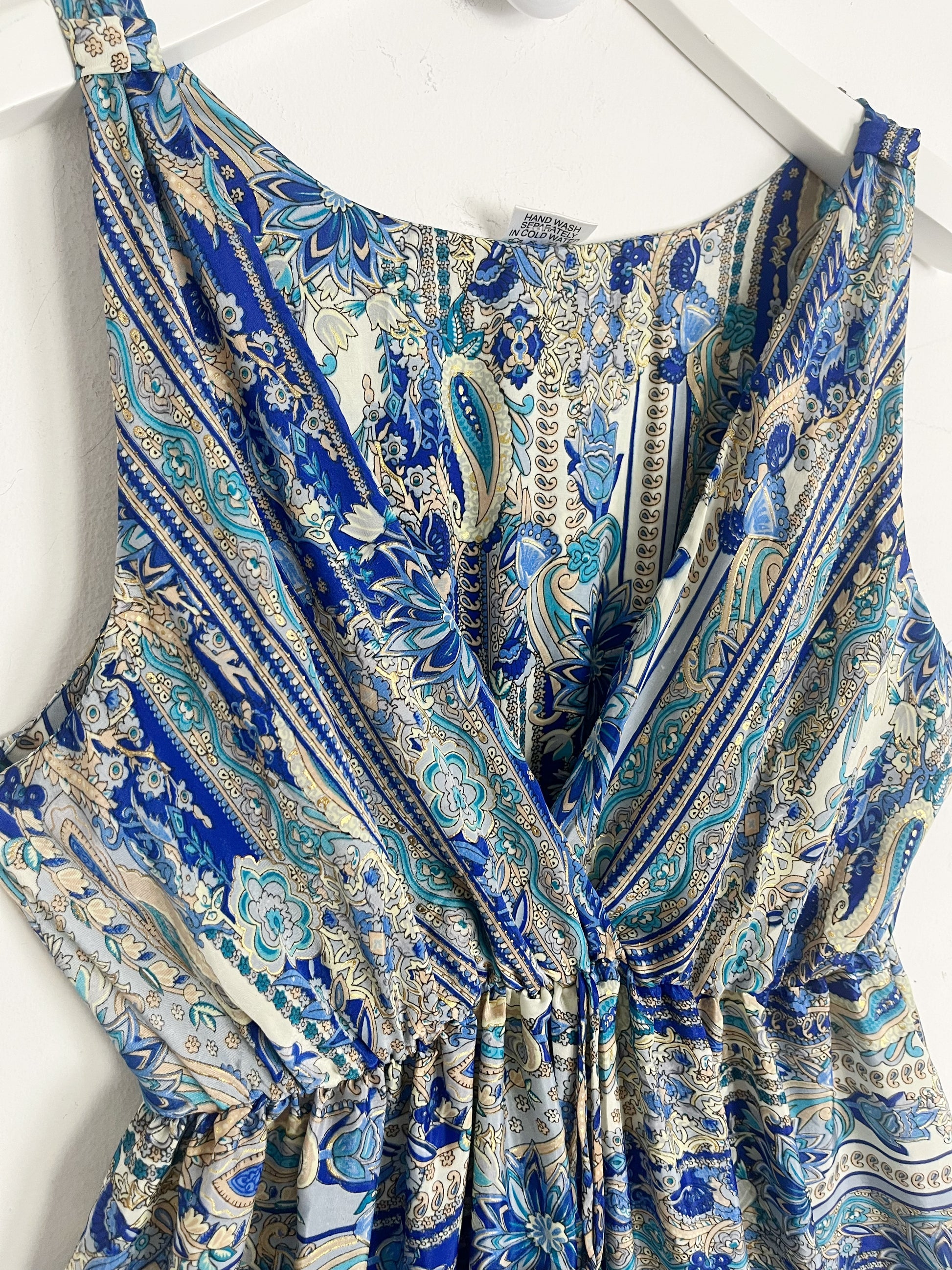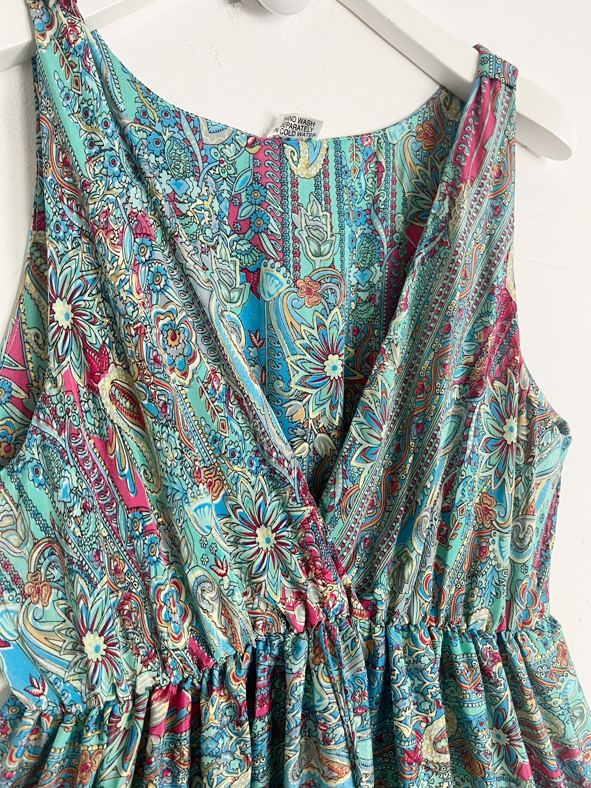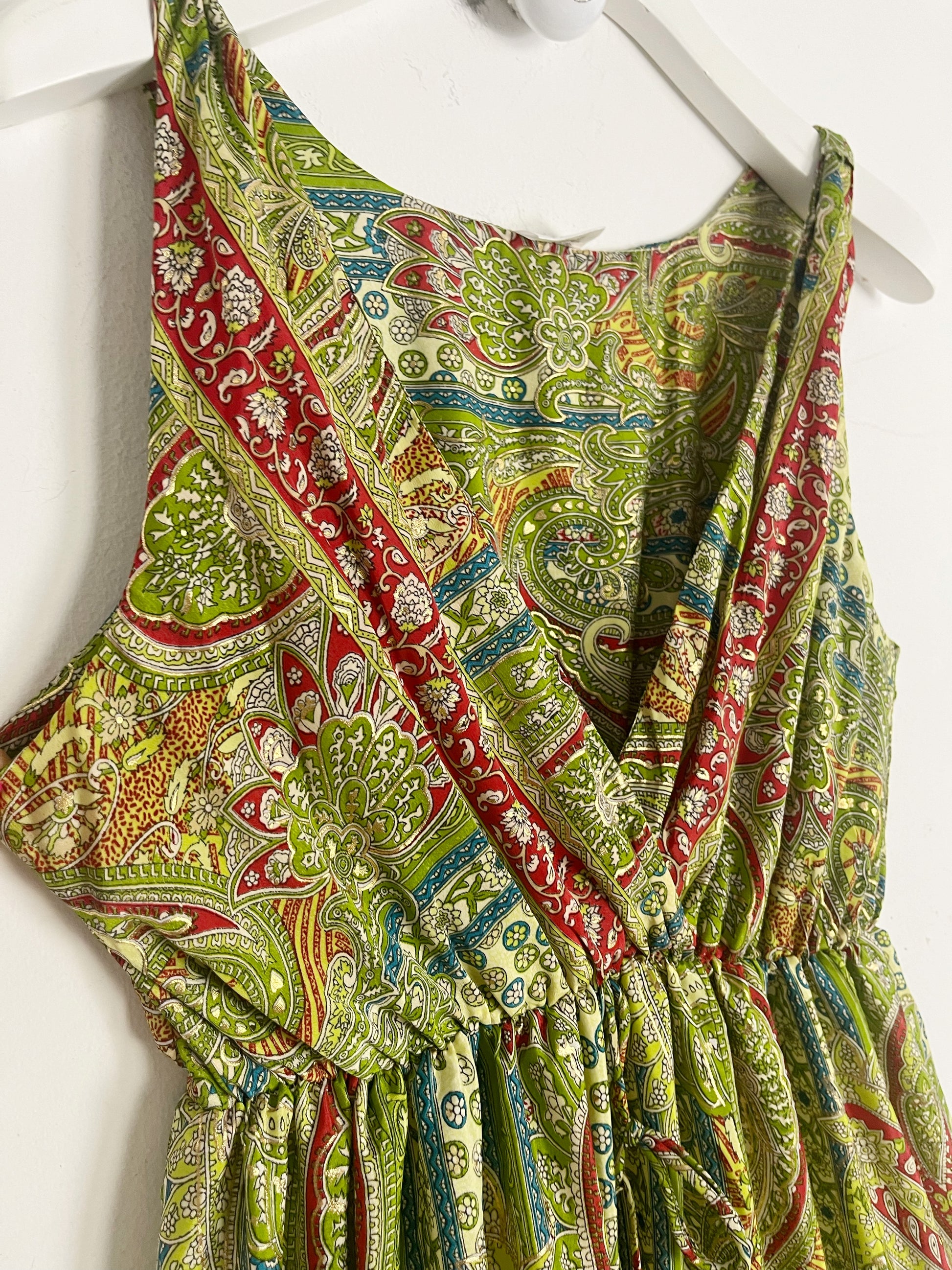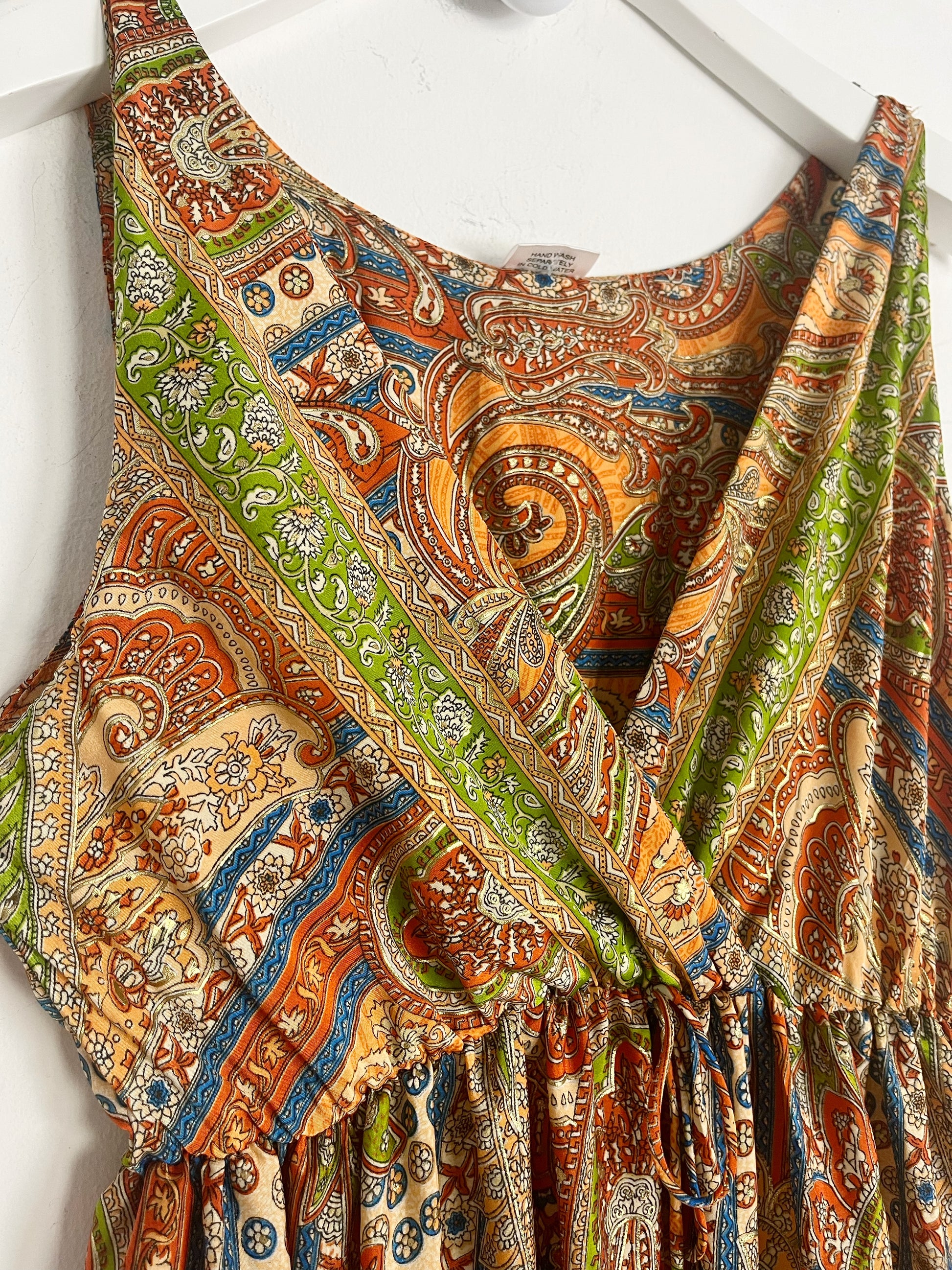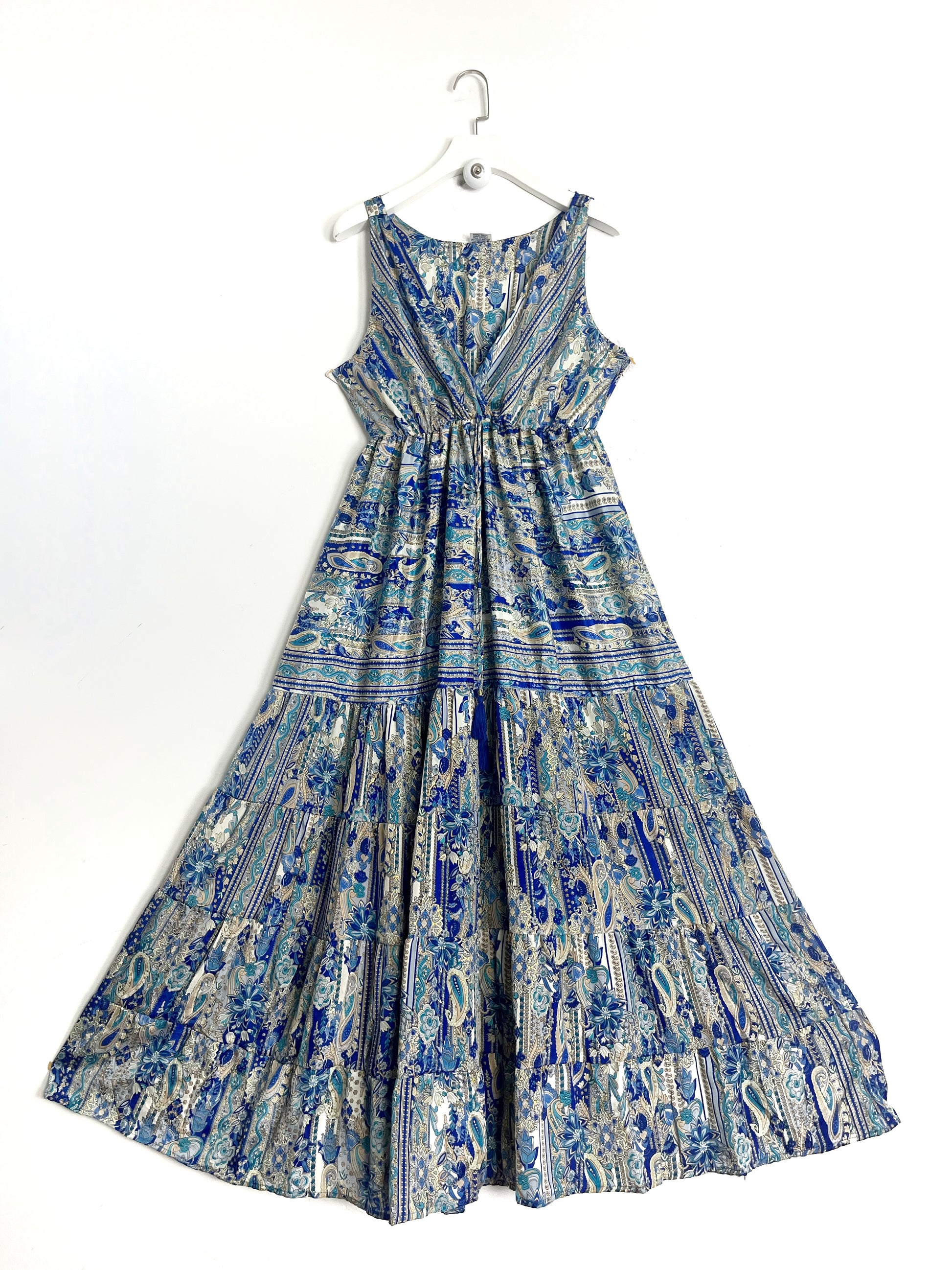 Abito in seta smanicato. Scollatura incrociata a V, elastico arricciato sotto il seno. Gonna lunga svasata con balze. Lunghezza che copre la caviglia