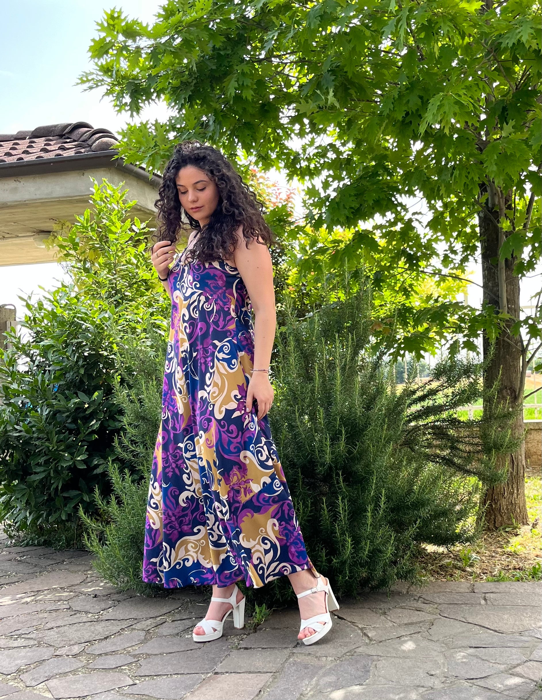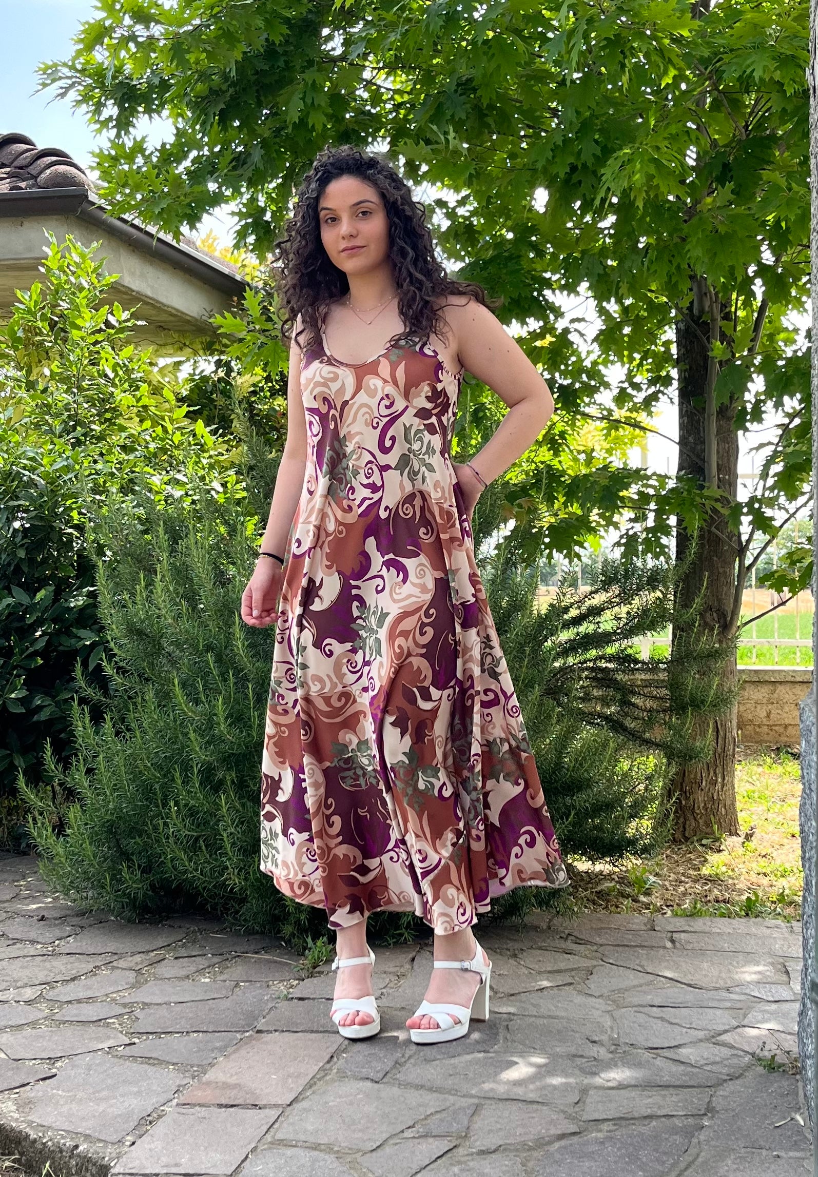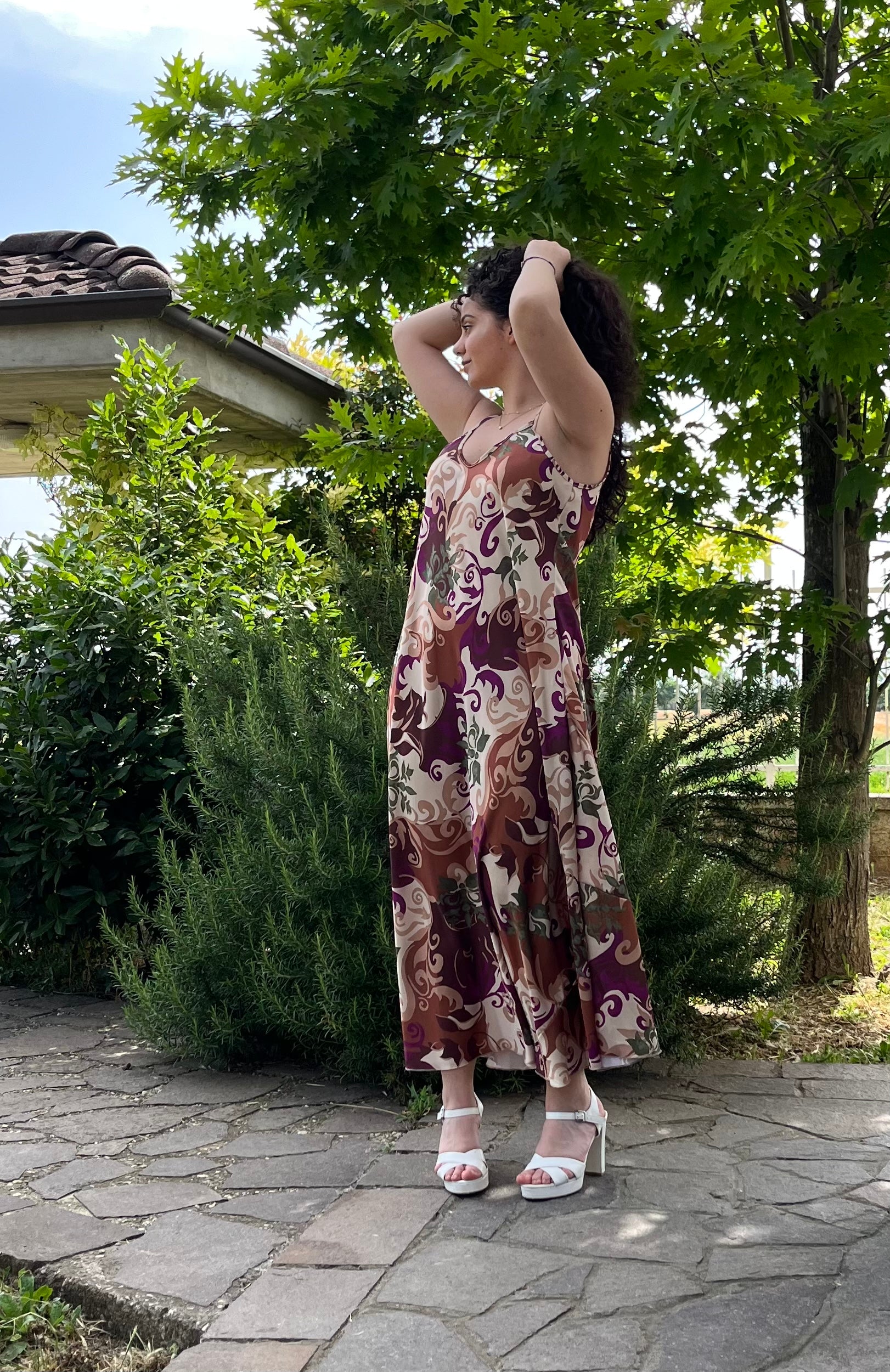 Abito in raso con spalline sottili. Scollatura a V. Lunghezza si piedi.