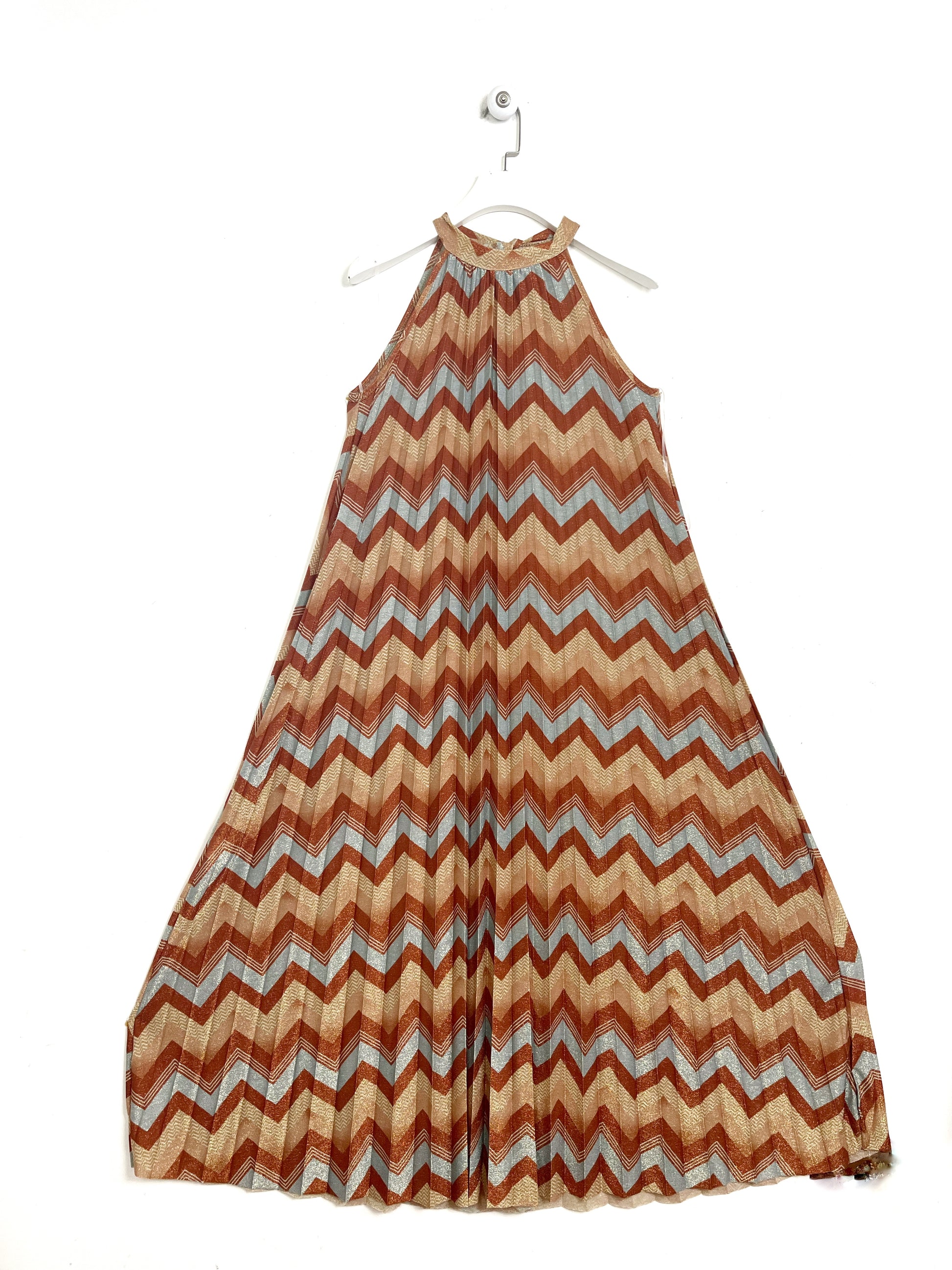 Abito lungo in viscosa e lurex, tutto plissettato. Scollatura all'americana, chiusa da un fiocco dietro il collo. Gonna lunga ampiamente svasata.