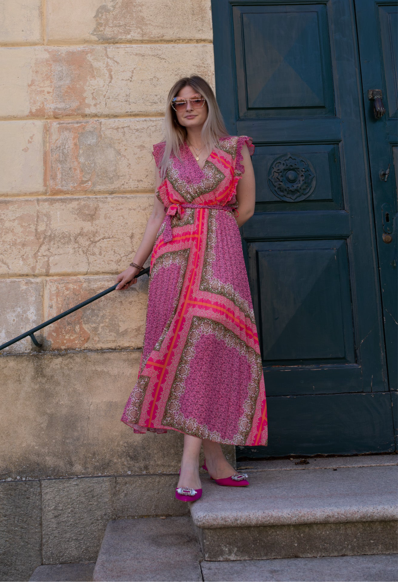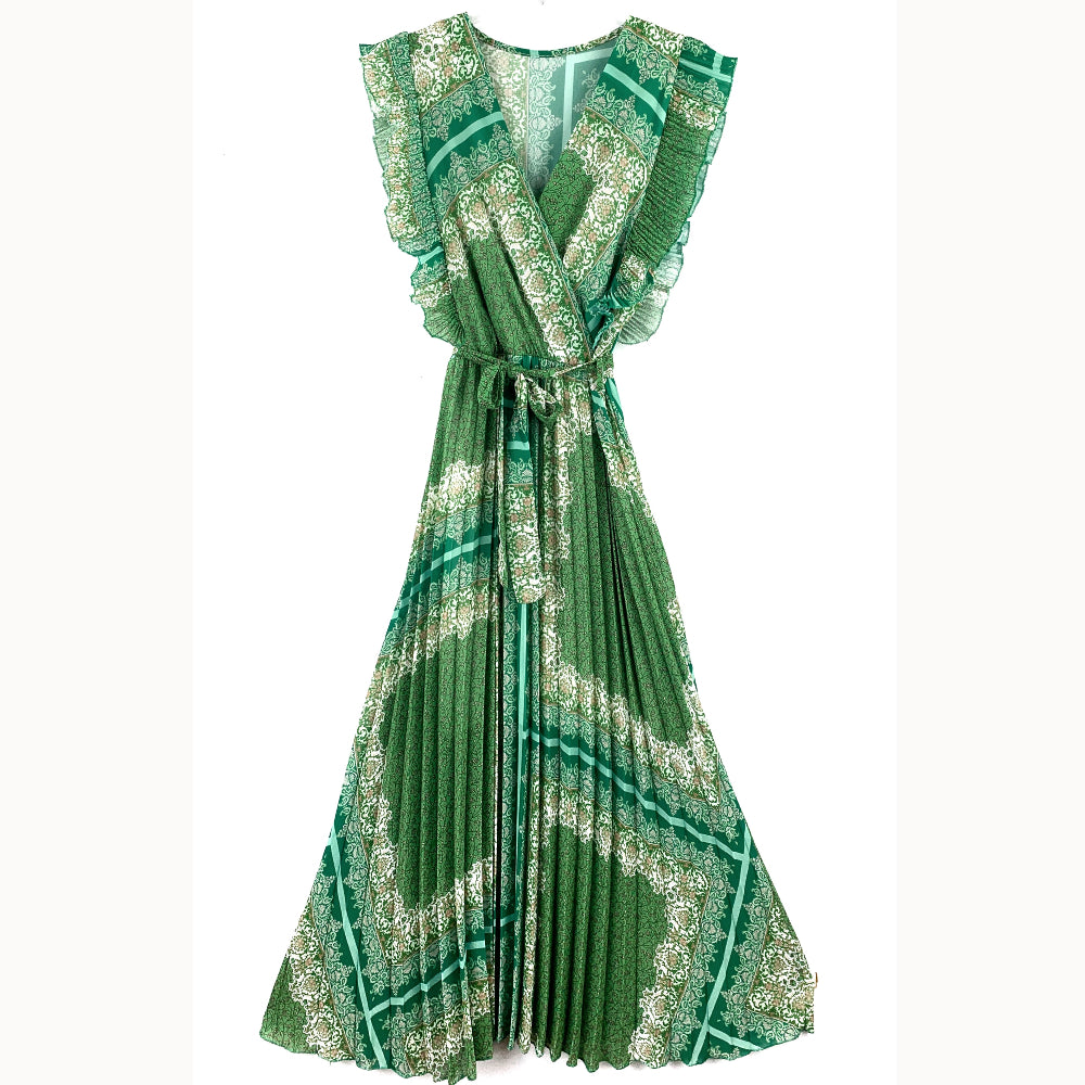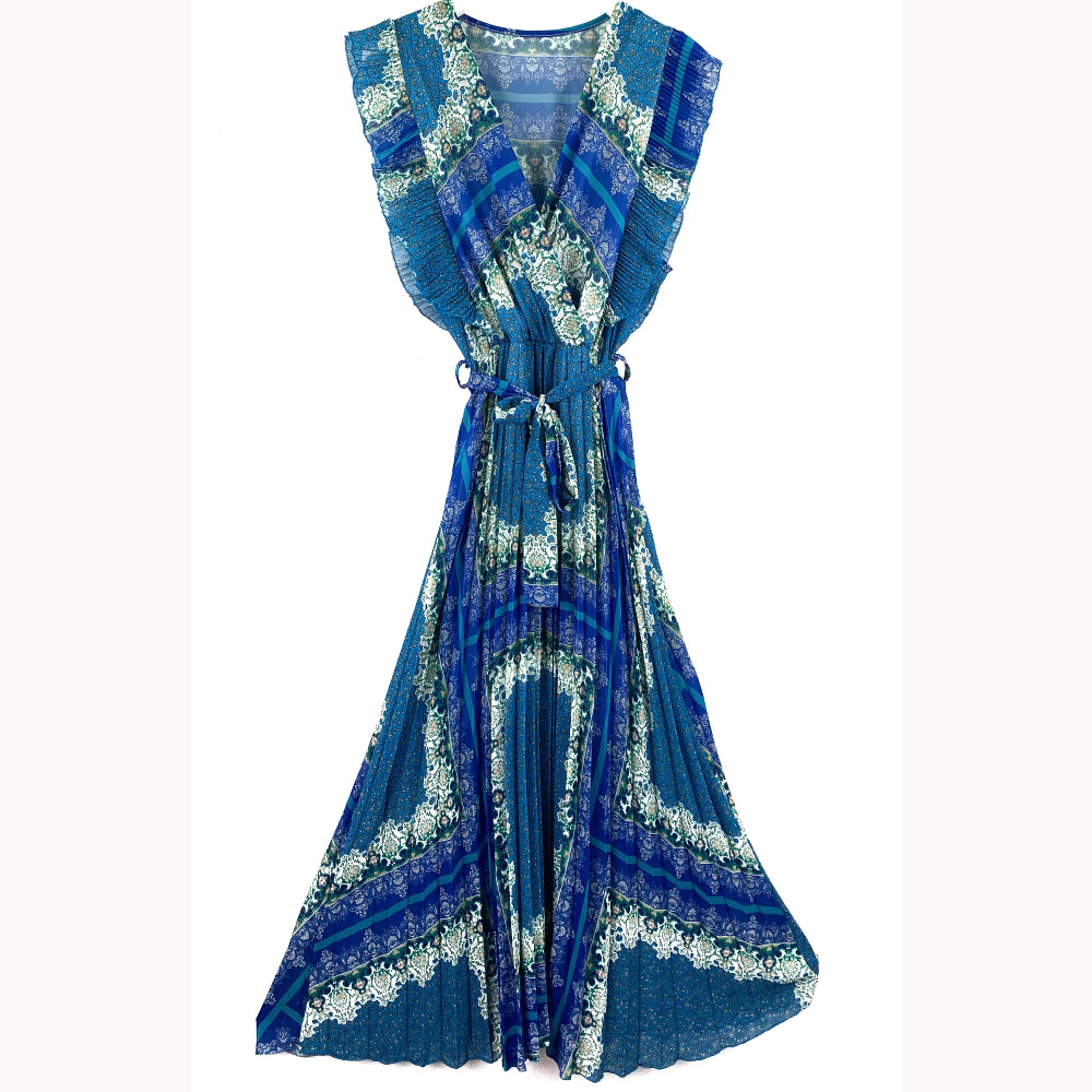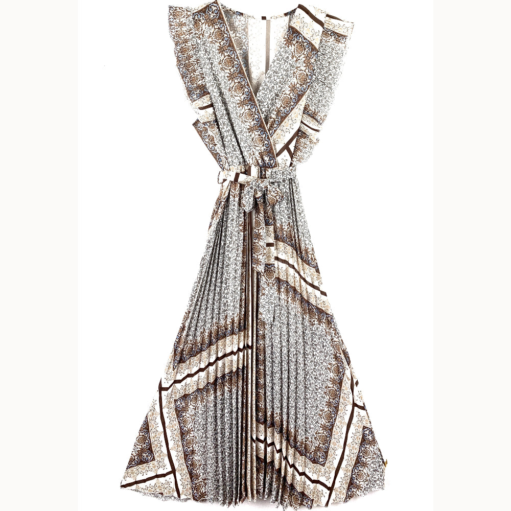 Abito con scollo incrociato, smanicato con velette plissettate. Arricciato con elastico in vita, passanti e cintura in tessuto. Gonna svasata plissettata, lunghezza alla caviglia. Con sottoveste.