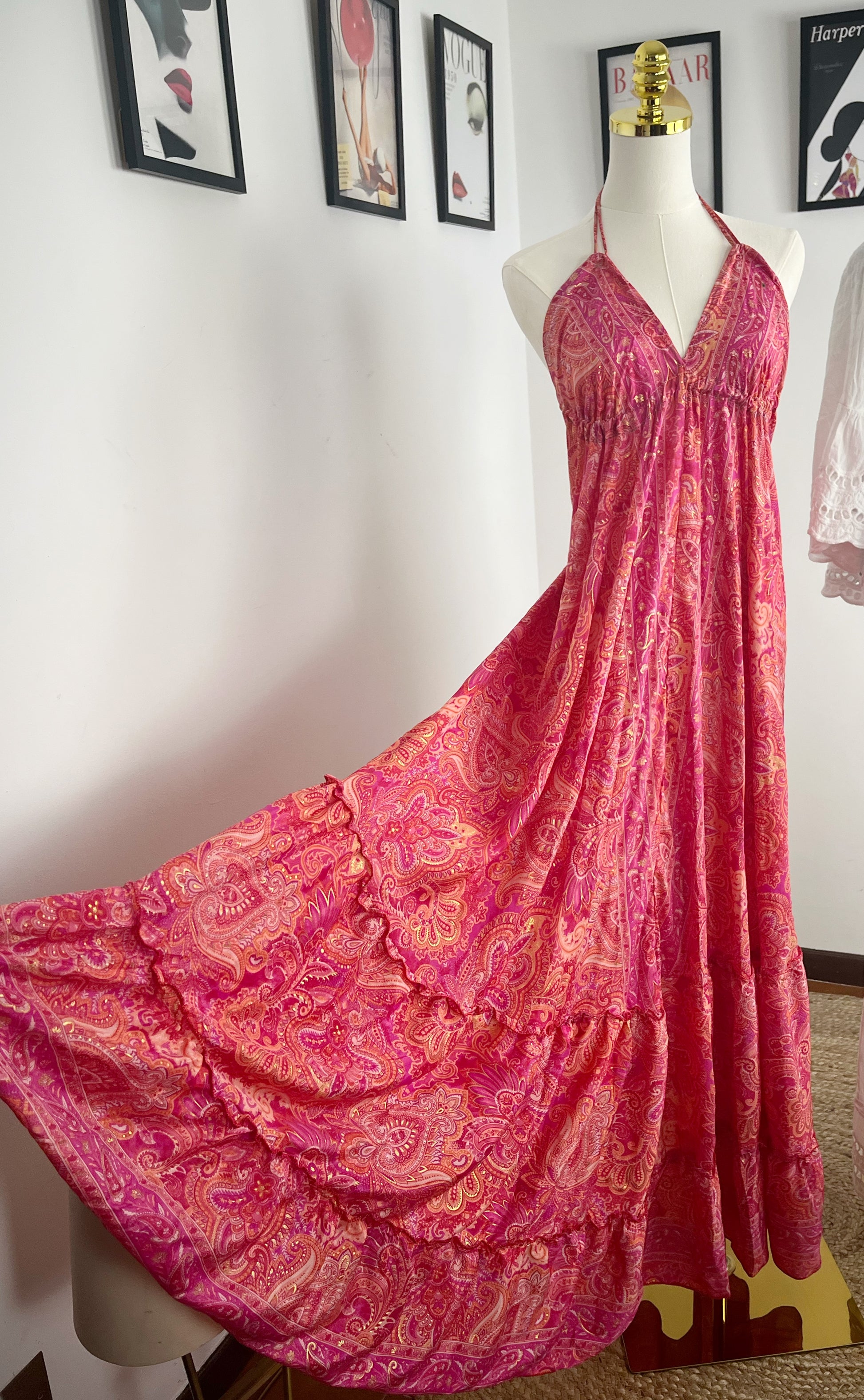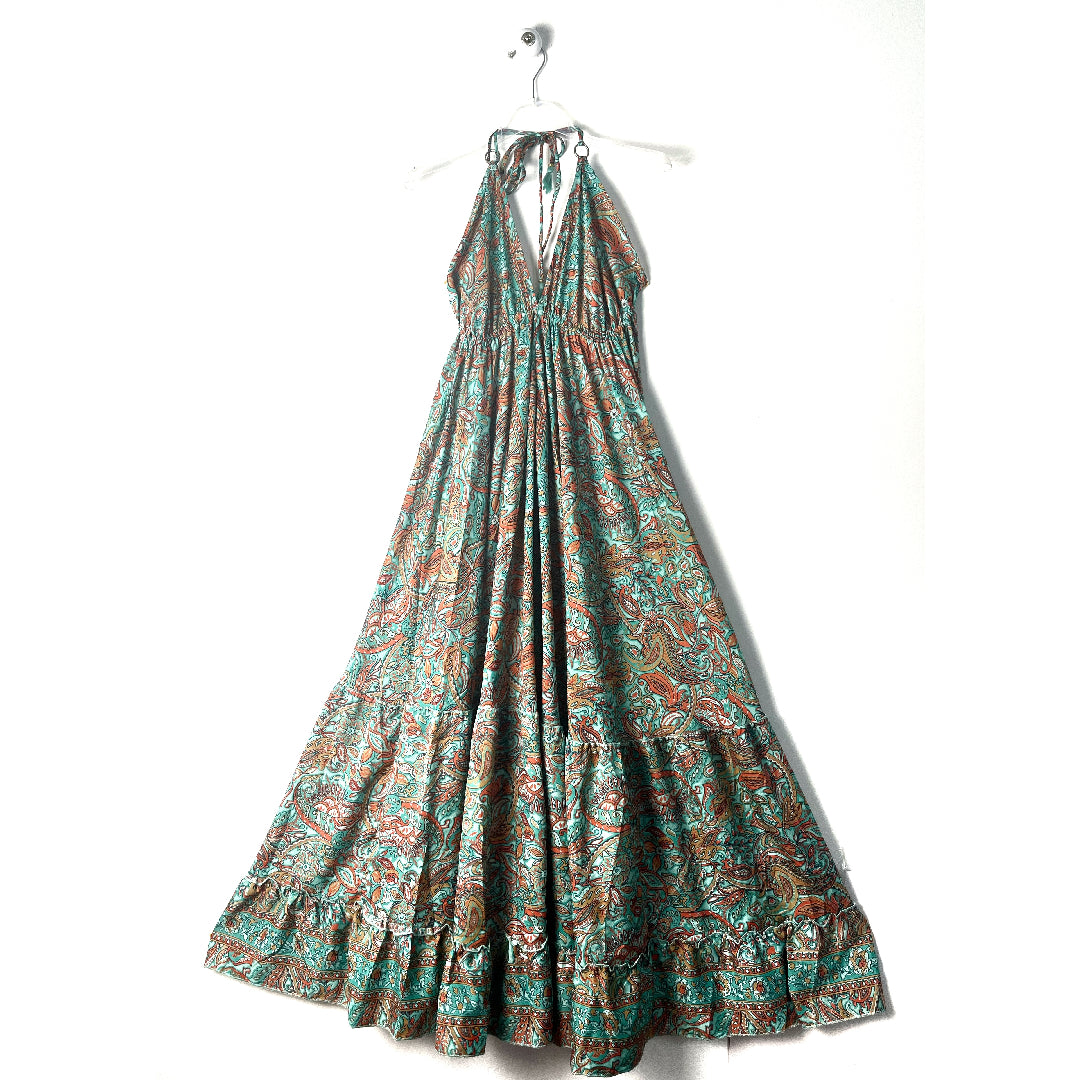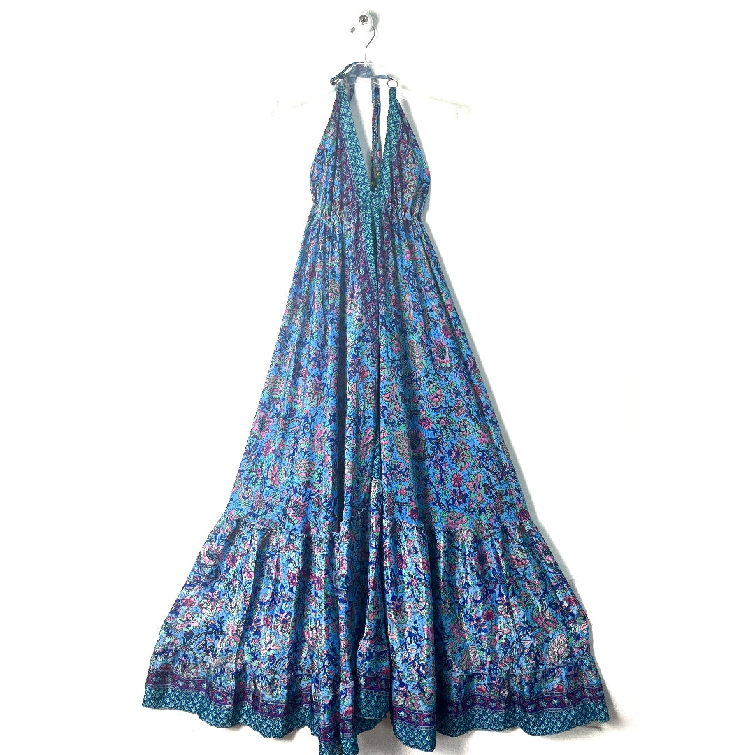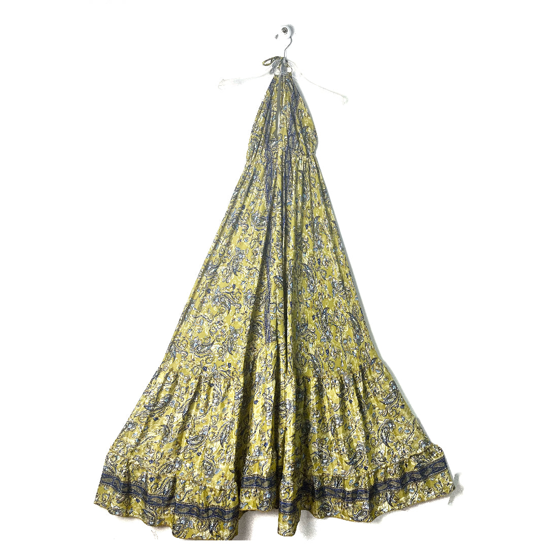 Abito lungo in misto seta, scollatura a V. Schiena nuda. Gonna lunga molto svasata, con balza finale. Cordonino con nappina legato dietro.