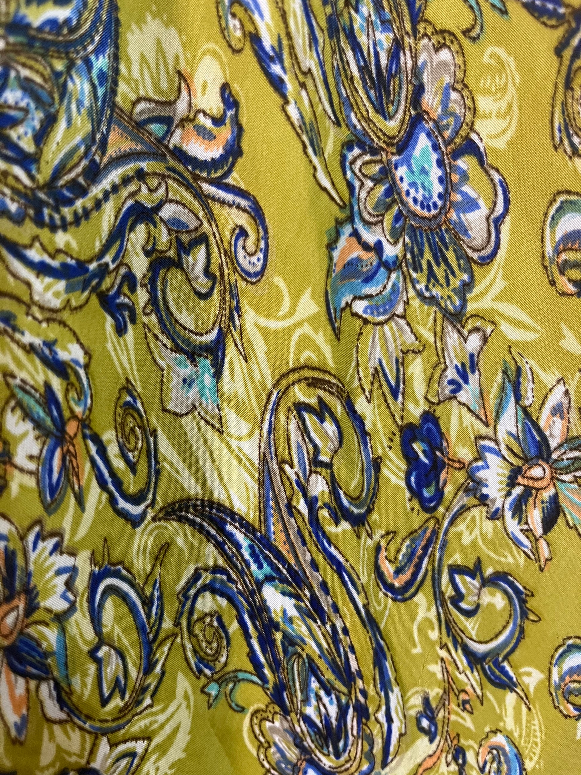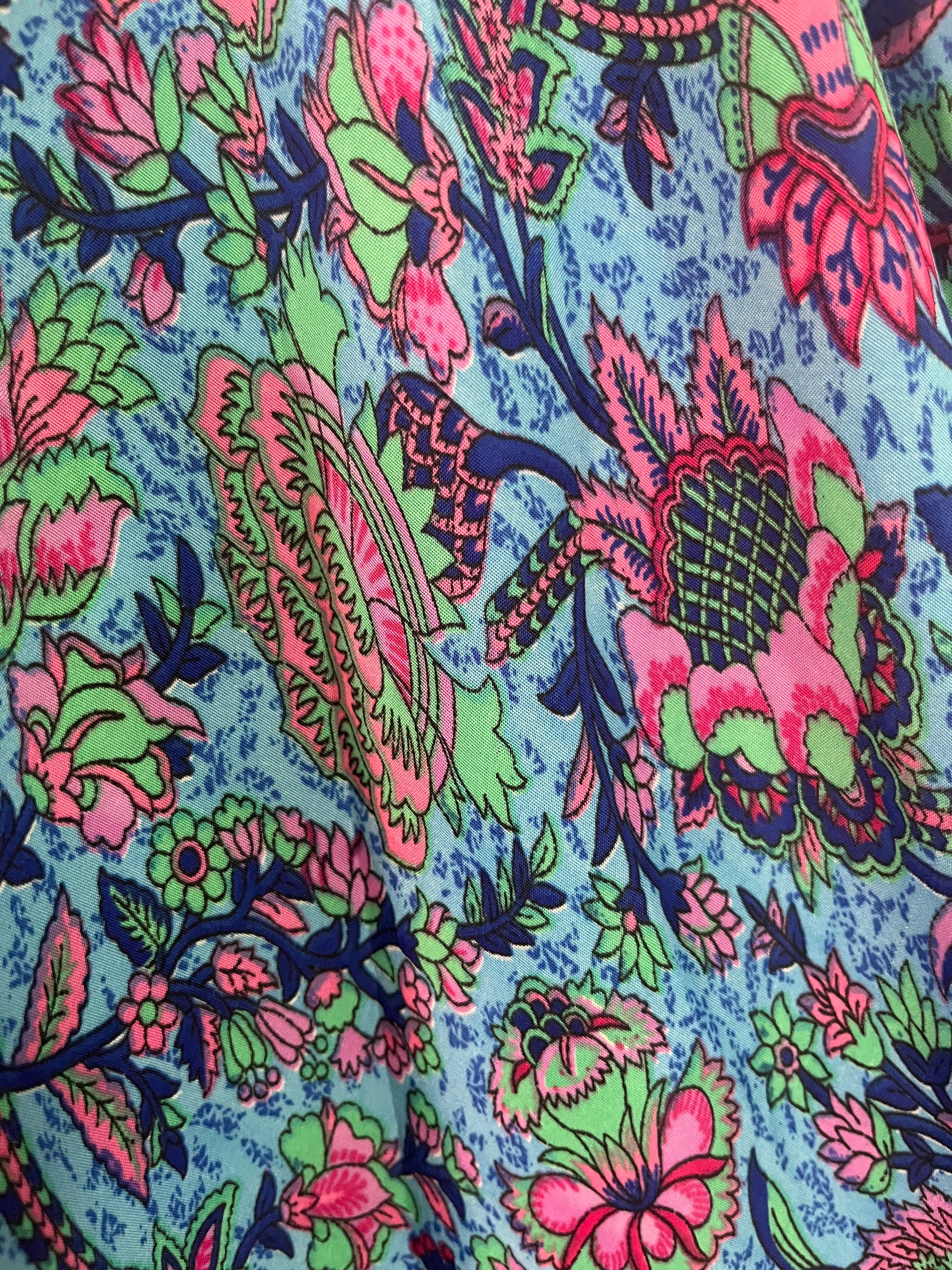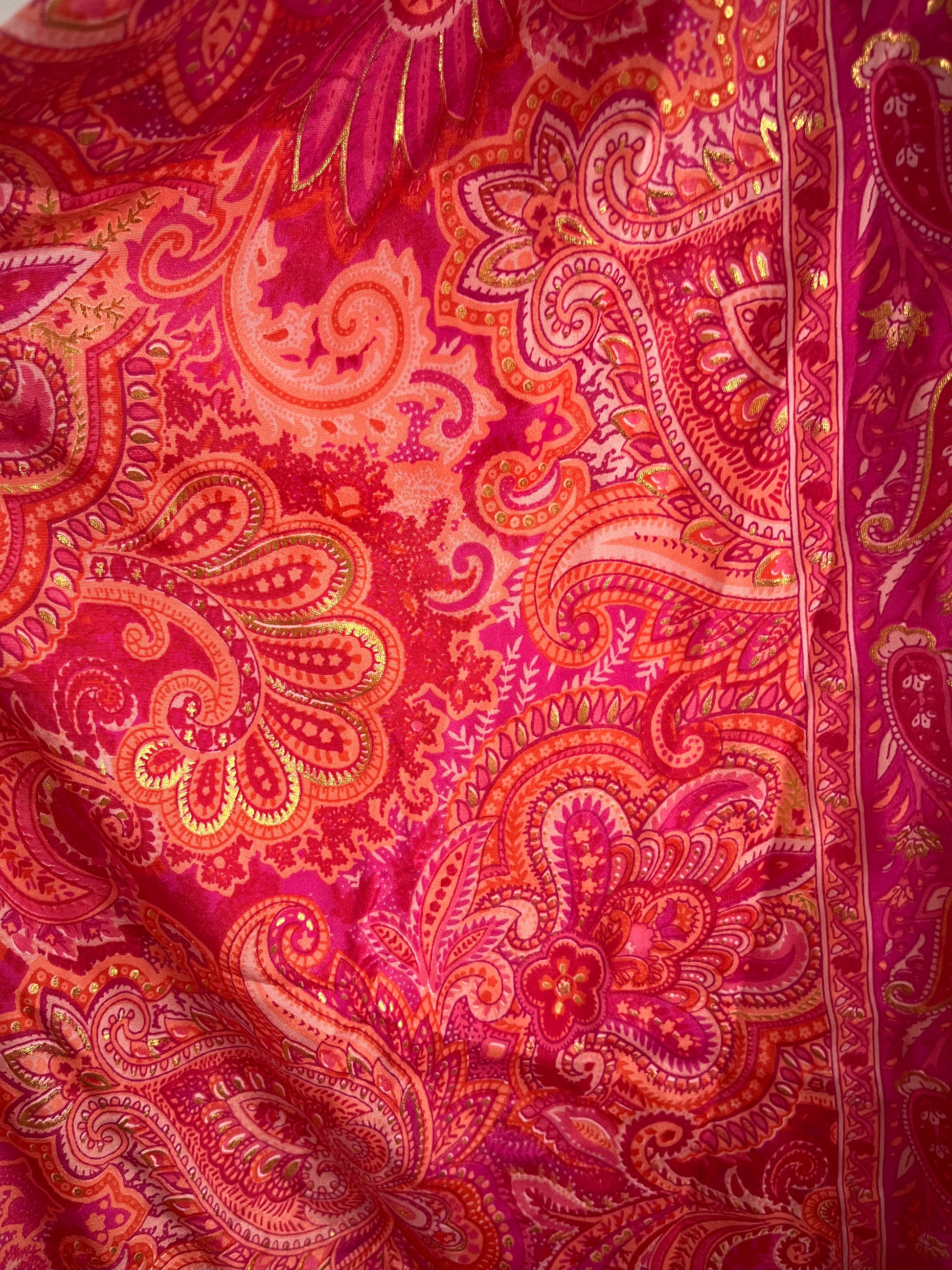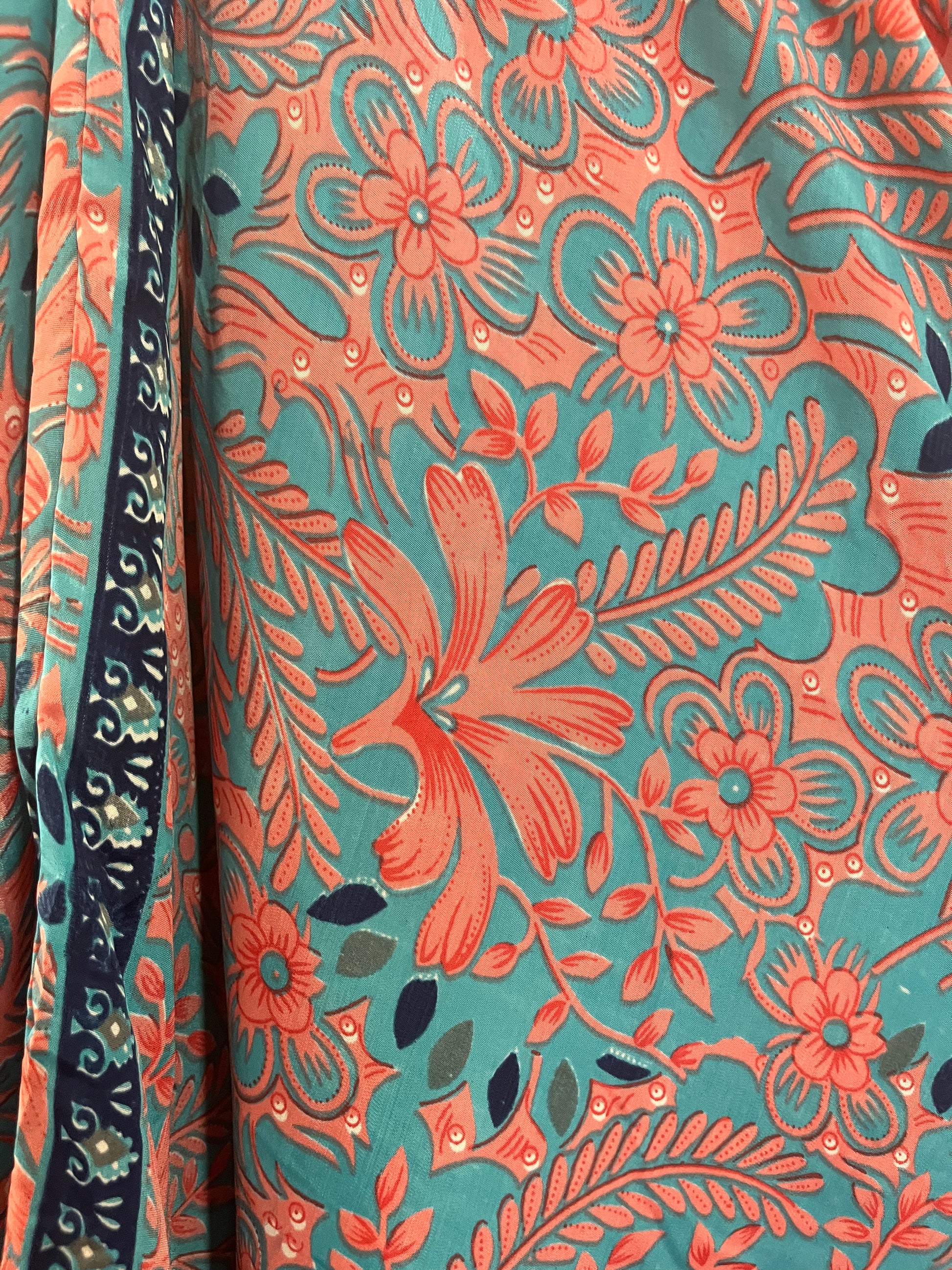 Abito lungo in misto seta, scollatura a V. Schiena nuda. Gonna lunga molto svasata, con balza finale. Cordonino con nappina legato dietro.