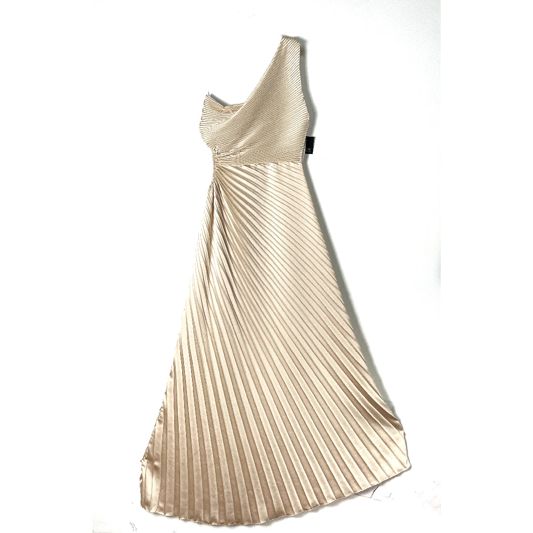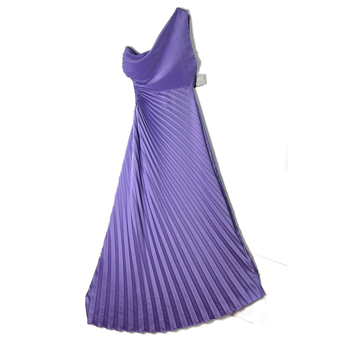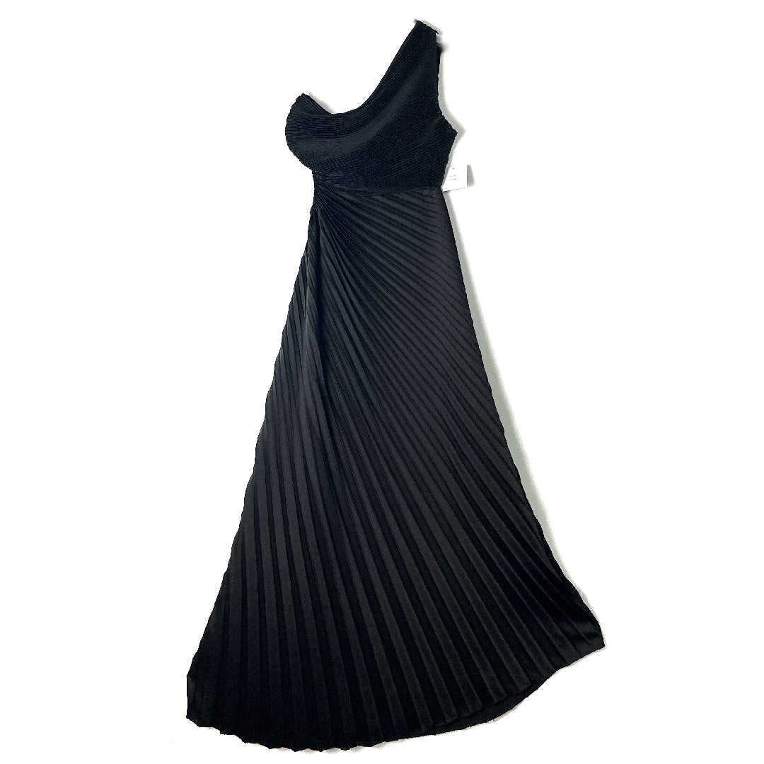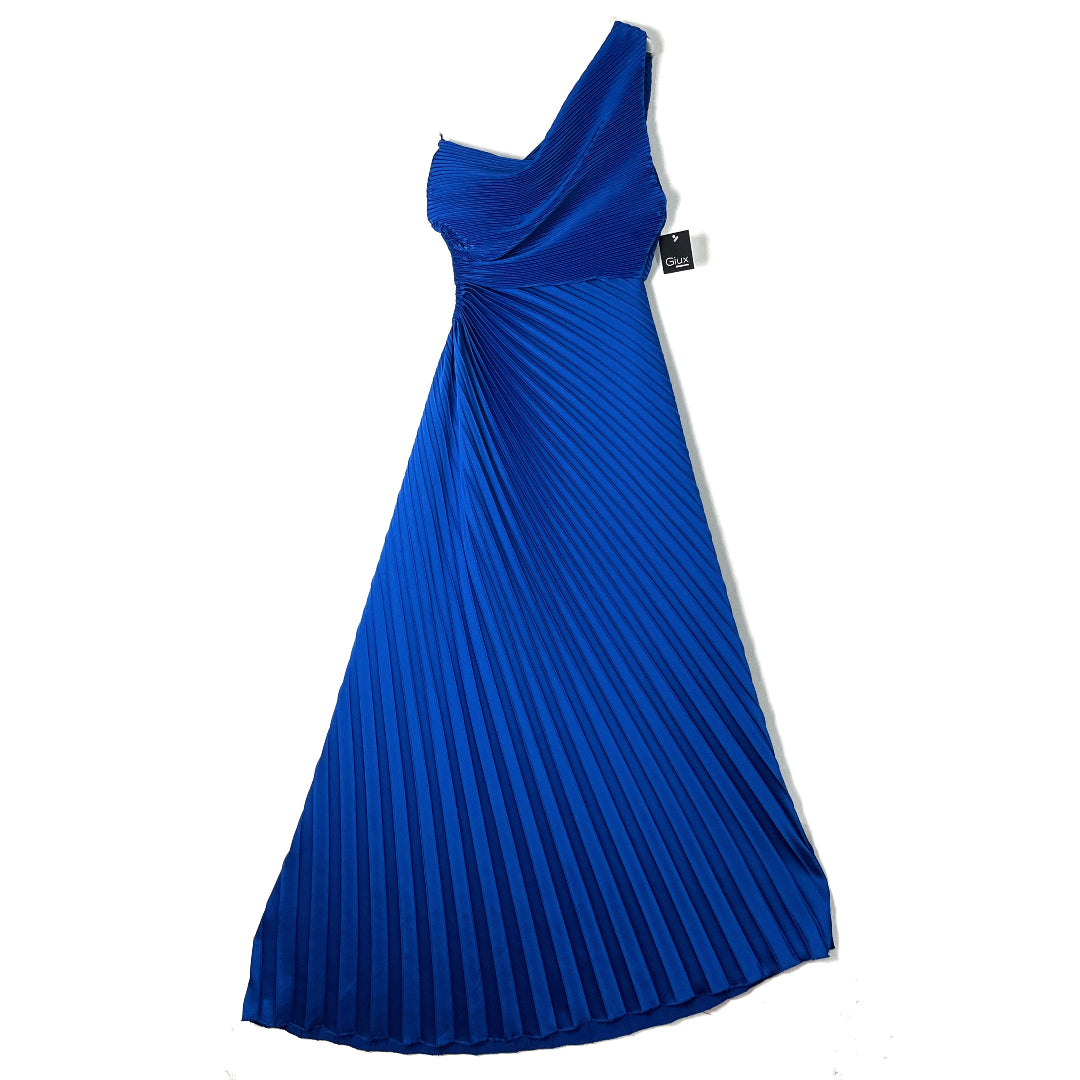 Abito monospalla. Corpetto drappeggiato, gonna plissettata asimmetrica. Goccia sul fianco.