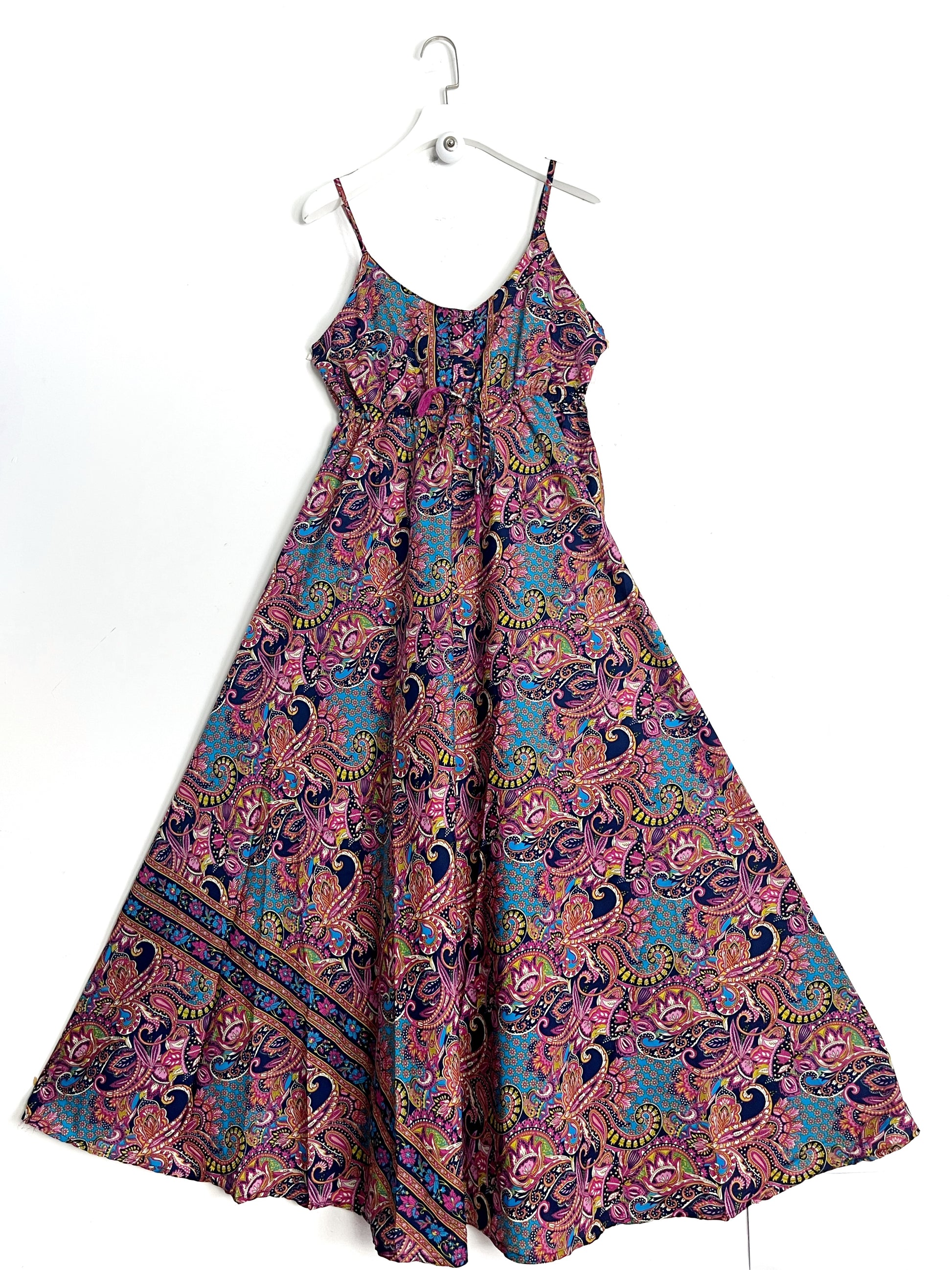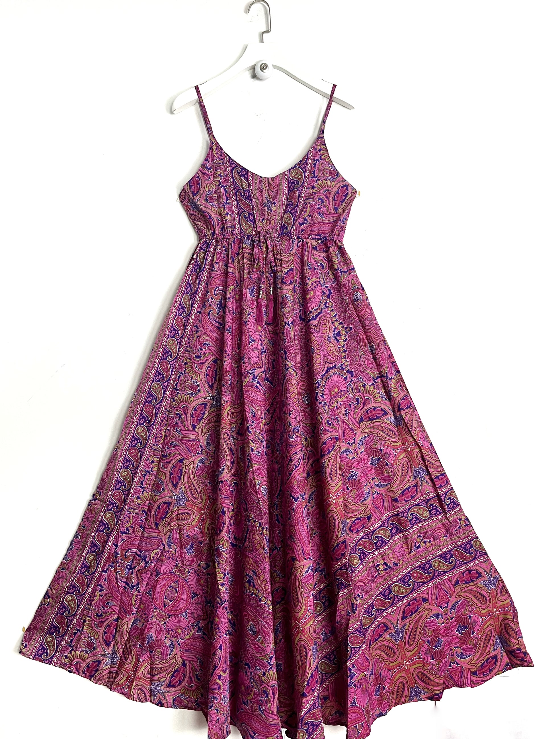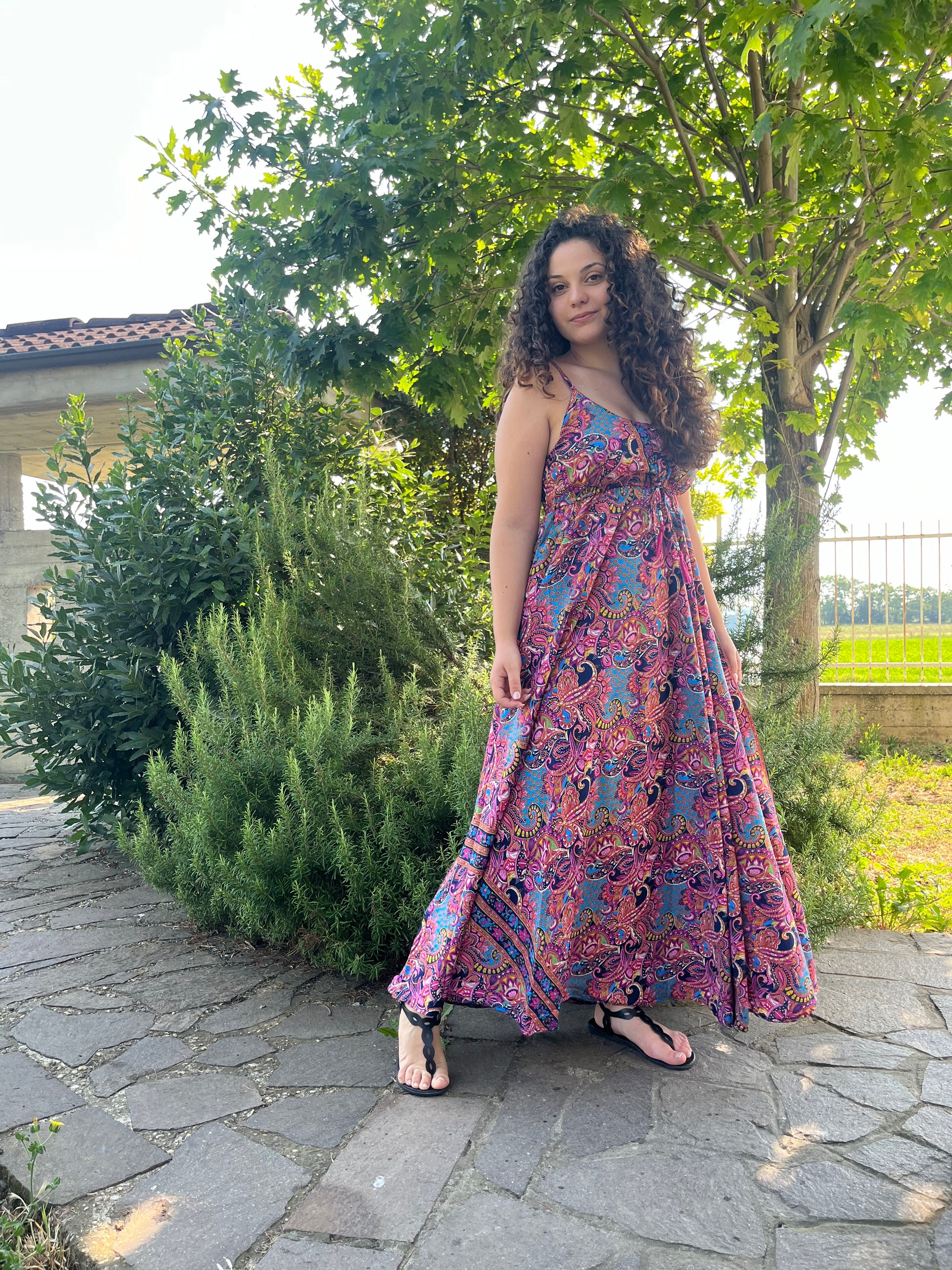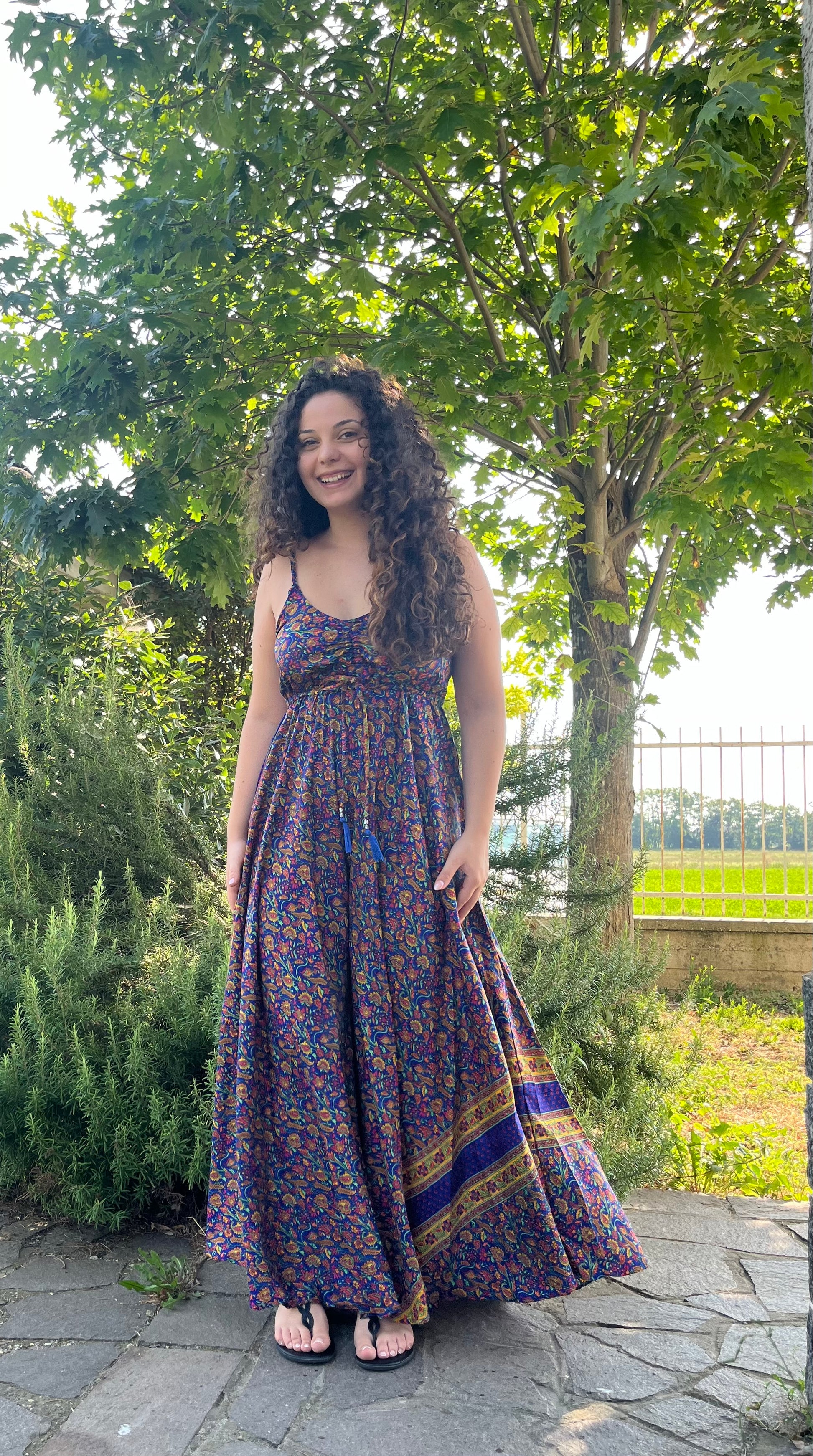 Abito in seta con spalline sottili regolabili. Arricciatura sotto il seno, corpetto dietro in punto amore. Gonna lunga svasata.