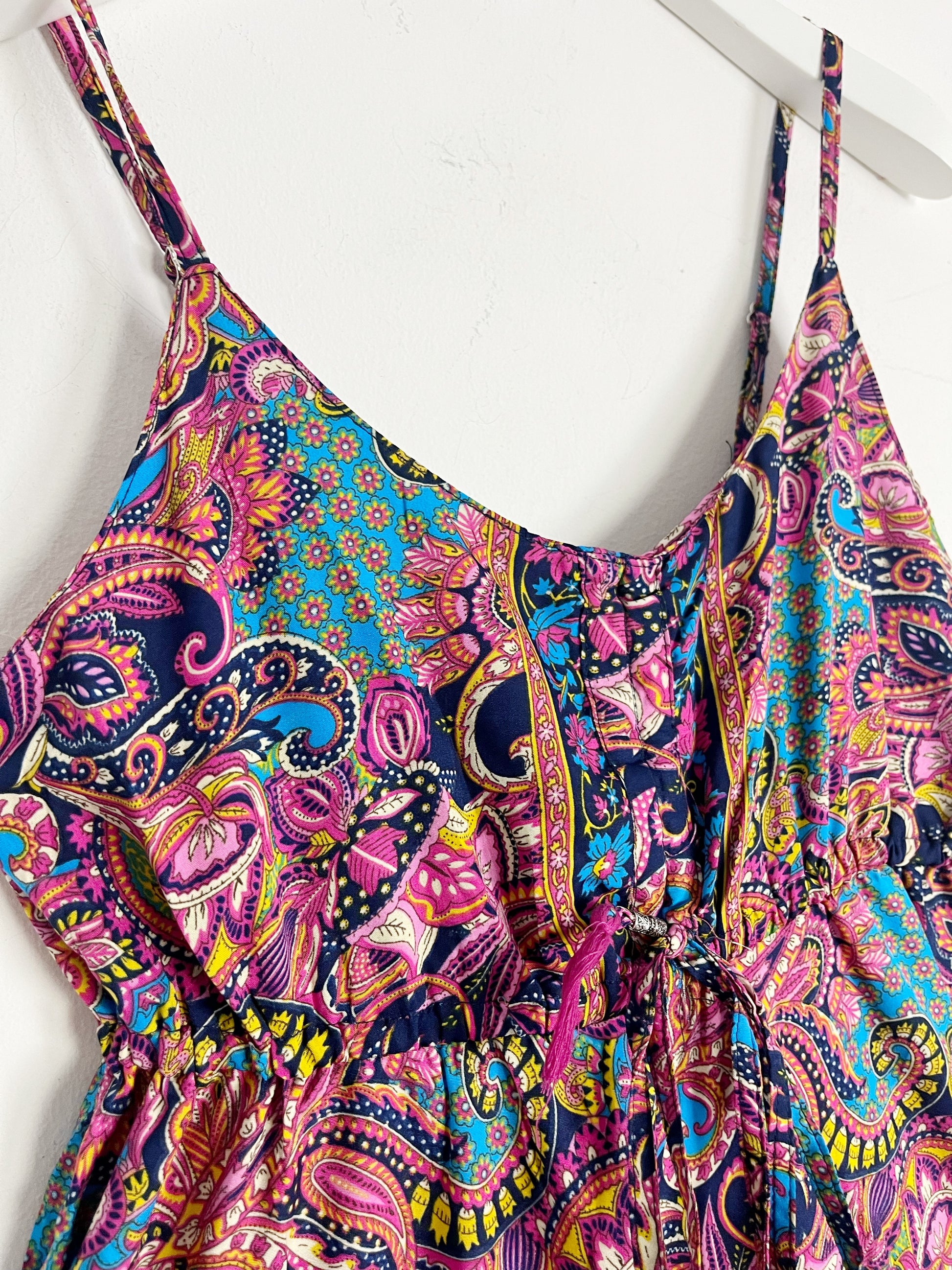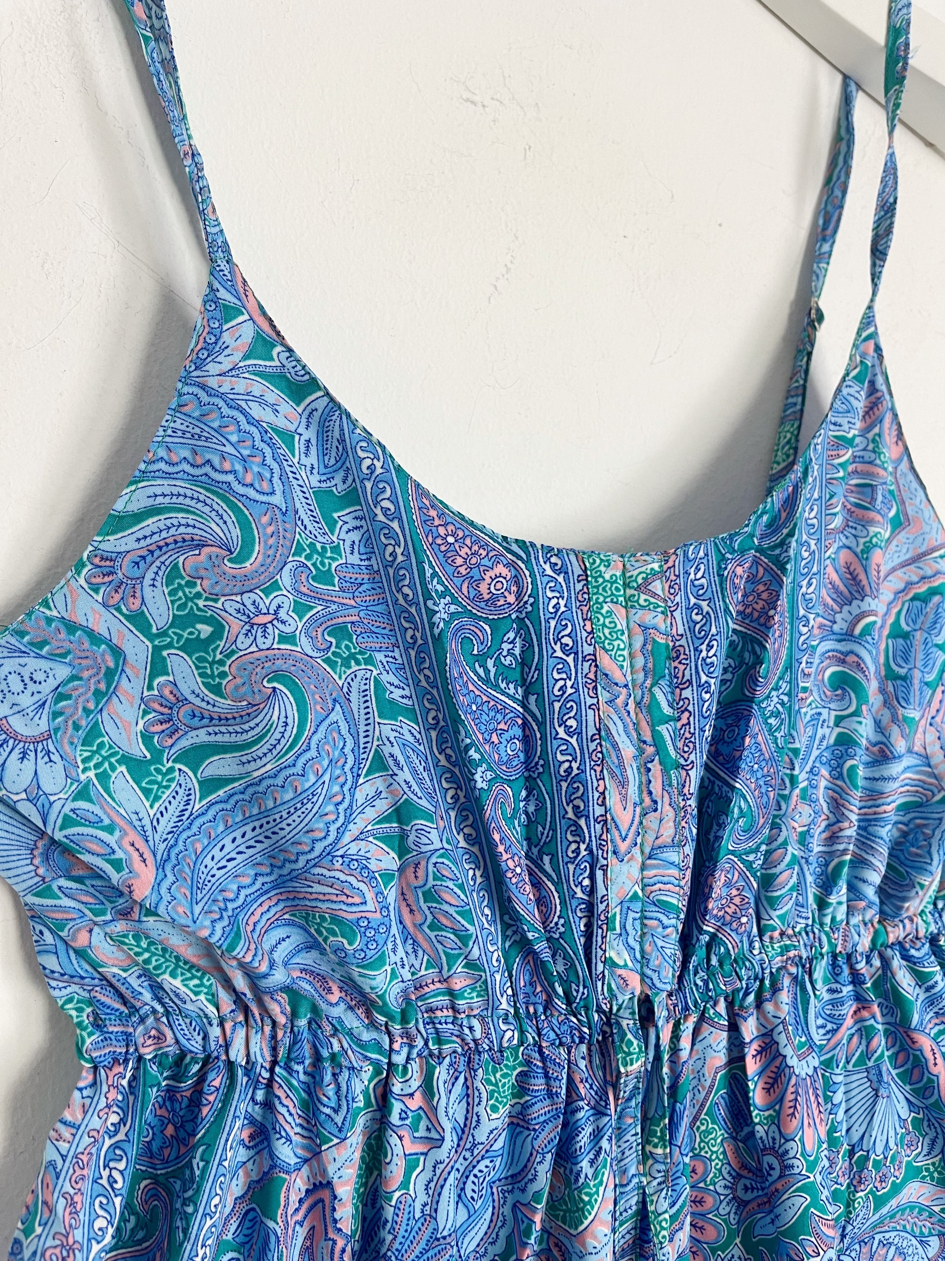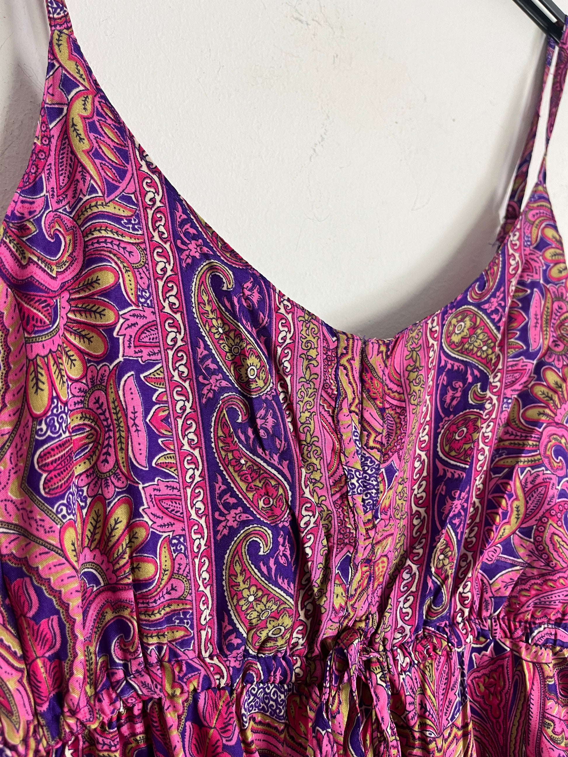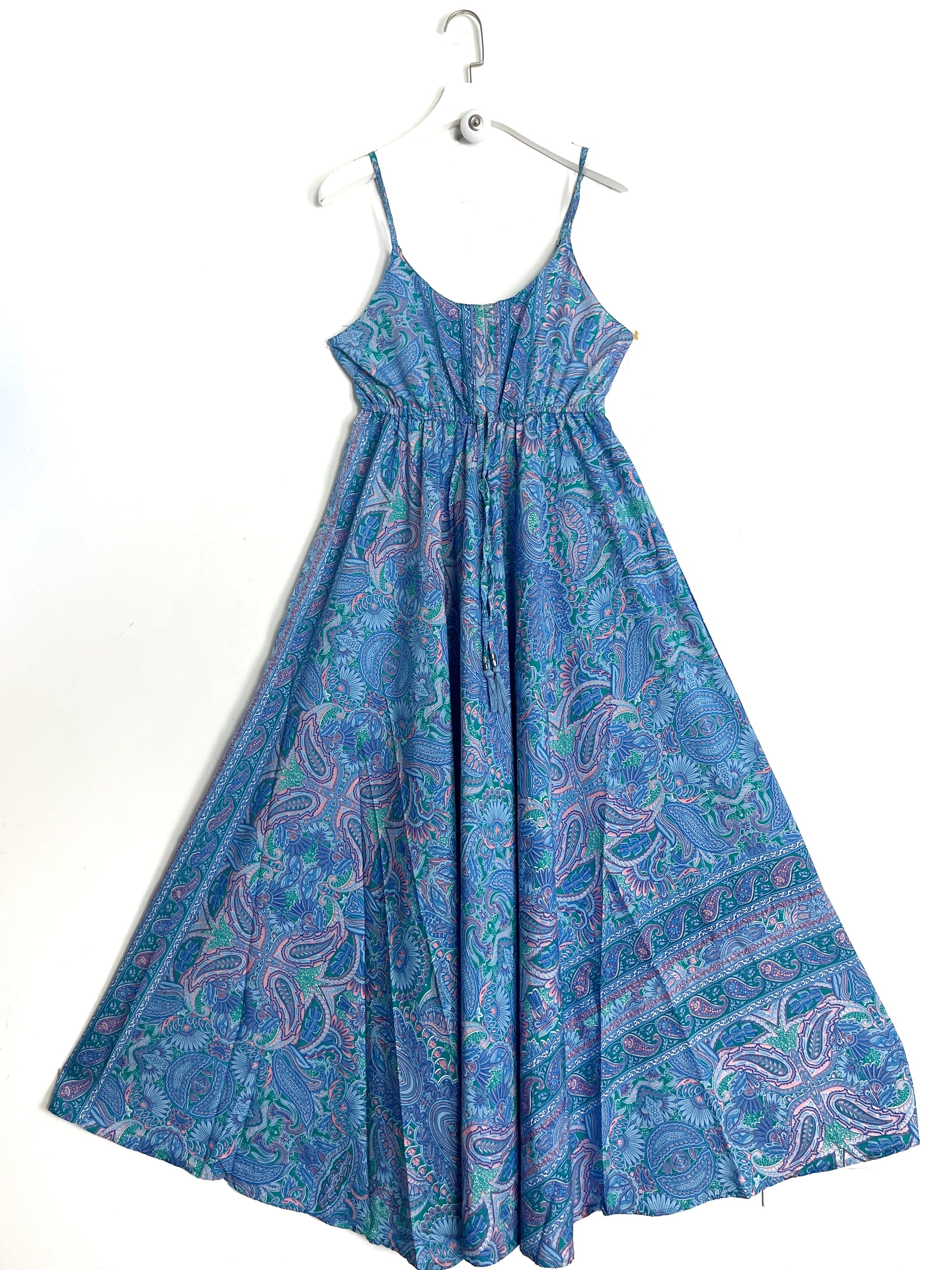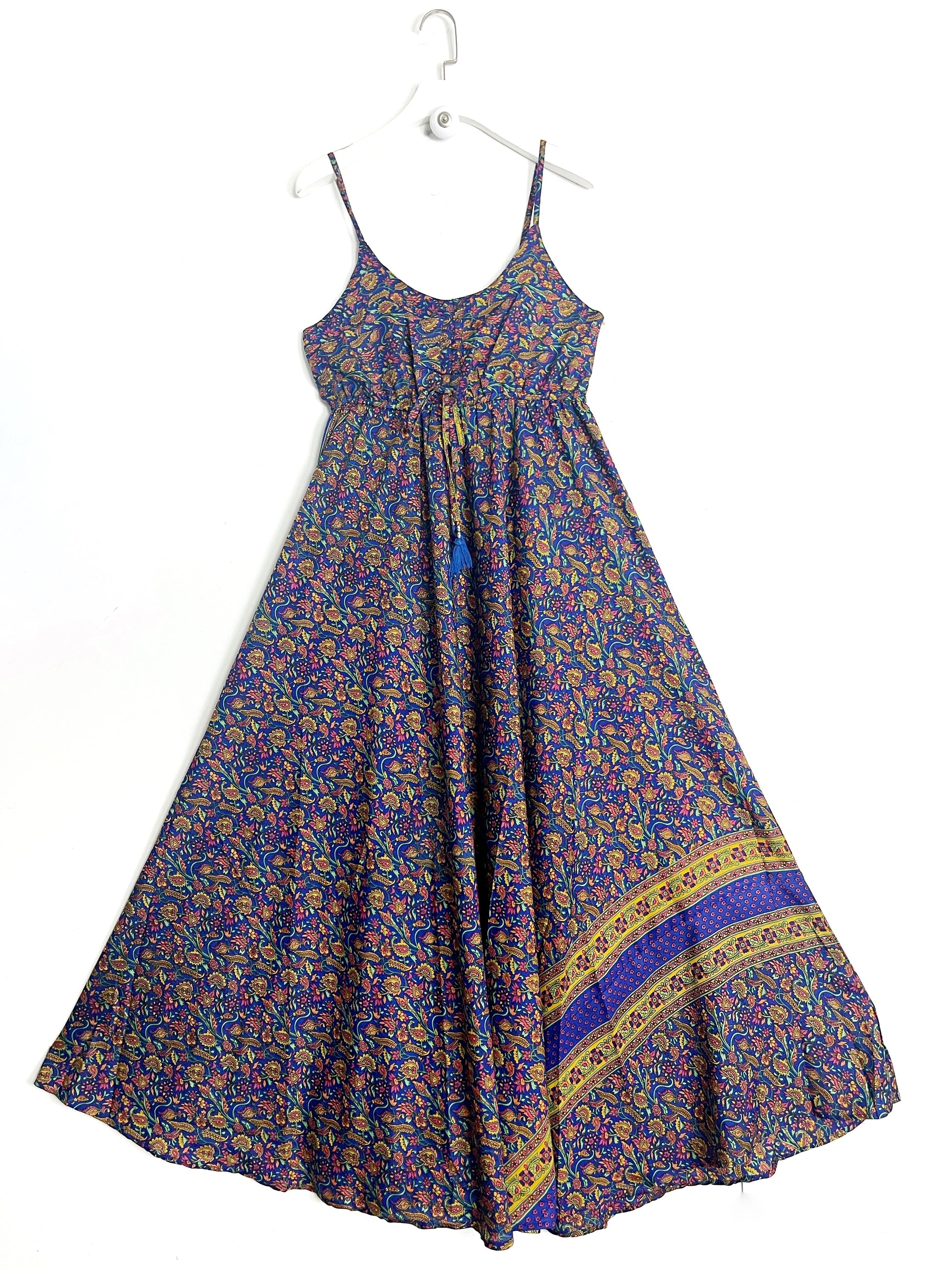 Abito in seta con spalline sottili regolabili. Arricciatura sotto il seno, corpetto dietro in punto amore. Gonna lunga svasata.
