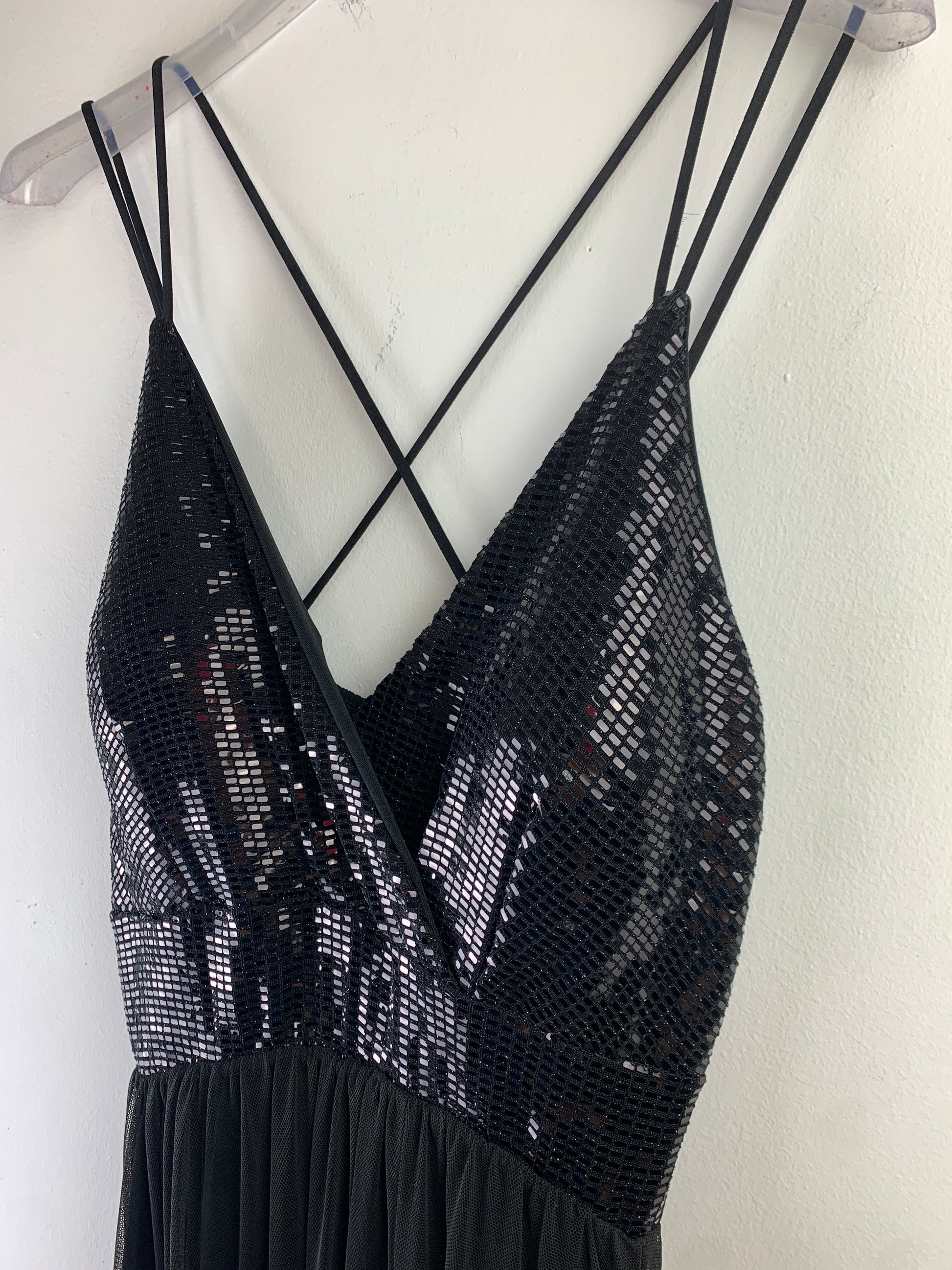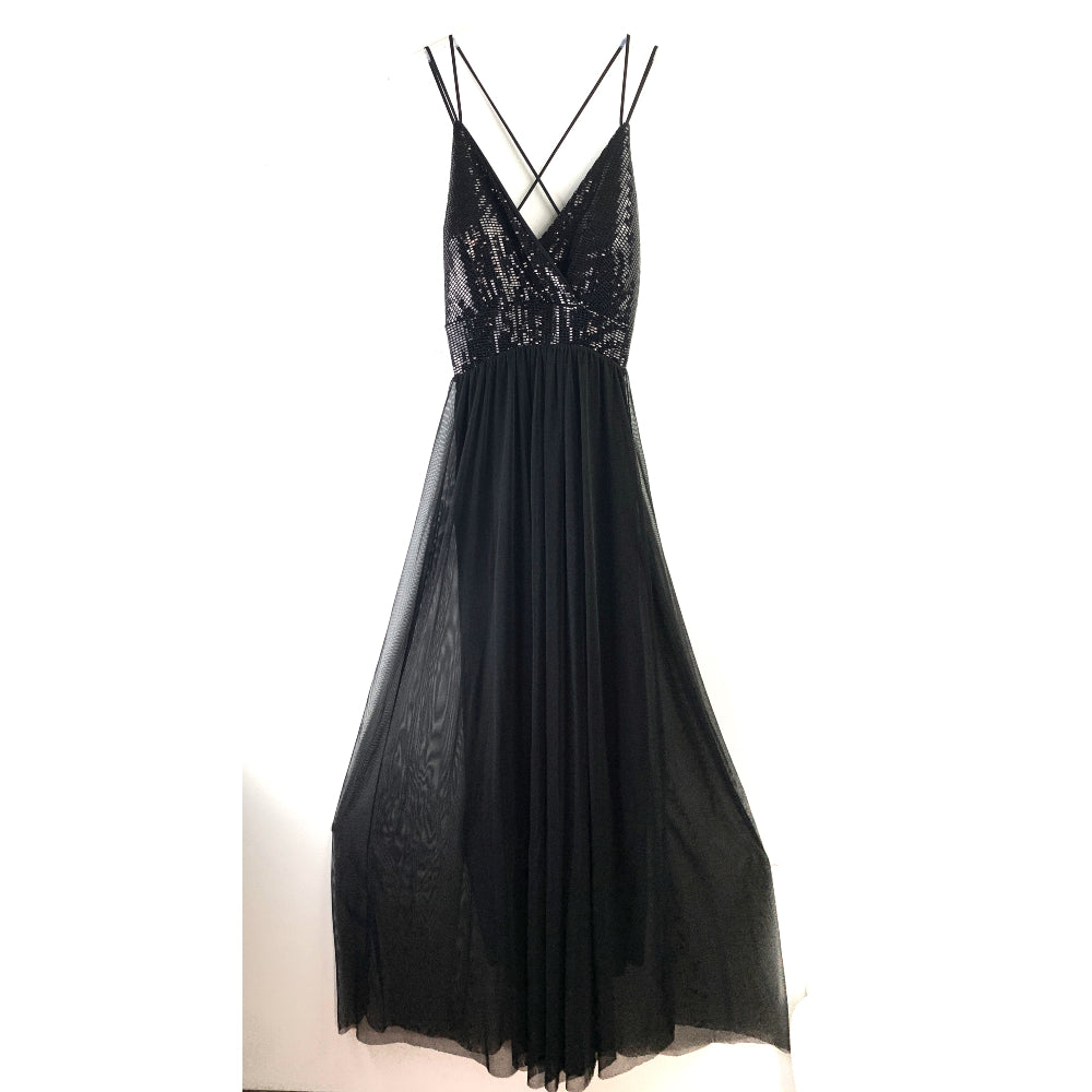 Abito lungo in voile, top con paillettes nere, spalline sottili doppie, incrociate dietro. Gonna lunga svasata, foderato.