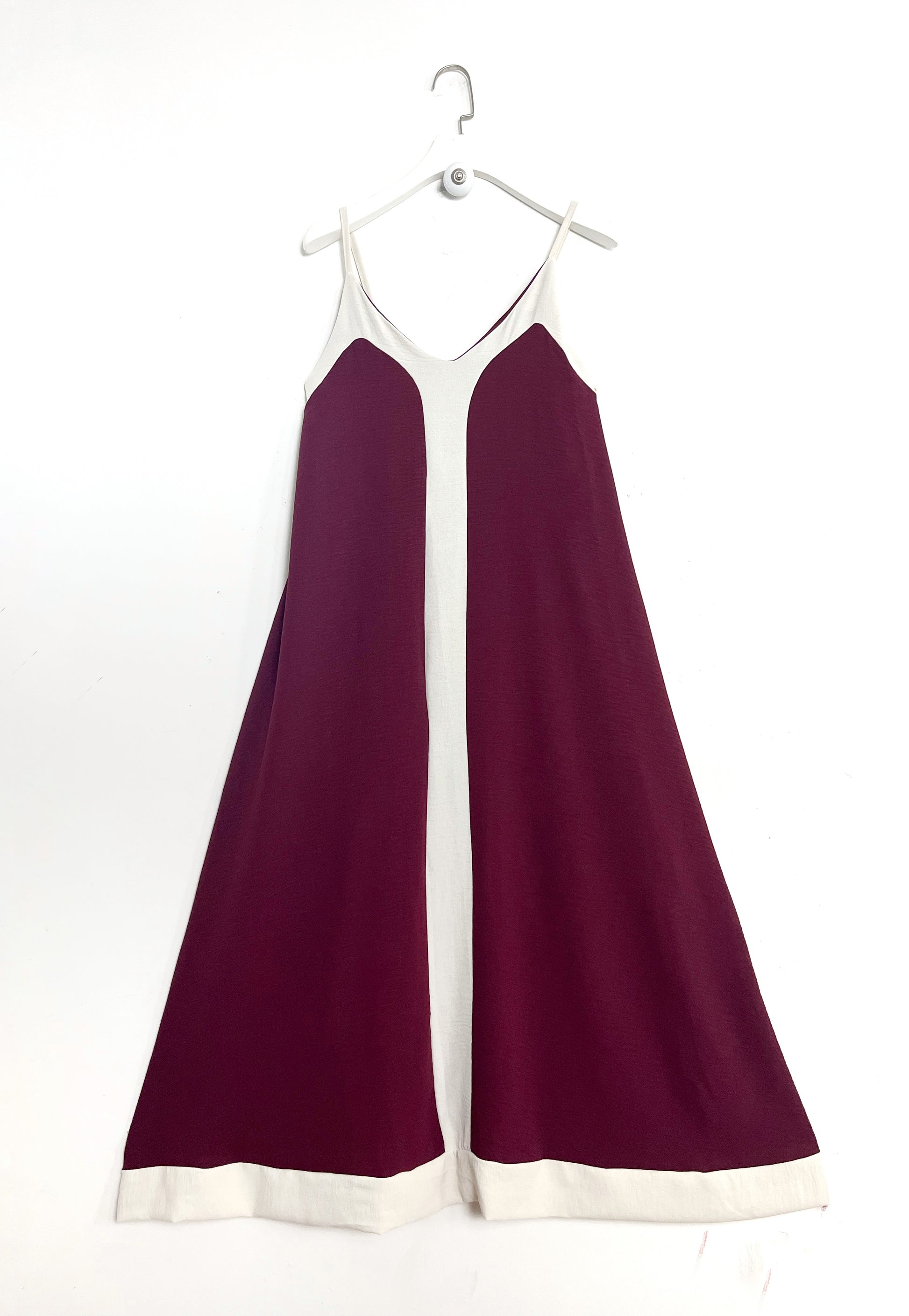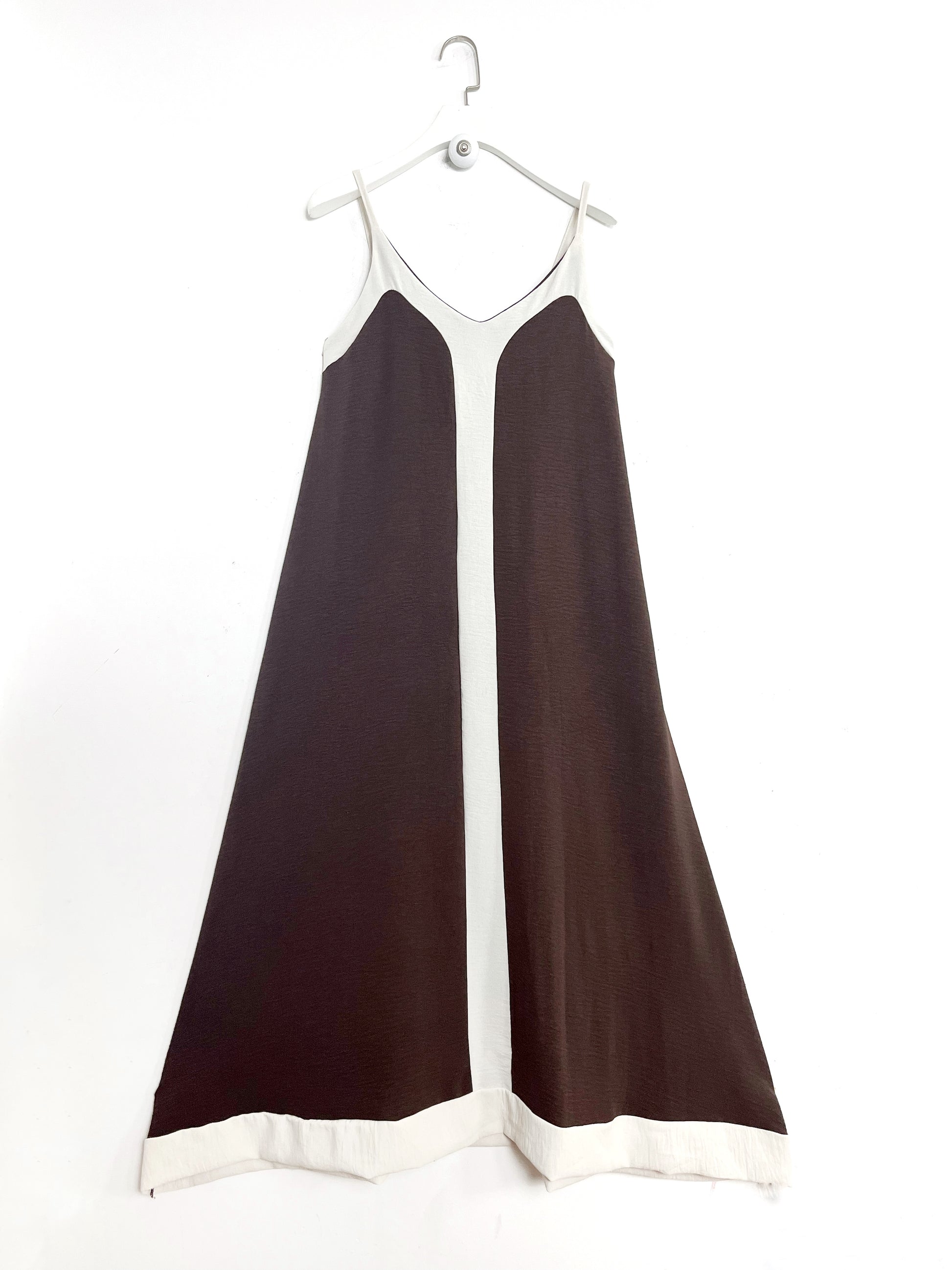 Abitone con spalline sottili. Profili in contrasto, svasato sul fondo. Scollatura dieteo la schiena.