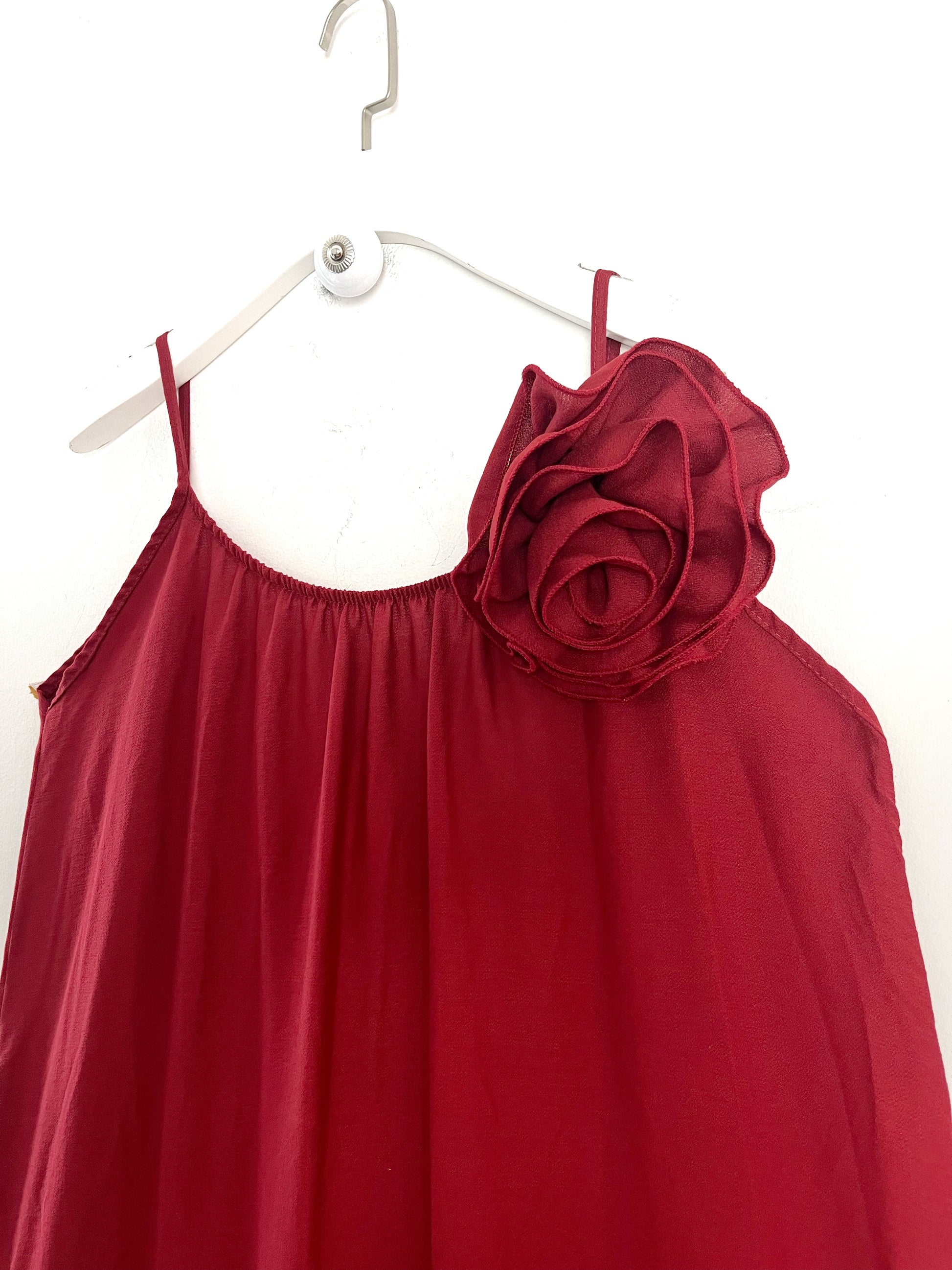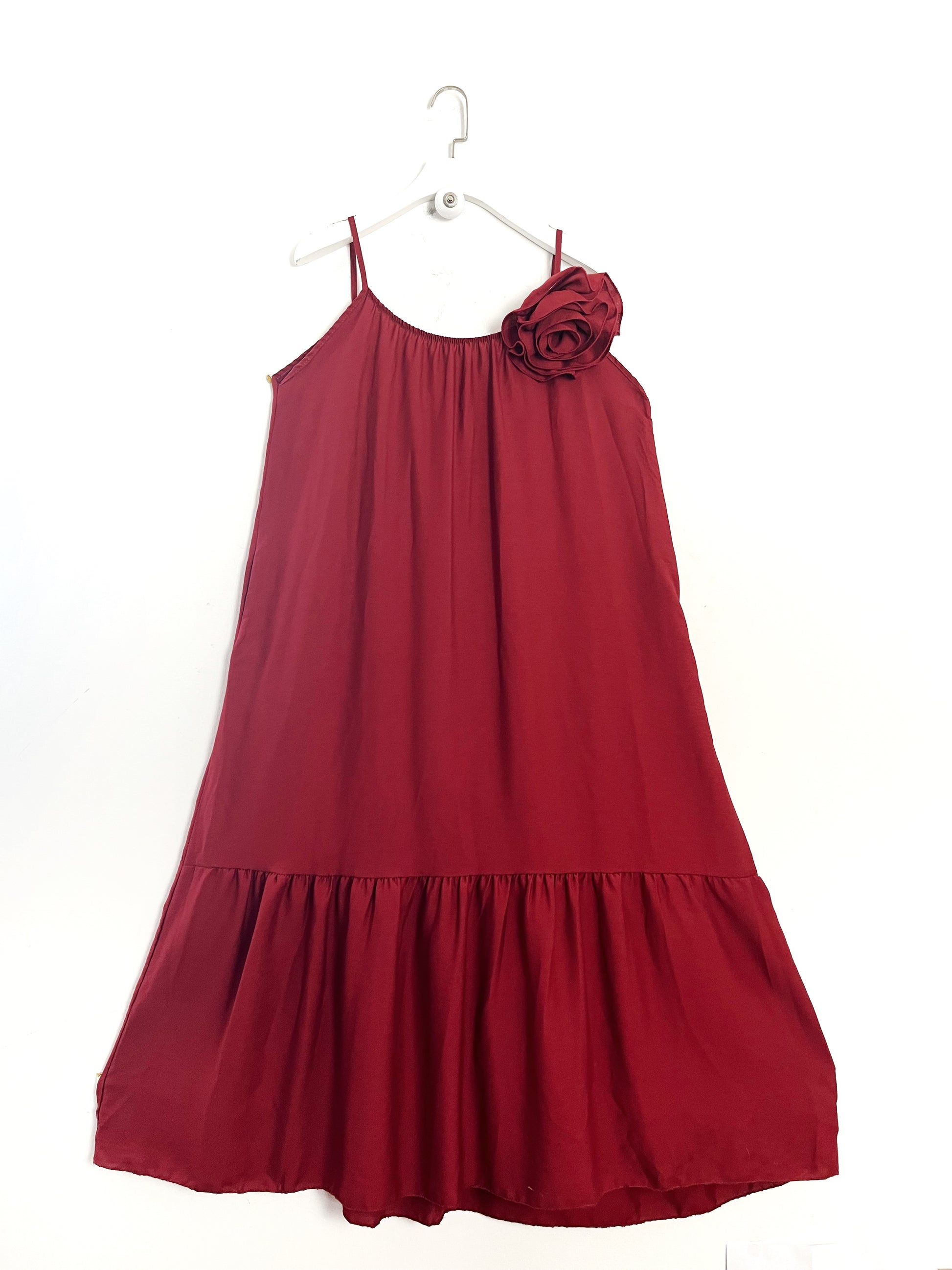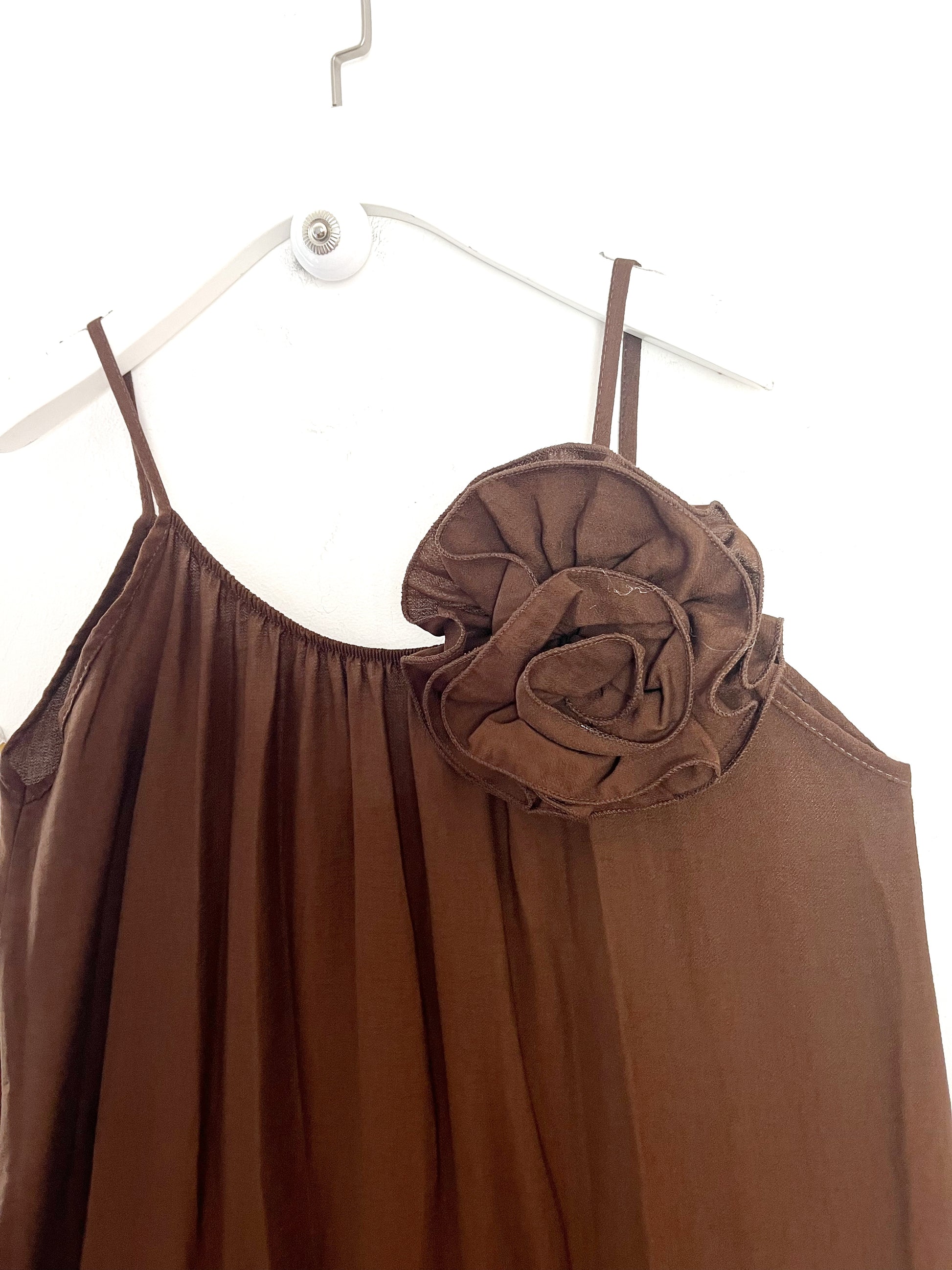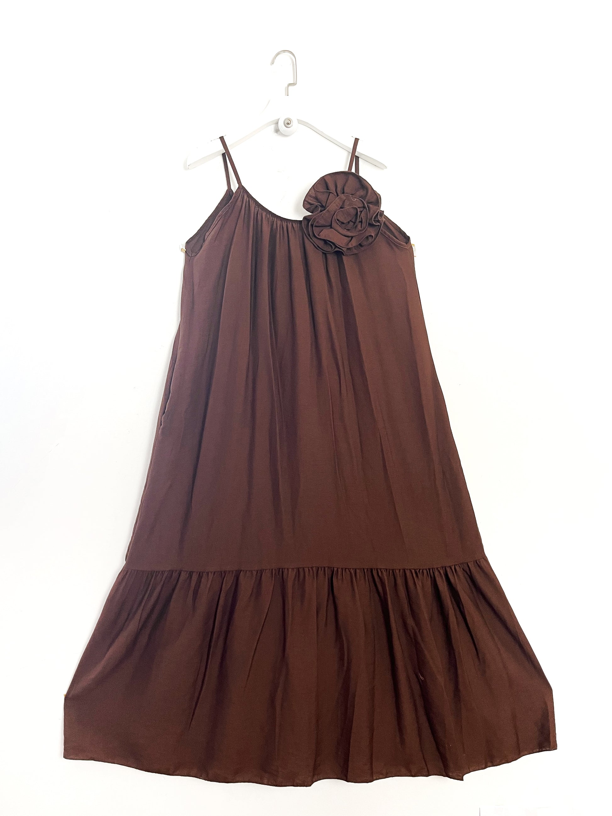 Abitone con spalline sottili. Taglio dritto con balza sul fondo, tasche laterali a scomparsa. Scollatura profonda sulla schiena