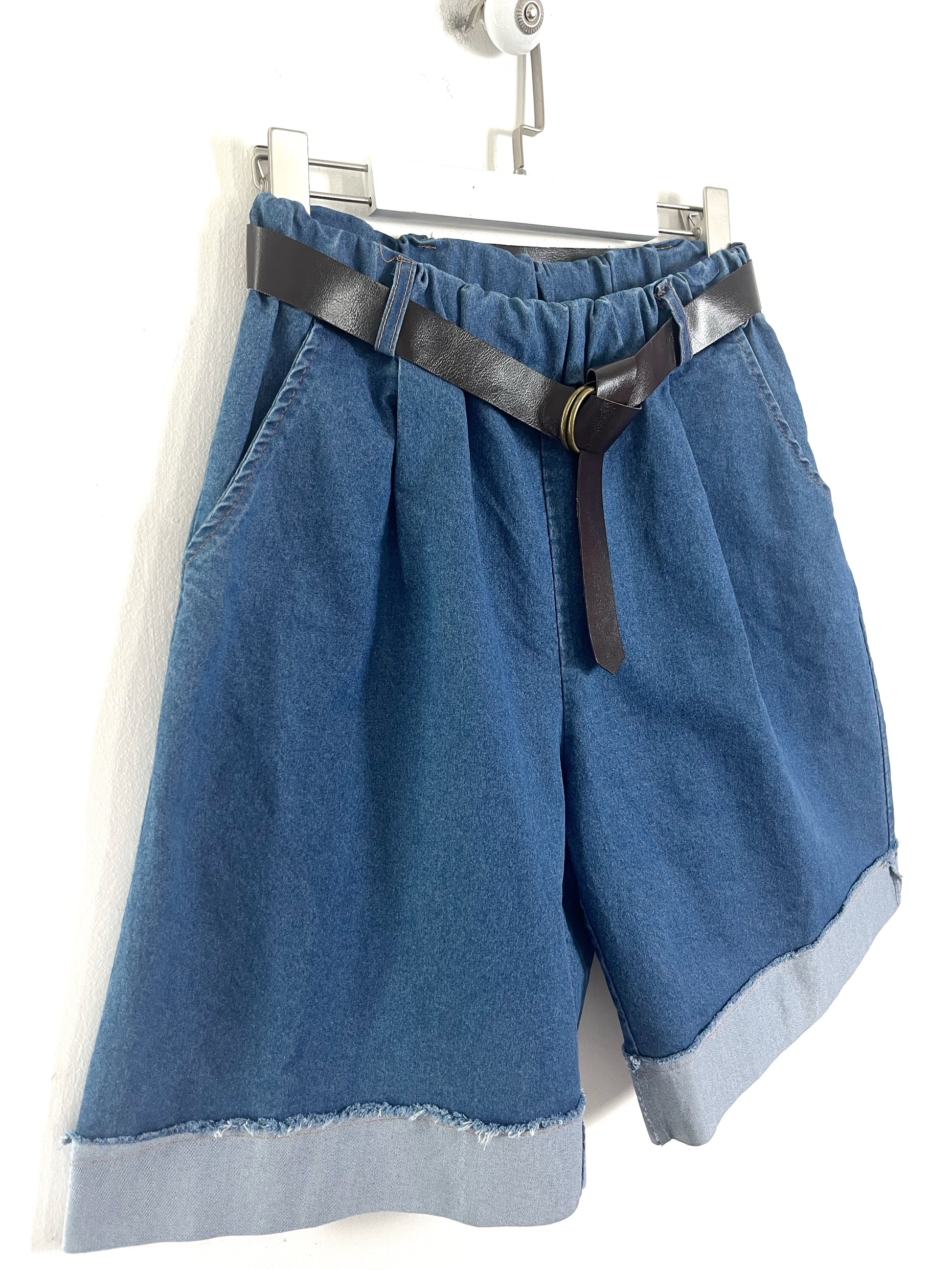 Shorts in denim elasticizzato. Vita alta con elastico, passanti con cintura in ecopelle. Tasche laterali. Lunghezza al ginocchio. Risvolto alto cucito sfrangiato.