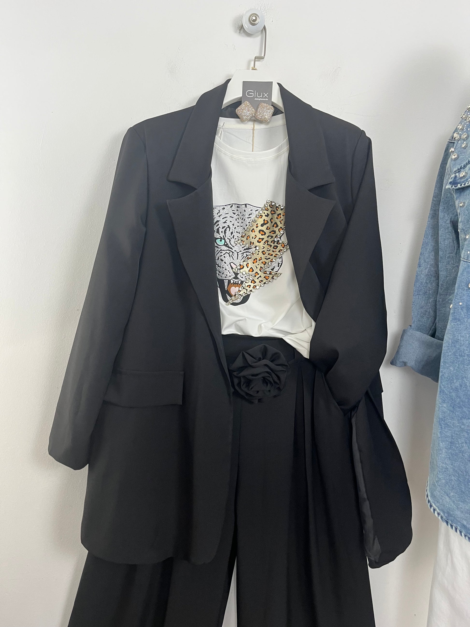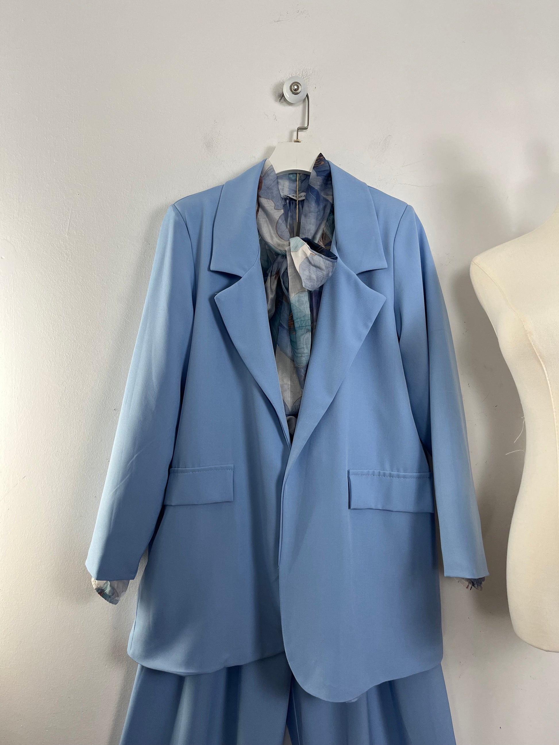 Blazer Over dal taglio classico, manica lunga. Colletto e revers, tasche finte con baschine applicate. Senza chiusura. Spallotte. Foderata. Cinturina in ecopelle compresa per chiuderlo in vita
