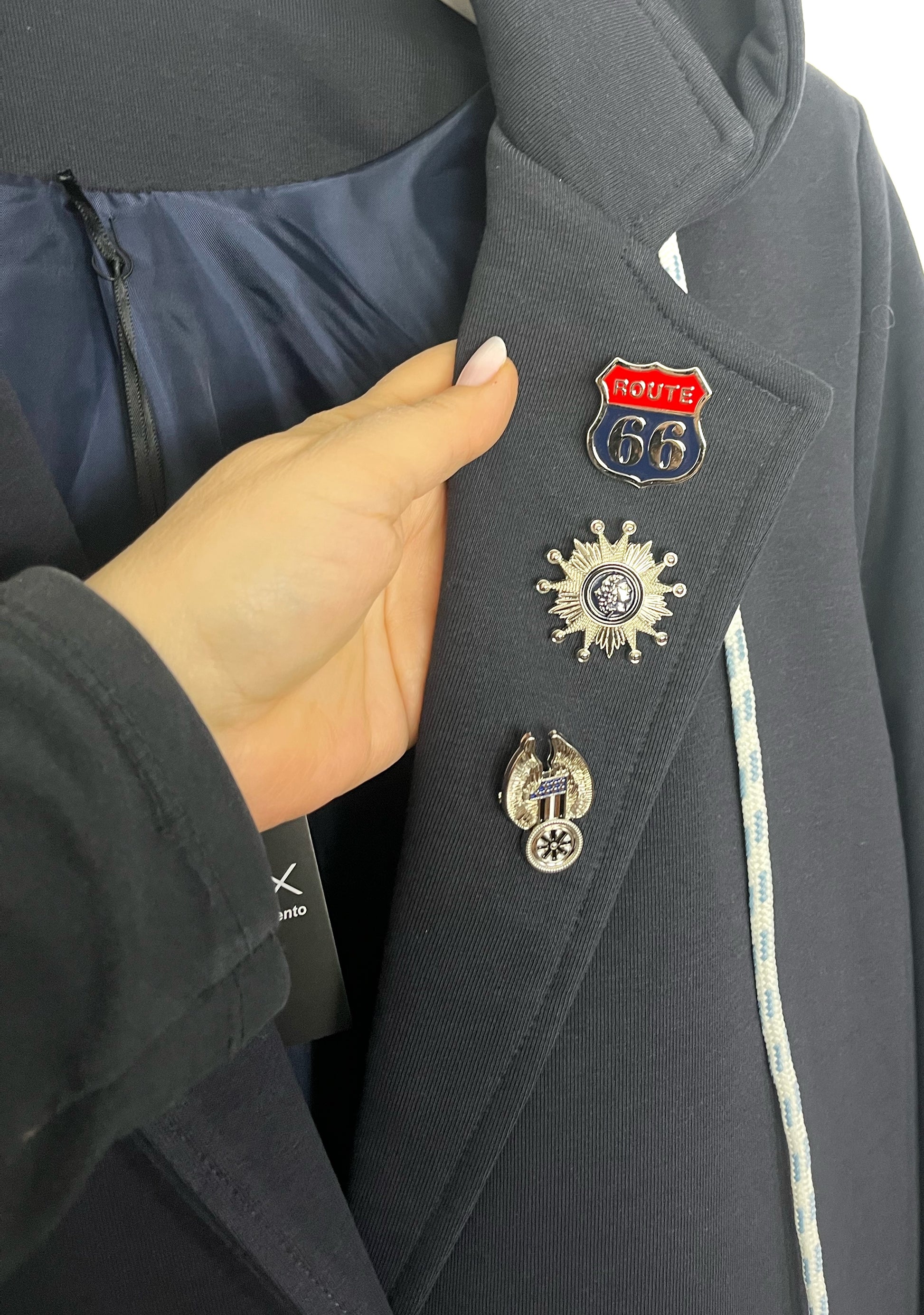 Blazer in felpa con cappuccio staccabile. Colletto e revers, tasche finte con patta. Chiusa da 2 bottoni con asola. Bottoni sul polso. Spallotte con spille. Foderata.
