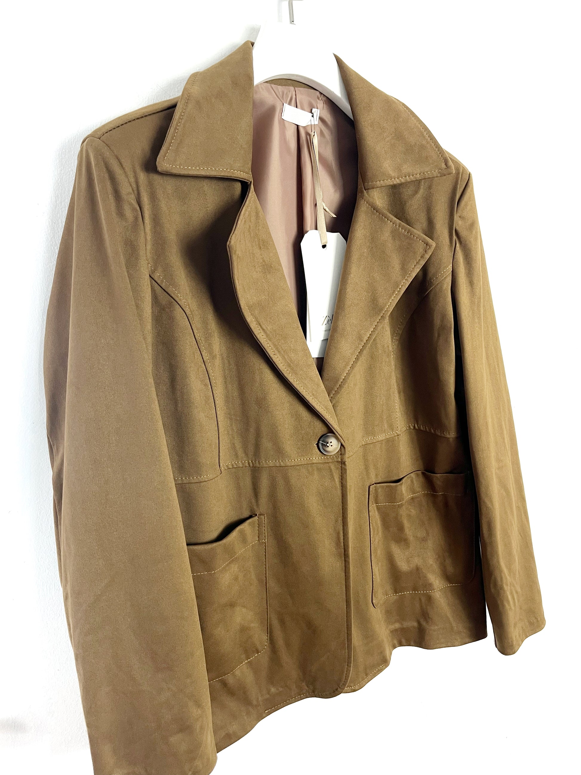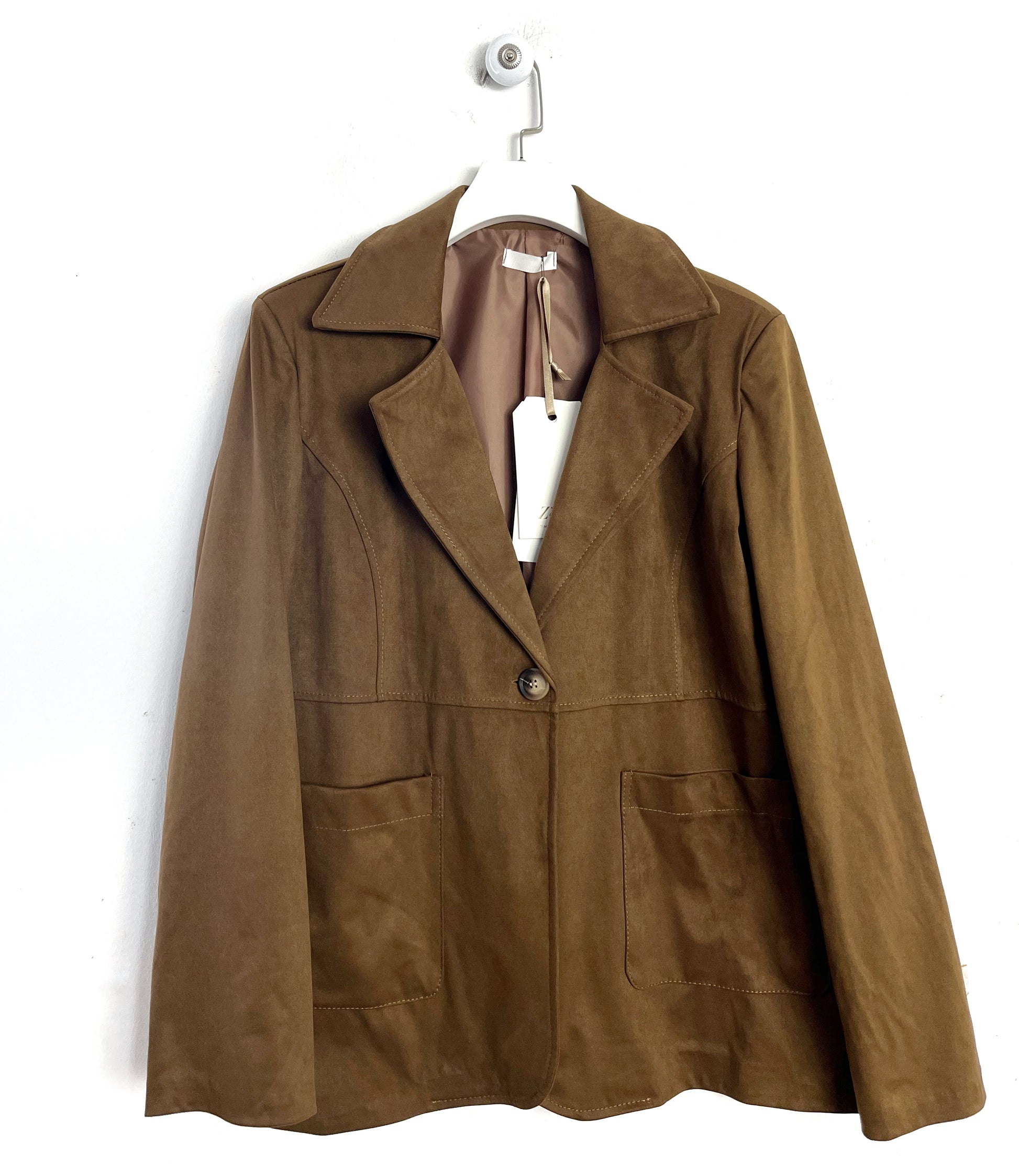Blazer in tessuto scamosciato classico manica lunga. Colletto e revers, tasche applicate sul davanti. Chiusa da un bottone con asola. Spallotte. Foderata.