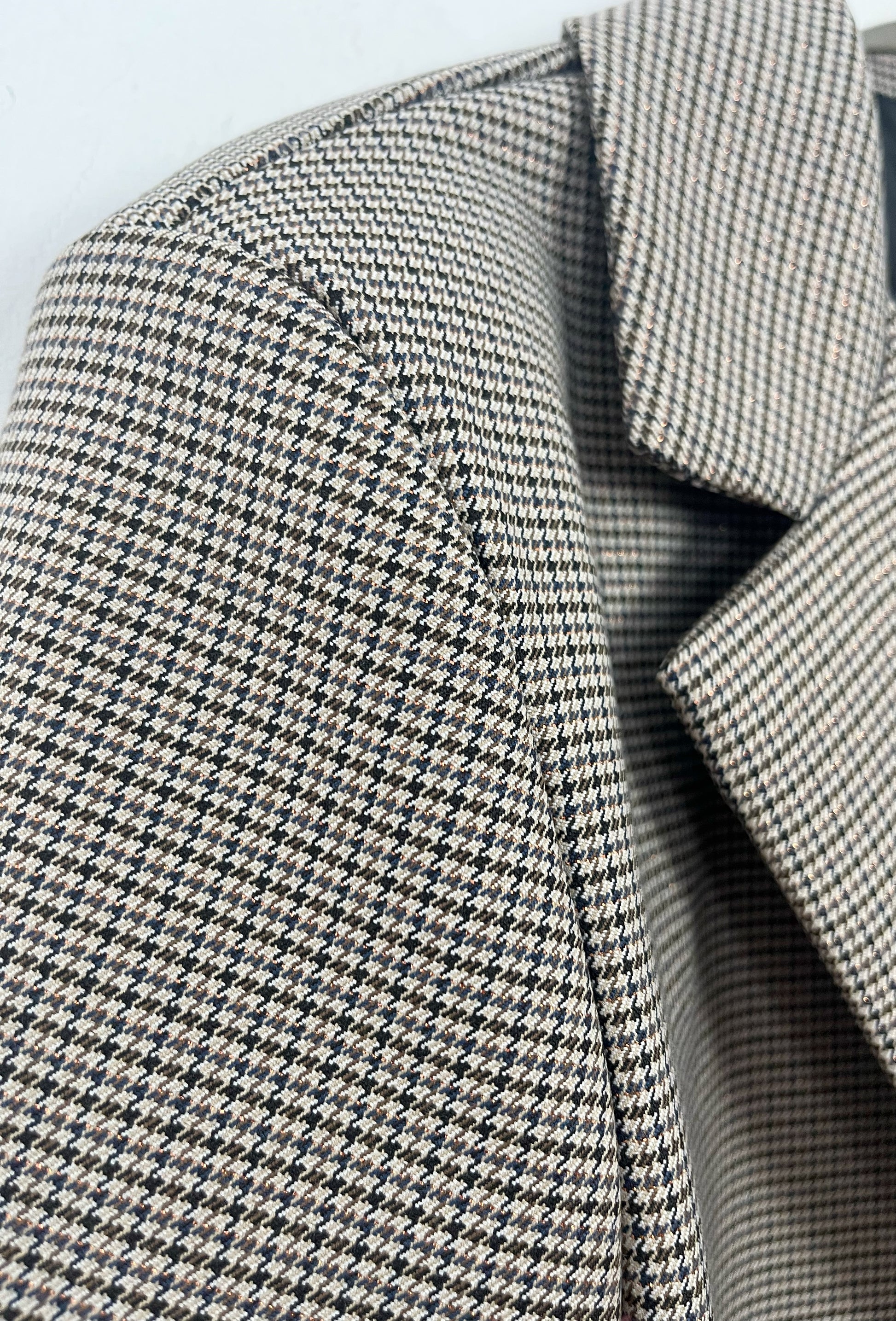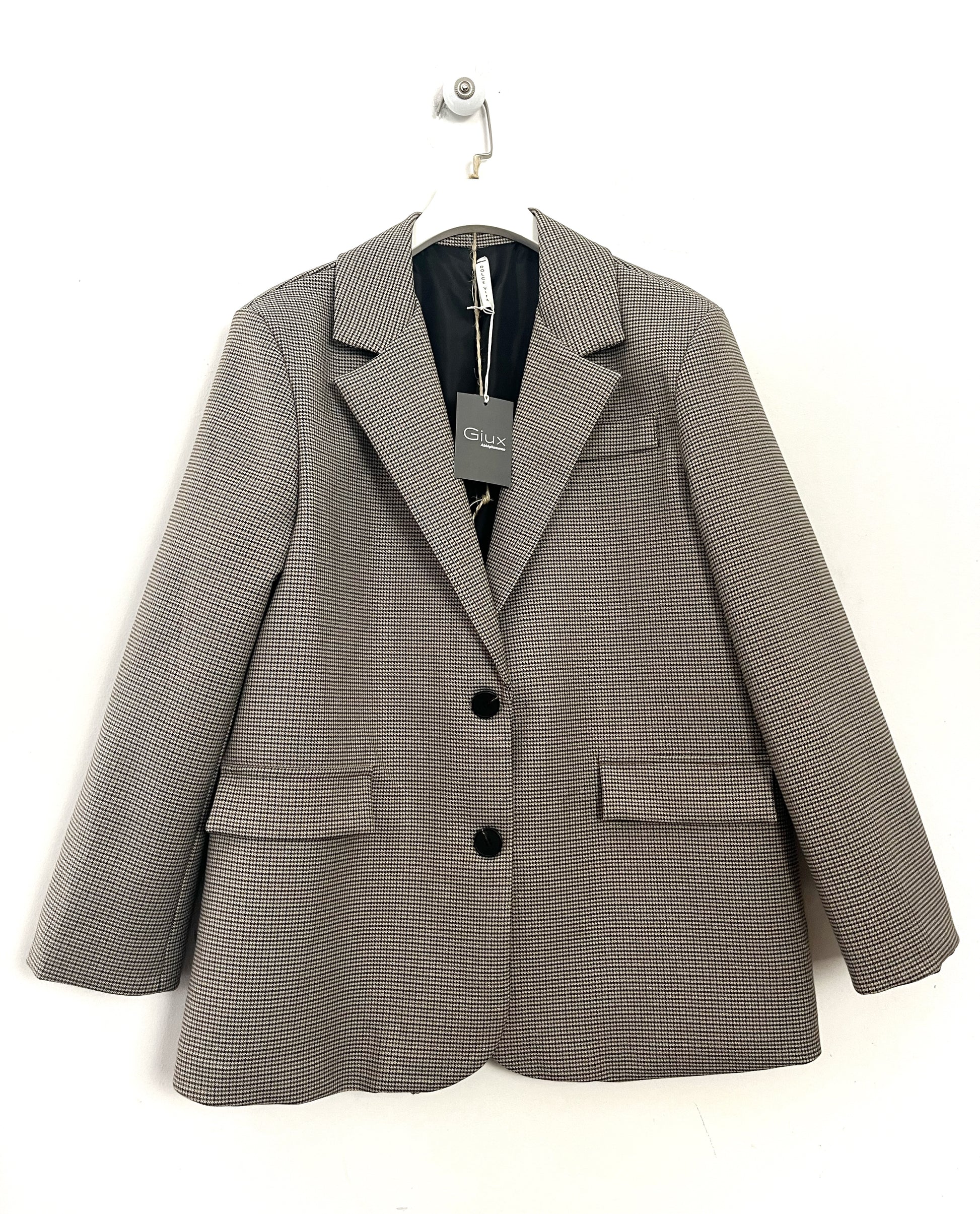 Blazer classico dal taglio over manica lunga. Colletto e revers, tasche con baschina. Chiusa da due bottoni con asole. Spallotte. Foderata.