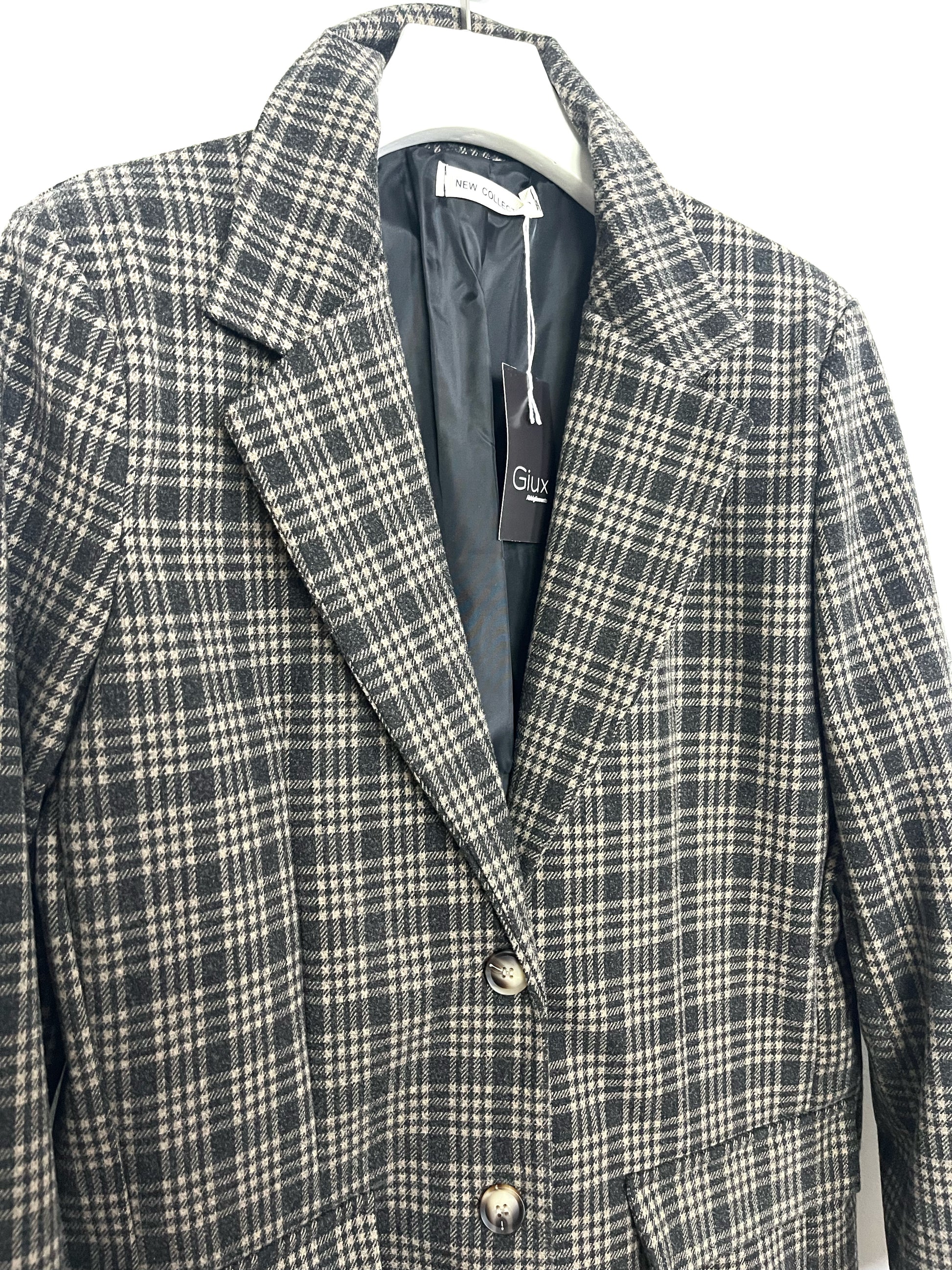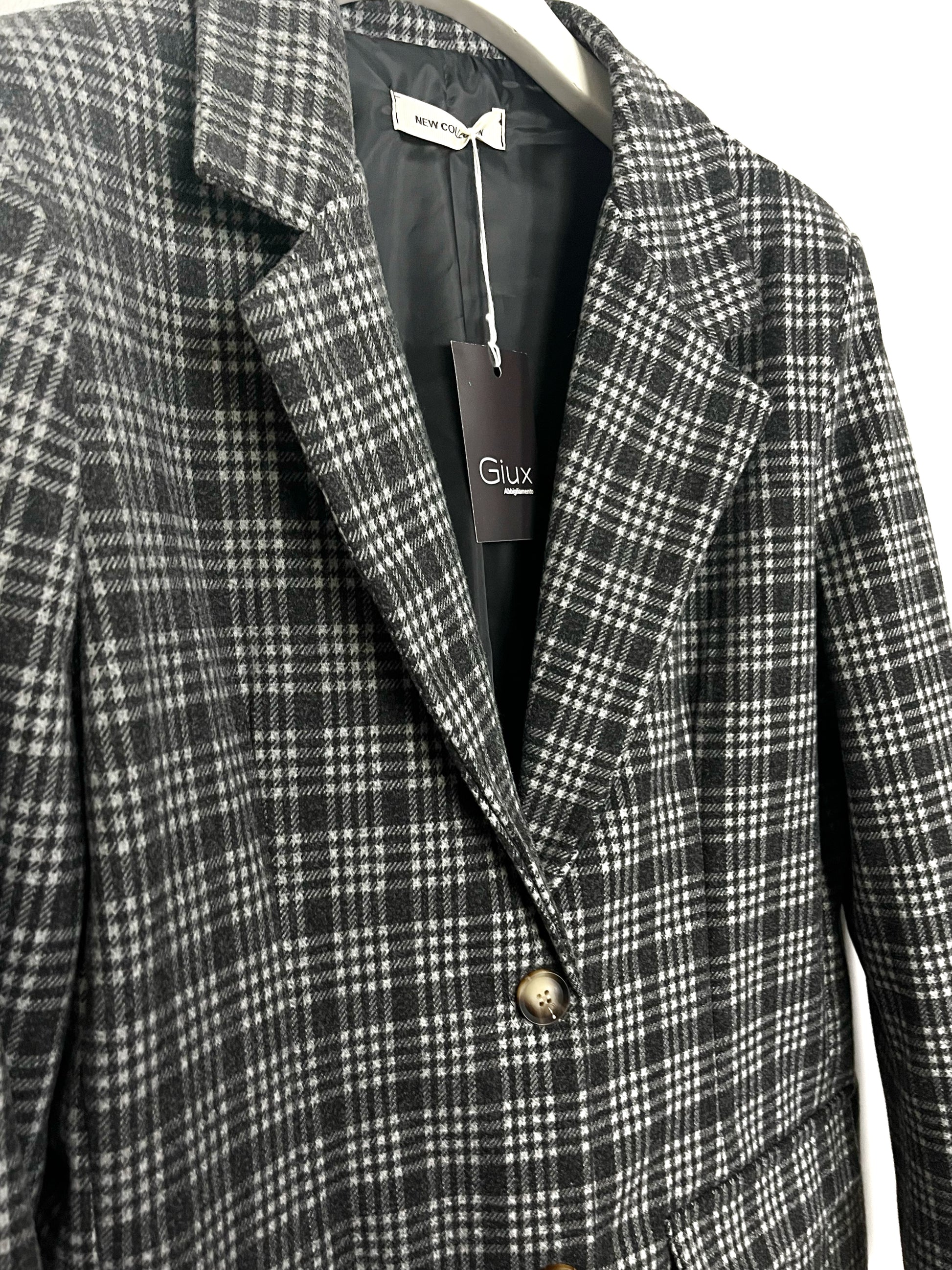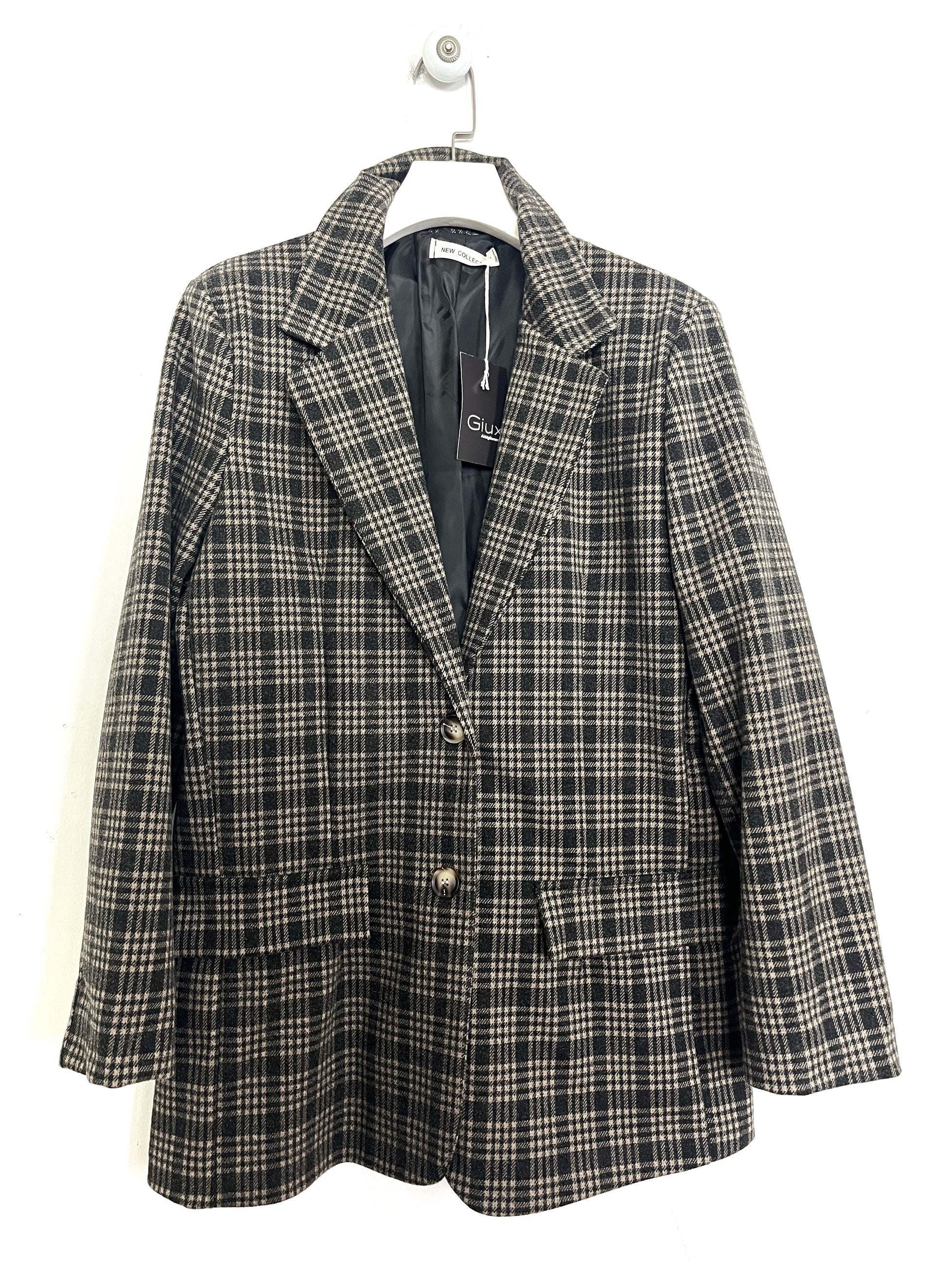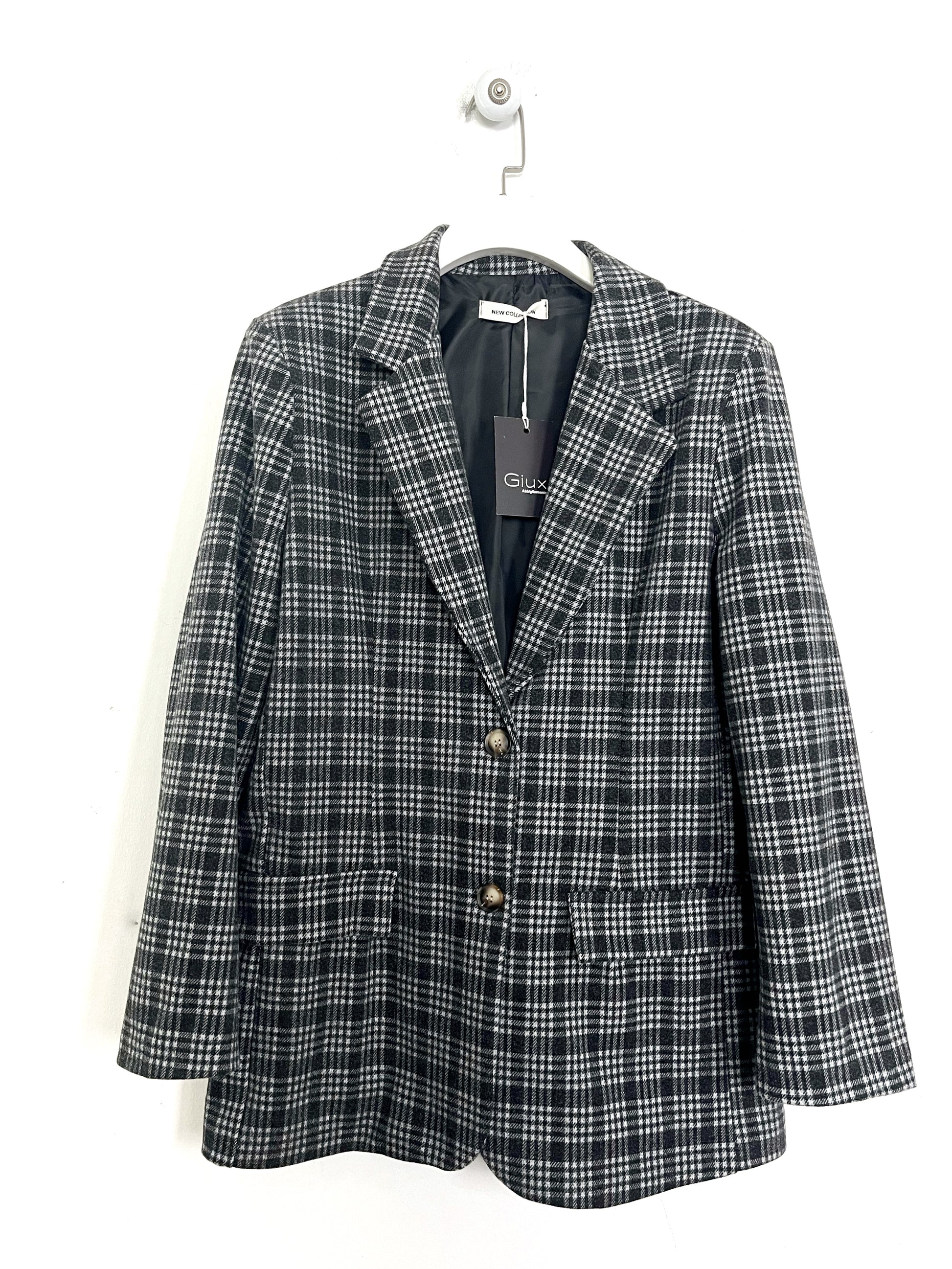 Blazer classico dal taglio over manica lunga. Colletto e revers, tasche con baschina. Chiusa da due bottoni con asole. Spallotte. Foderata.