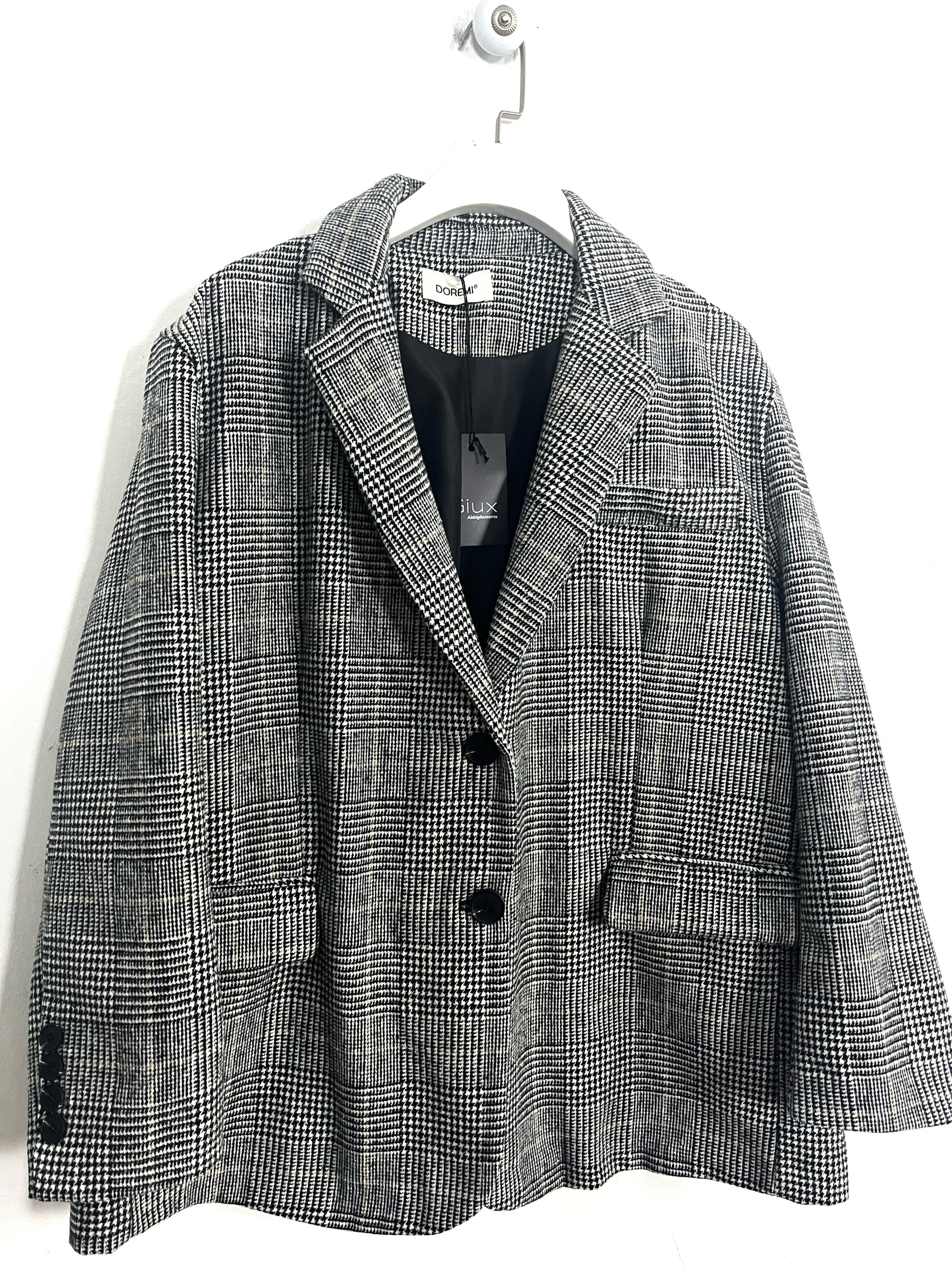 Blazer classico dal taglio over manica lunga. Colletto e revers, tasche con baschina. Chiusa da due bottoni con asole. Spallotte. Foderata.