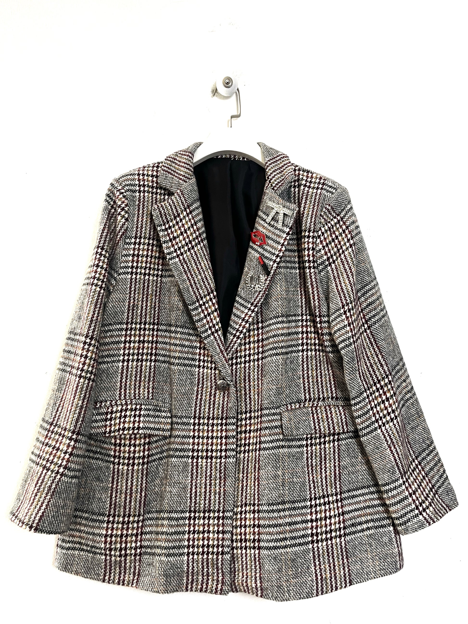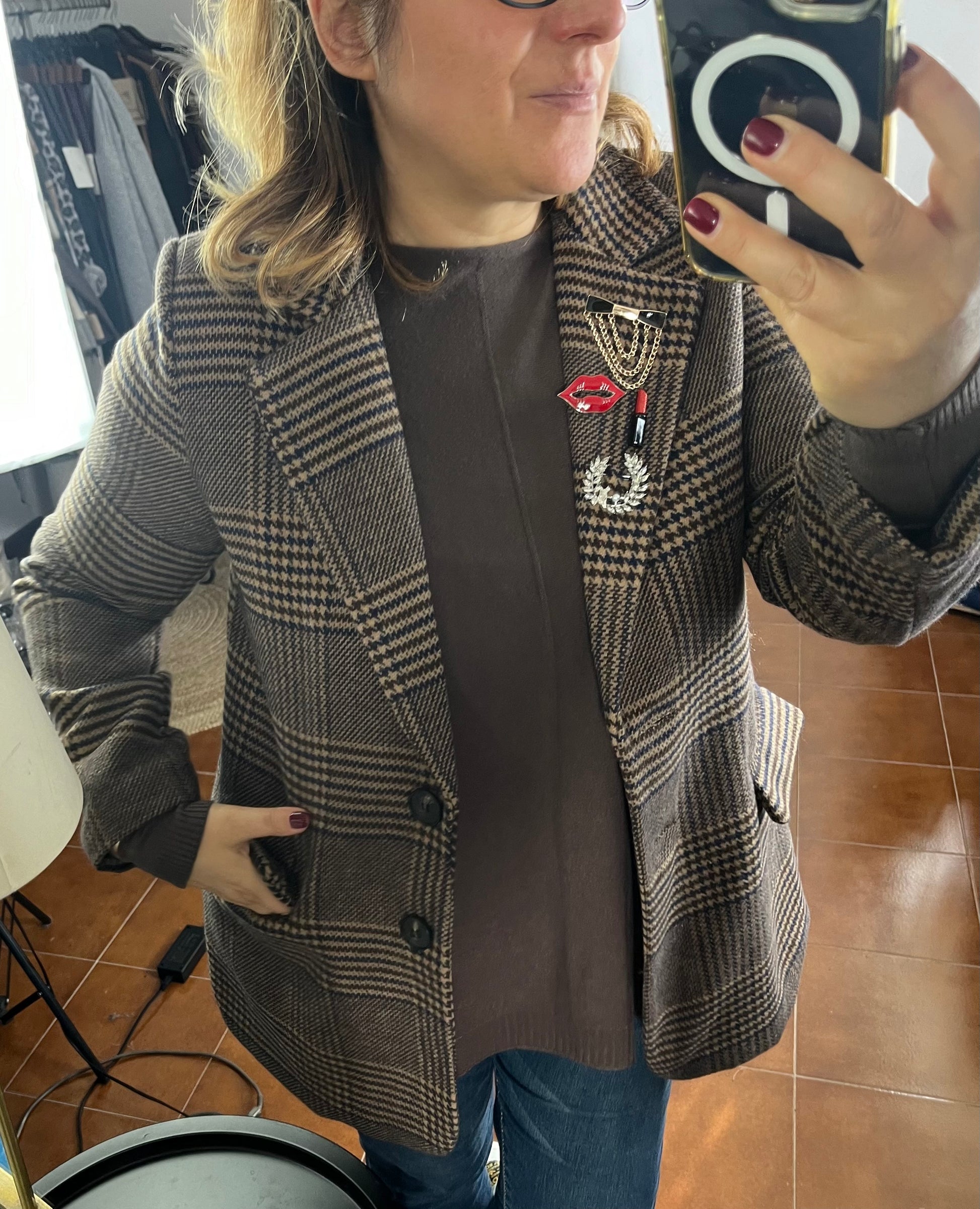 Blazer classico dal taglio over manica lunga. Colletto e revers, tasche con baschina. Chiusa da due bottoni con asole. Spallotte. Foderata. Con spille