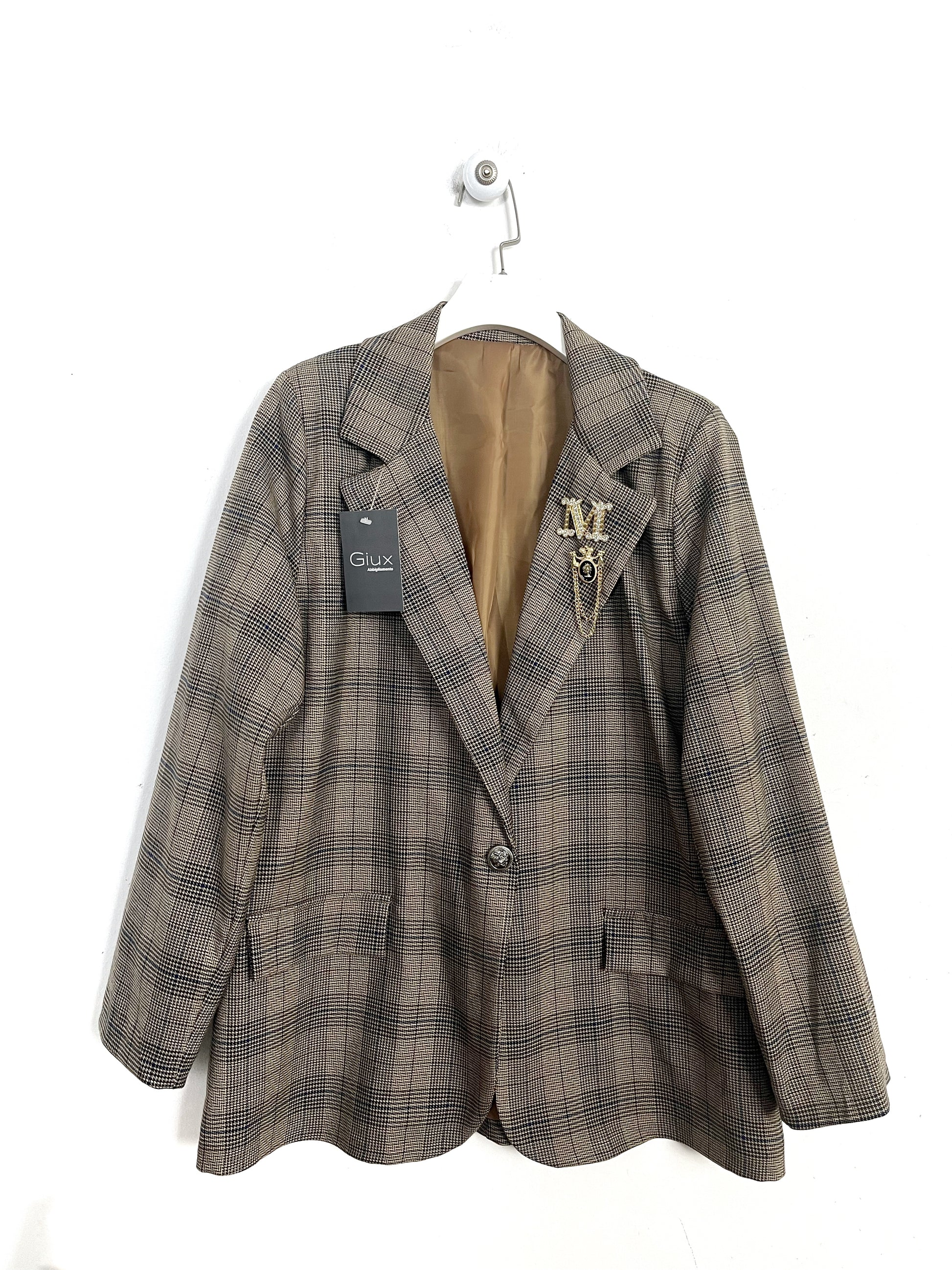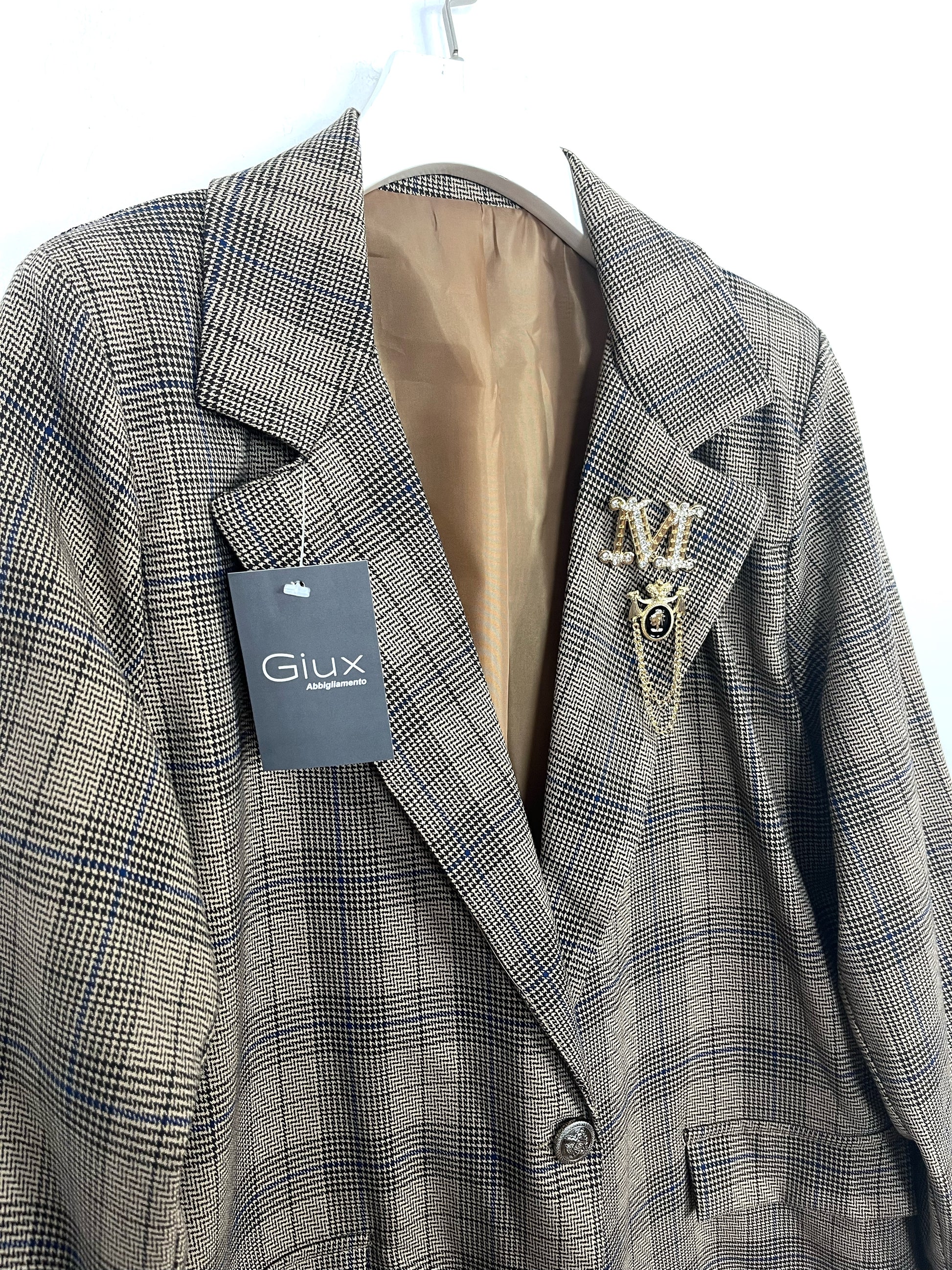 Blazer classico manica lunga. Colletto e revers, tasche con baschina. Chiusa da un bottone con asola. Spallotte. Foderata. Con spille