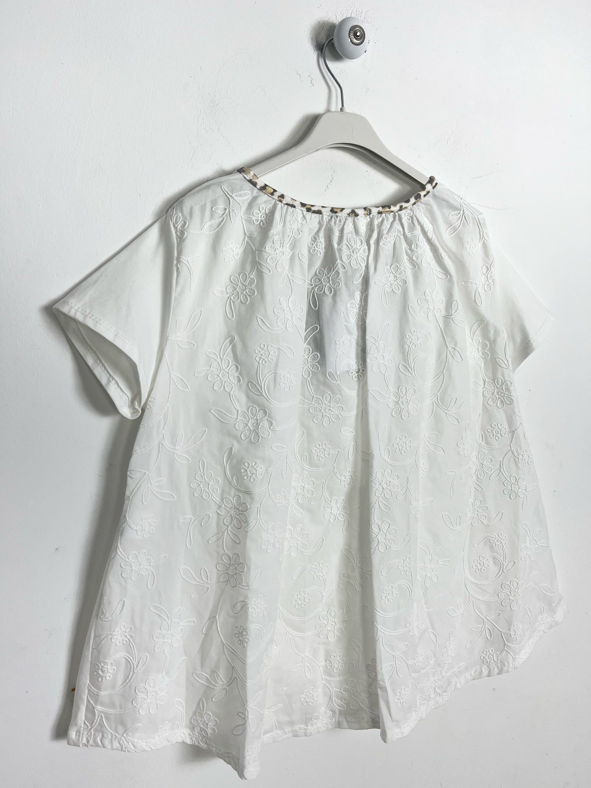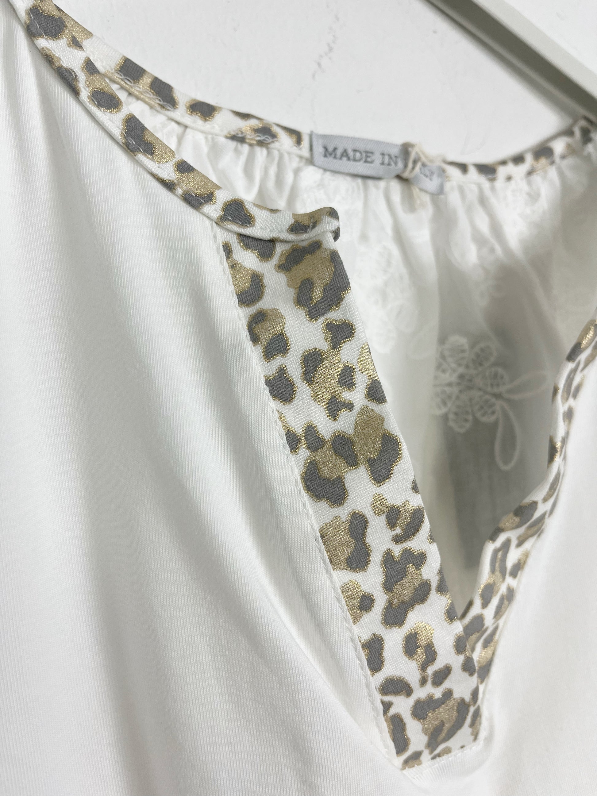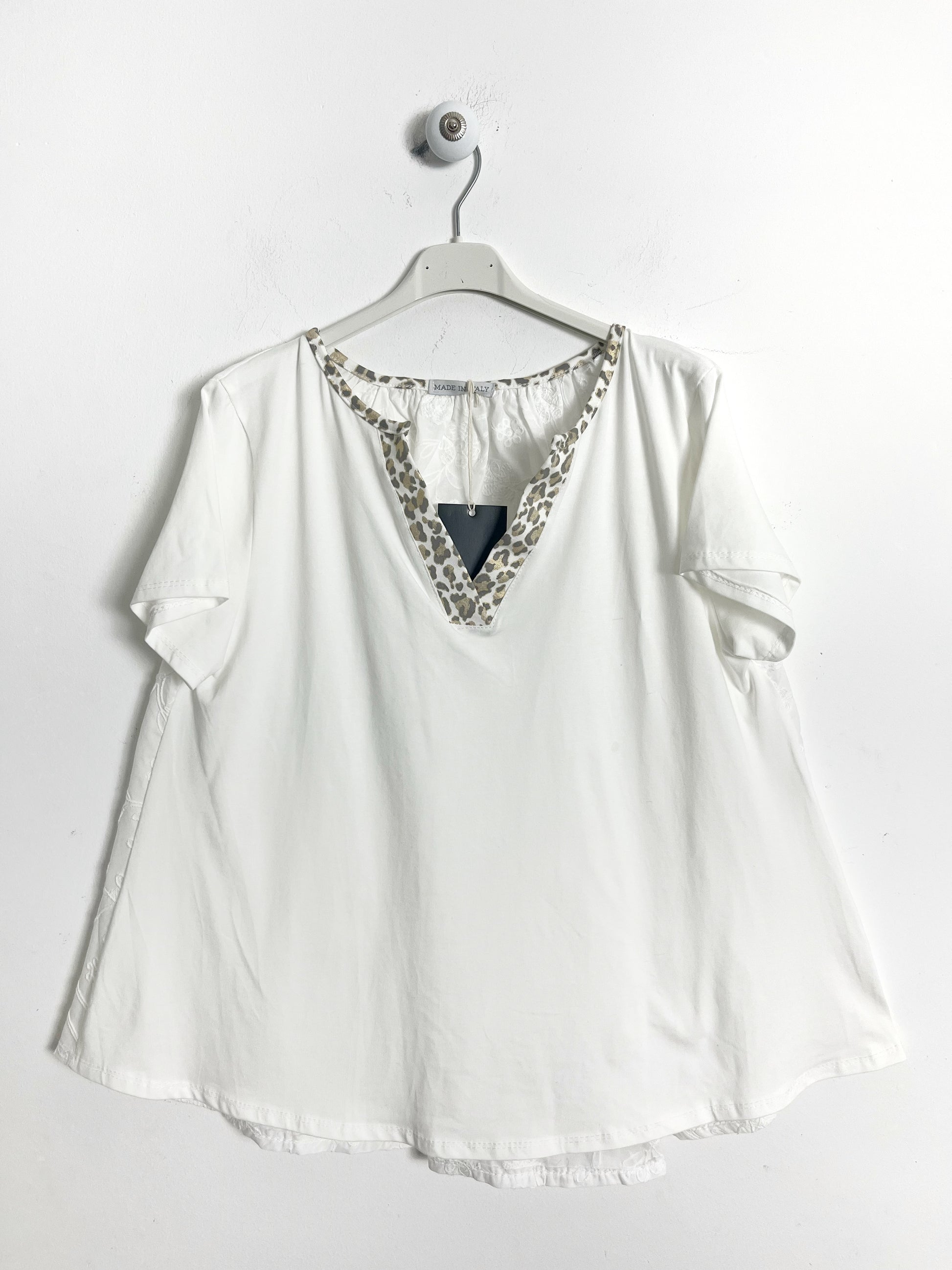 Blusa mezza manica in cotone, linea morbida. Davanti tessuto in Jersey di cotone, dietro in tela di cotone ricamato. Scollatura a V con profili maculati, dettagli in lurex dorati. Leggermente più lunga dietro. Scasata sul fondo.