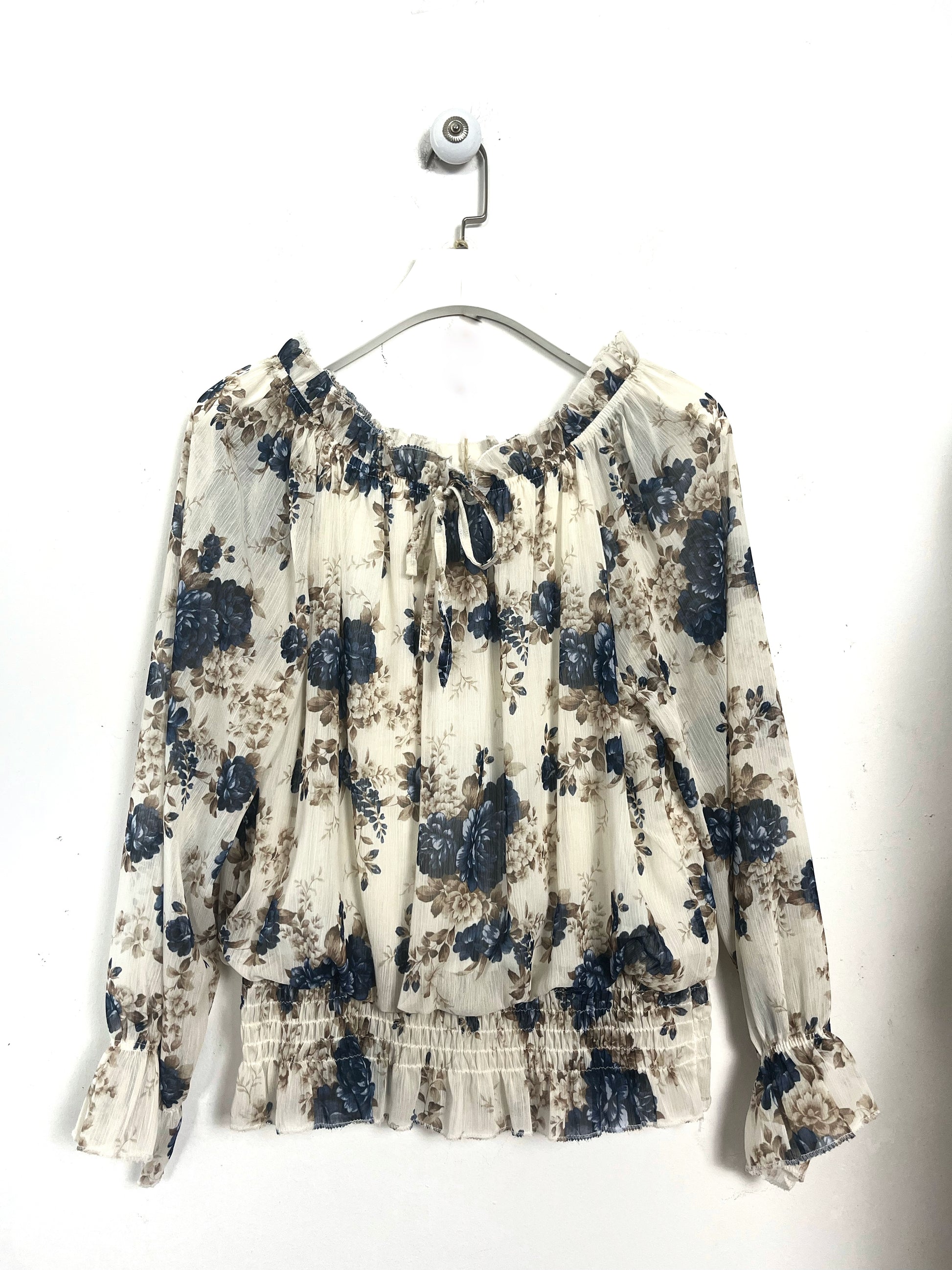 Blusa in fantasia, scollatura a barchetta. Manica lunga a sbuffo chiusa da un elastico. Foderata. Elastico sul fondo