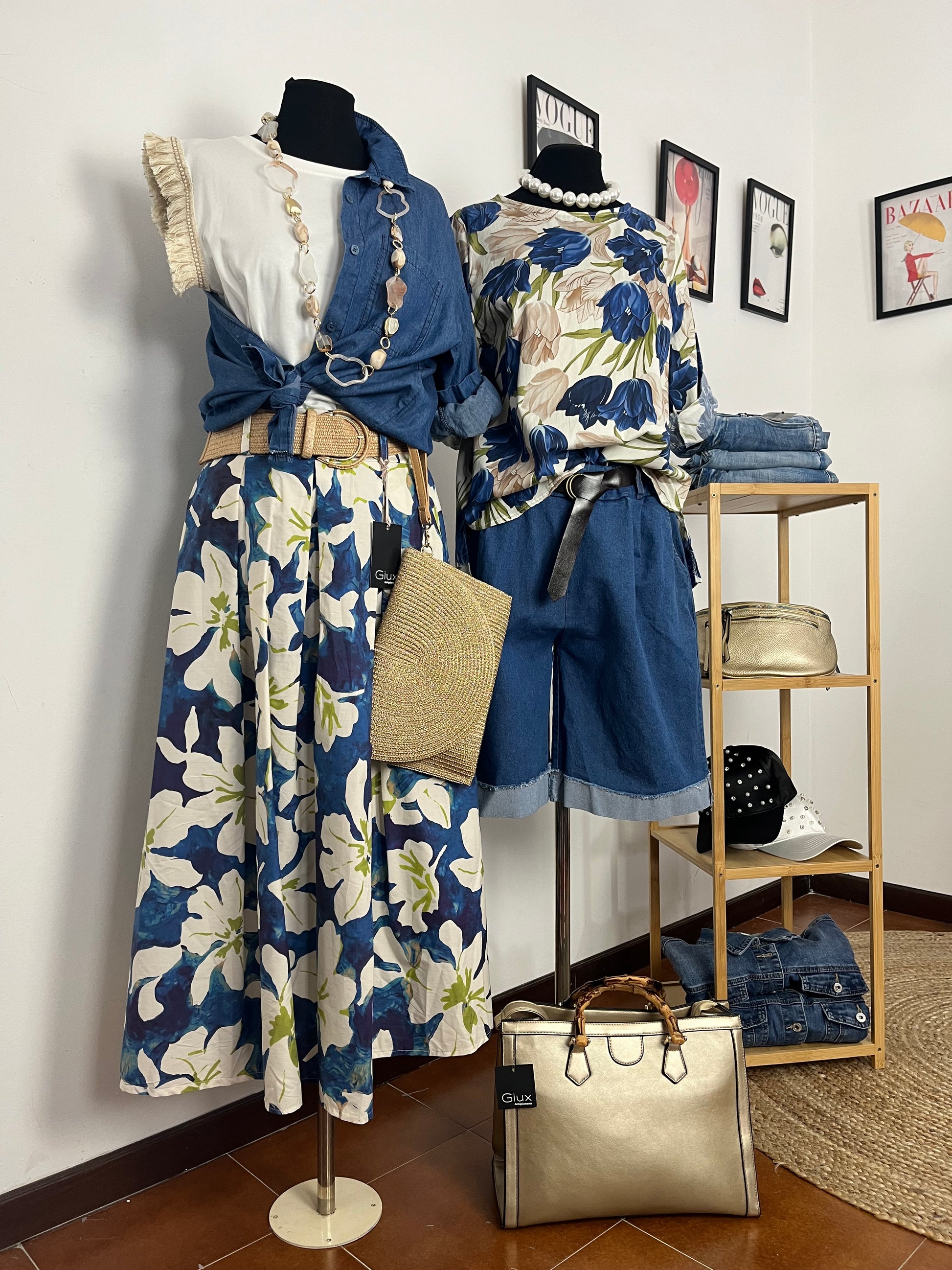 Blusa girocollo in fantasia manica 3/4. Spacchetti laterali. Taglio dritto sul fondo davanti, più lunga e stondata dietro.
