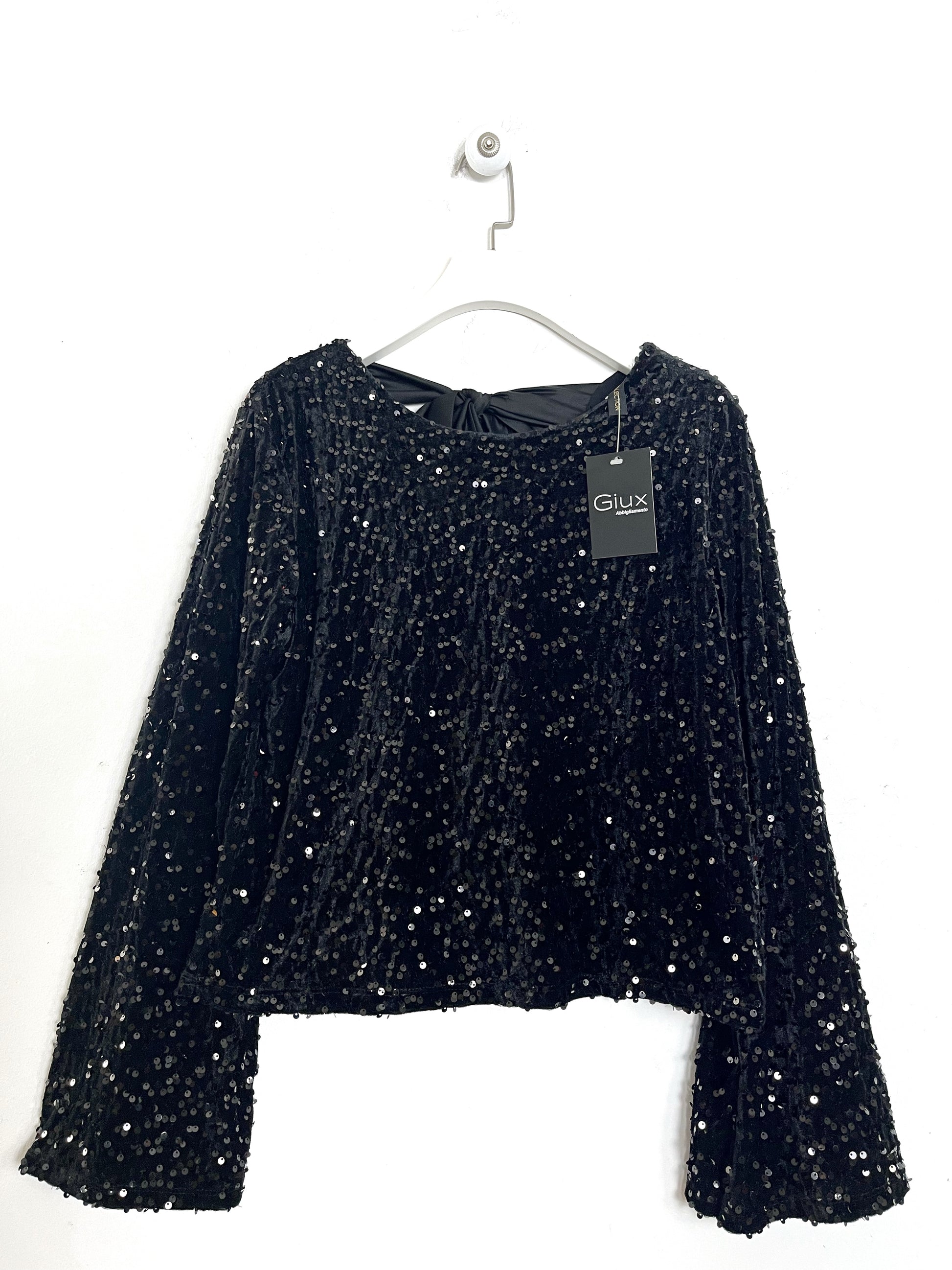 Blusa in ciniglia e paillettes girocollo. Manica lunga svasata. Chiusa dietro con un fiocco. Foderata